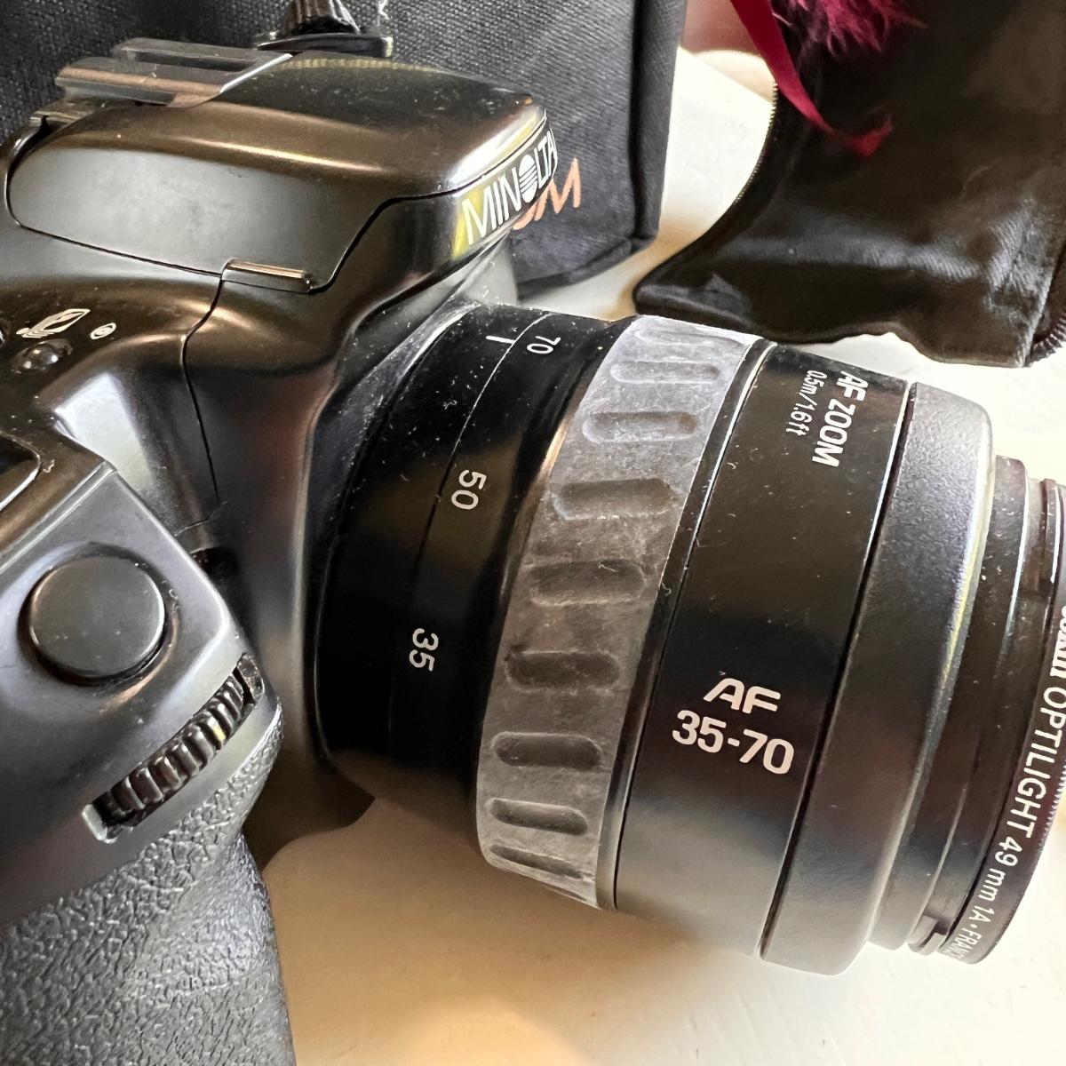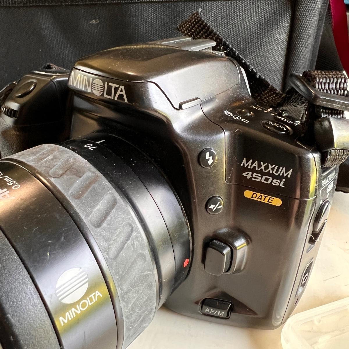 Vintage Minolta Maxxum 450SI 35MM SLR Film Camera with AF200 lens. Storage bag included. This is a 35mm film camera. Owner says its in working condition but it does need a new battery.