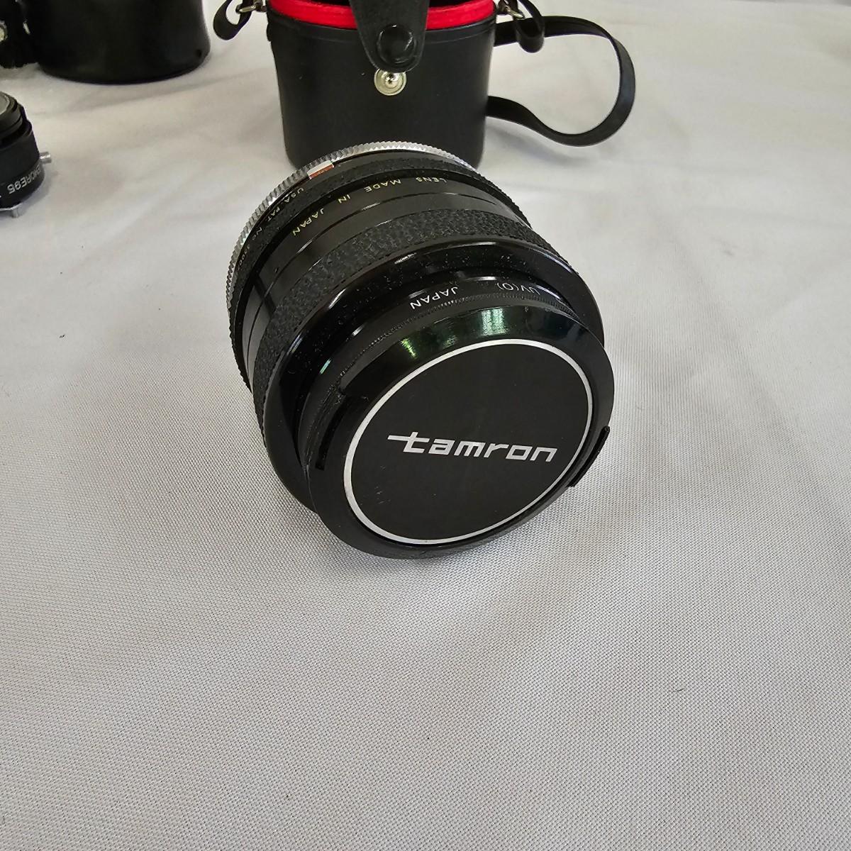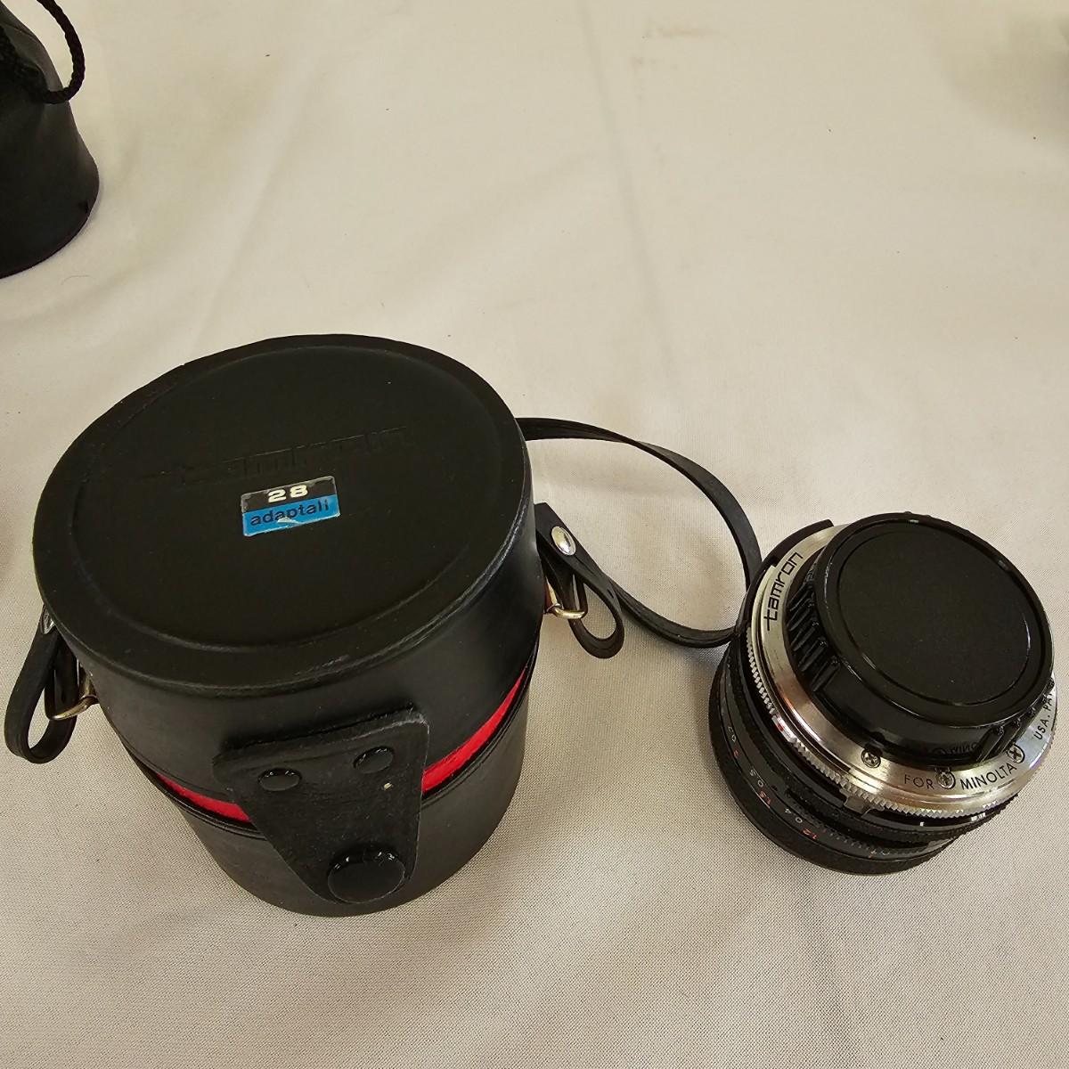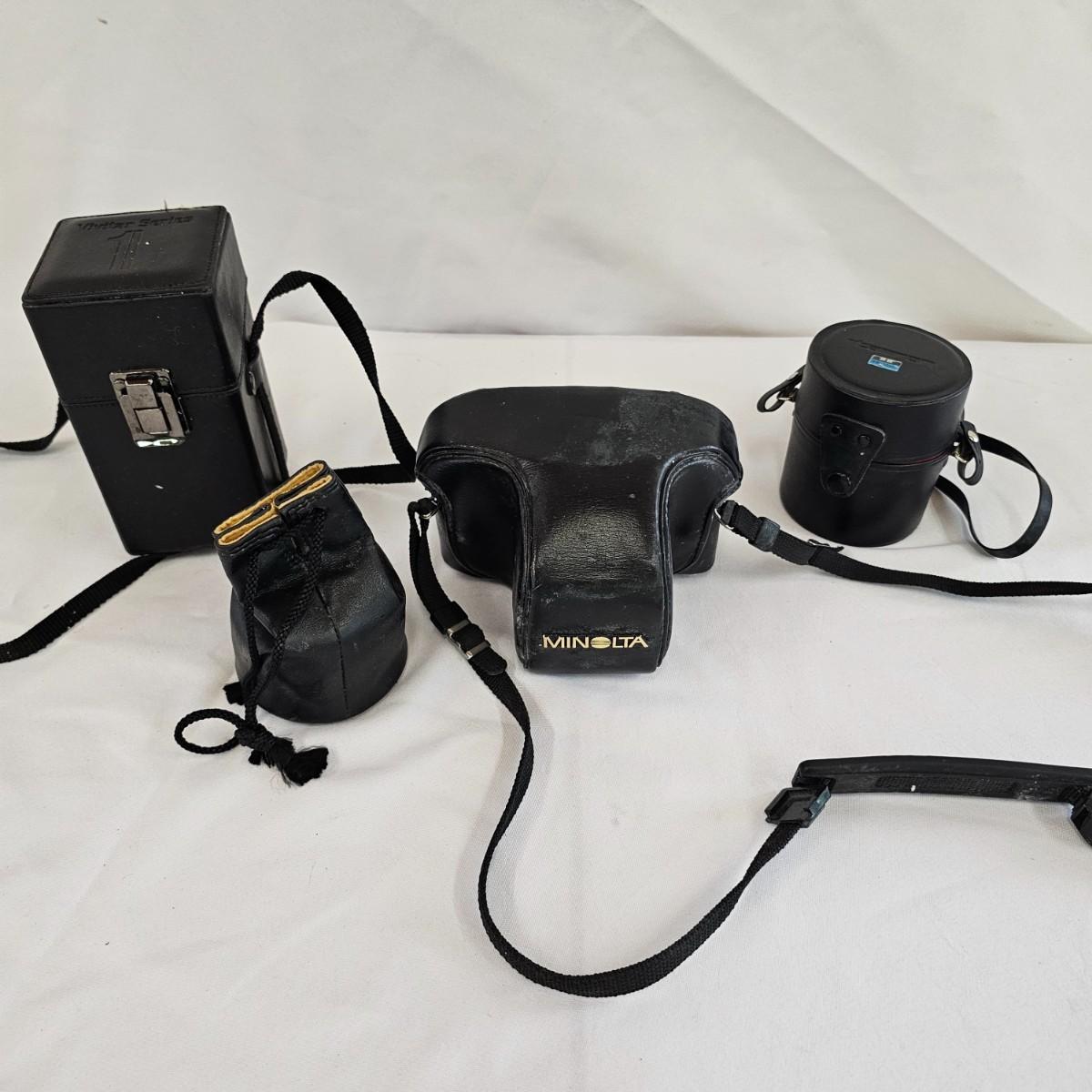 An older Minolta 35mm camera set and several extra lenses. Camera has a standard 50mm F 1:1.7 Minolta lens. Also includes a Tamron 1:2.8 f28mm closeup lens with case, a Vivitar Series II 1.28-3.8 f28-105 mm variable telephoto with case. Also includes a Komura Telemore95 II teleconverter, and case. See photos for details. Shipping available.
