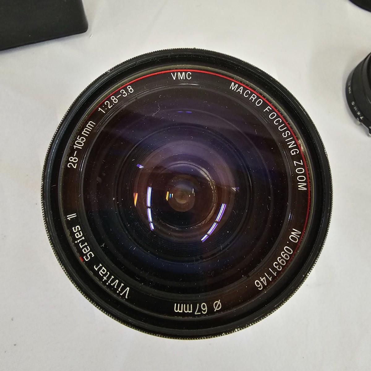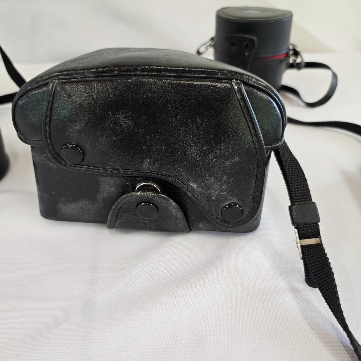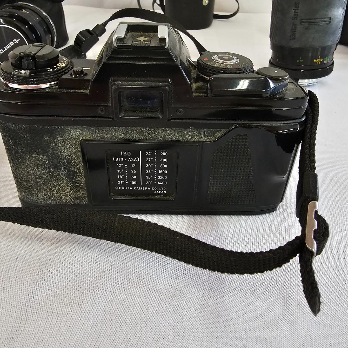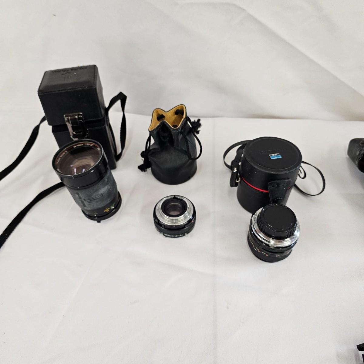 An older Minolta 35mm camera set and several extra lenses. Camera has a standard 50mm F 1:1.7 Minolta lens. Also includes a Tamron 1:2.8 f28mm closeup lens with case, a Vivitar Series II 1.28-3.8 f28-105 mm variable telephoto with case. Also includes a Komura Telemore95 II teleconverter, and case. See photos for details. Shipping available.