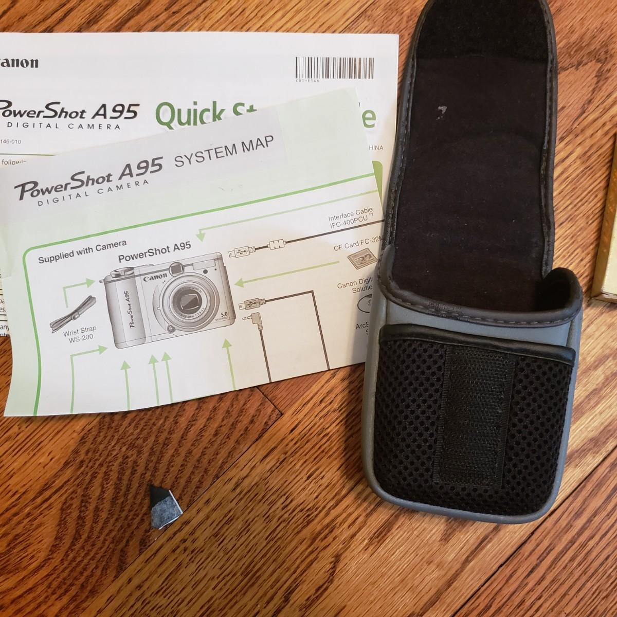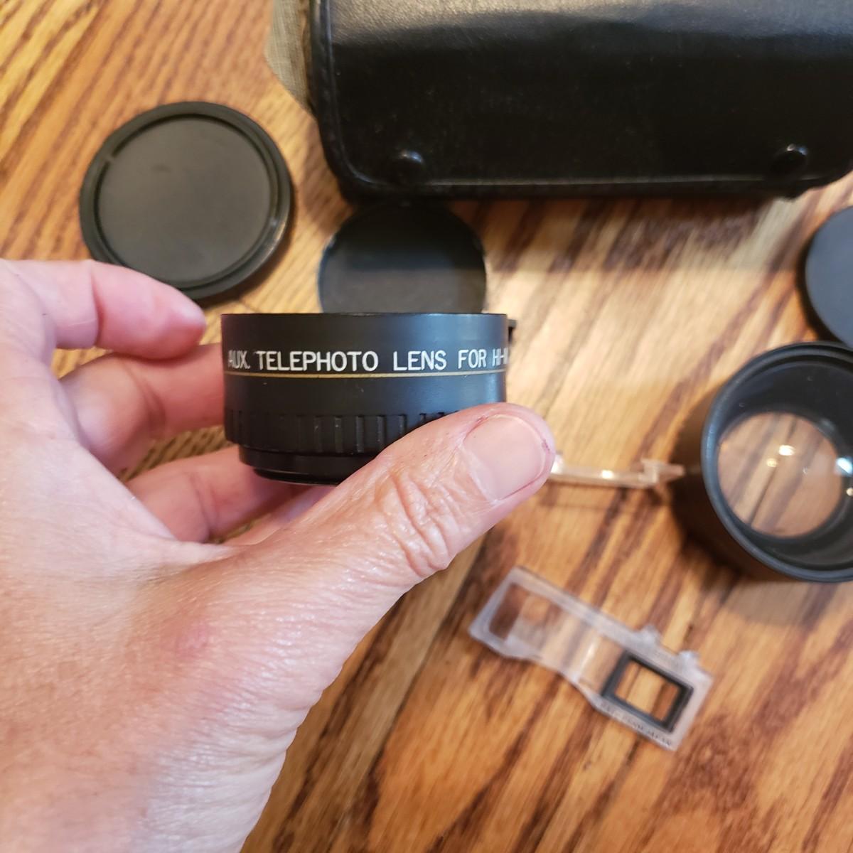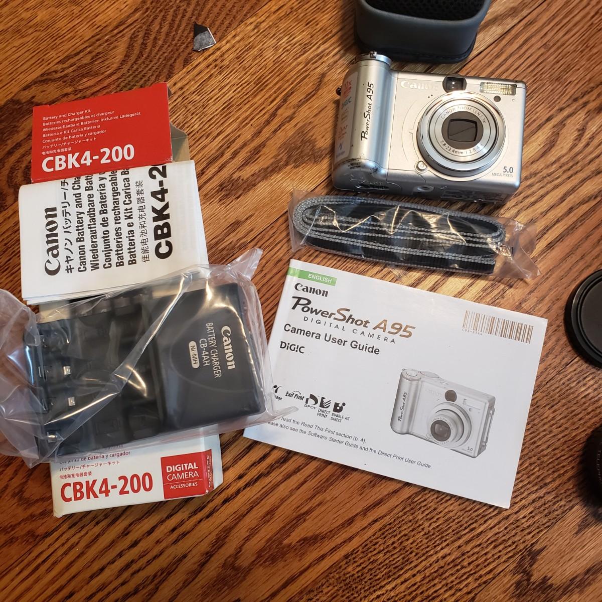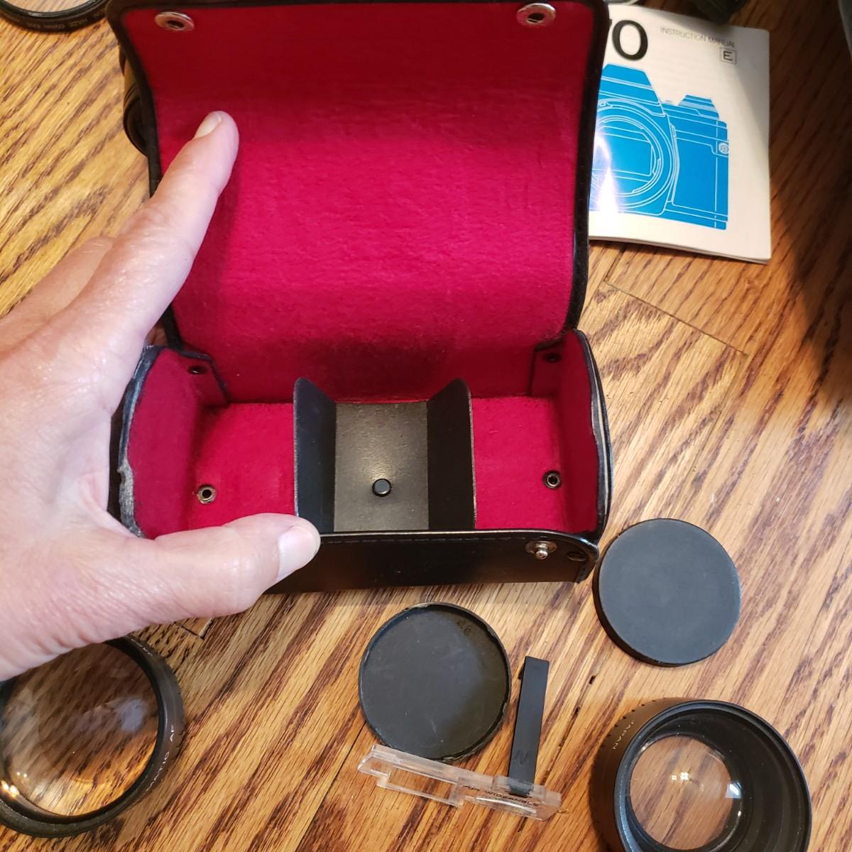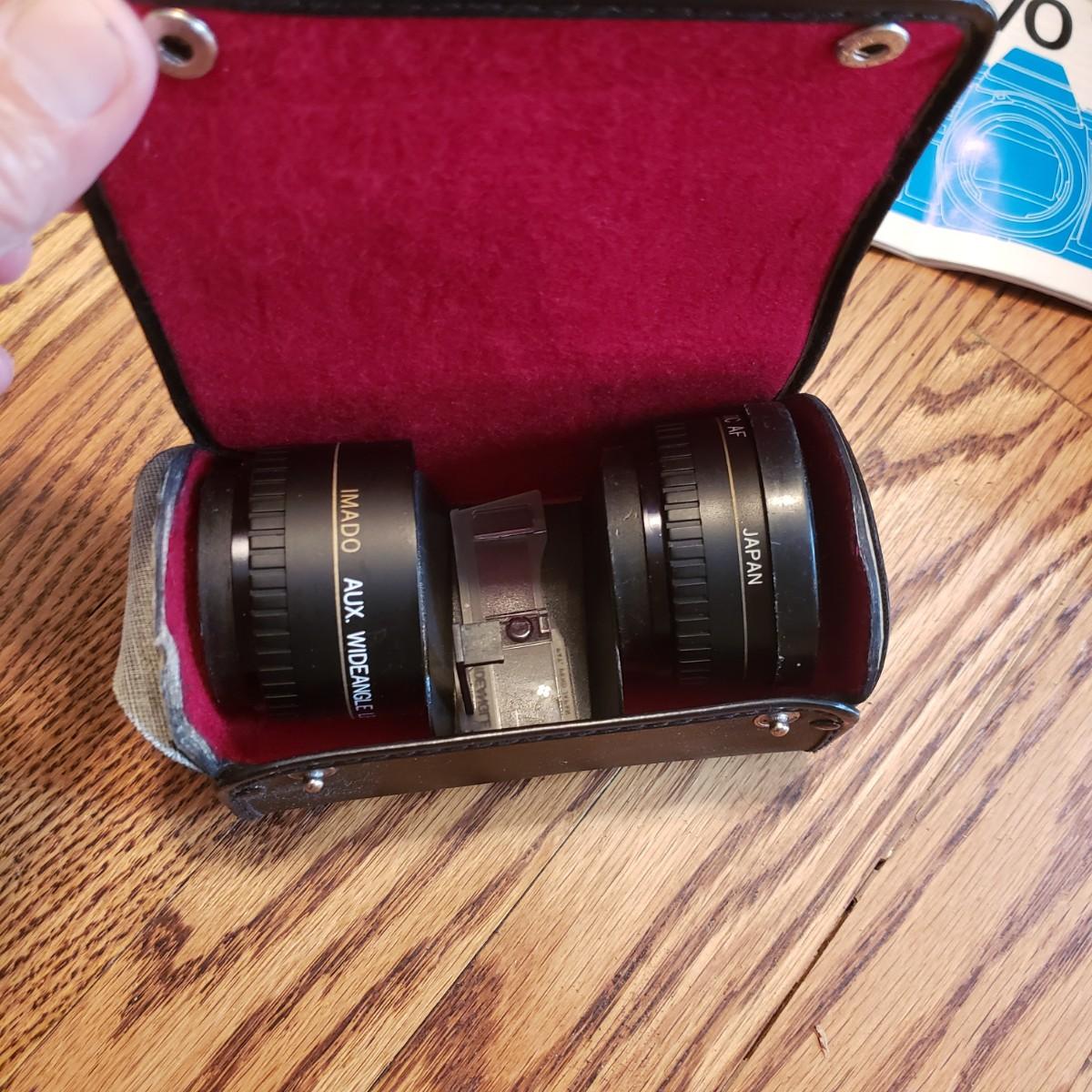 This lot contains a Canon Powershot A95 digital camera, with a battery charger, direction manual, strap and case. The camera needs new batteries to see if it will power on. The Minolta X-370 is a 35mm camera. It includes a Sigma zoom lens, see pictures for lens details. Also included are 3 rolls of film. Direction manual, filters and a carrying case. Finally. Is a case with two Imado brand lenses, one is a wide angle and the other is a telephoto lens. See pictures for more details.