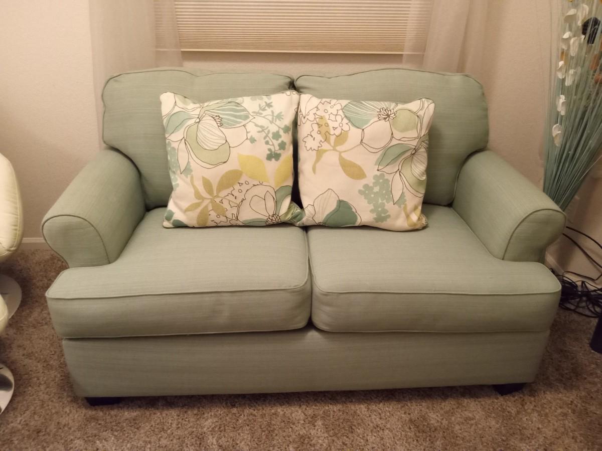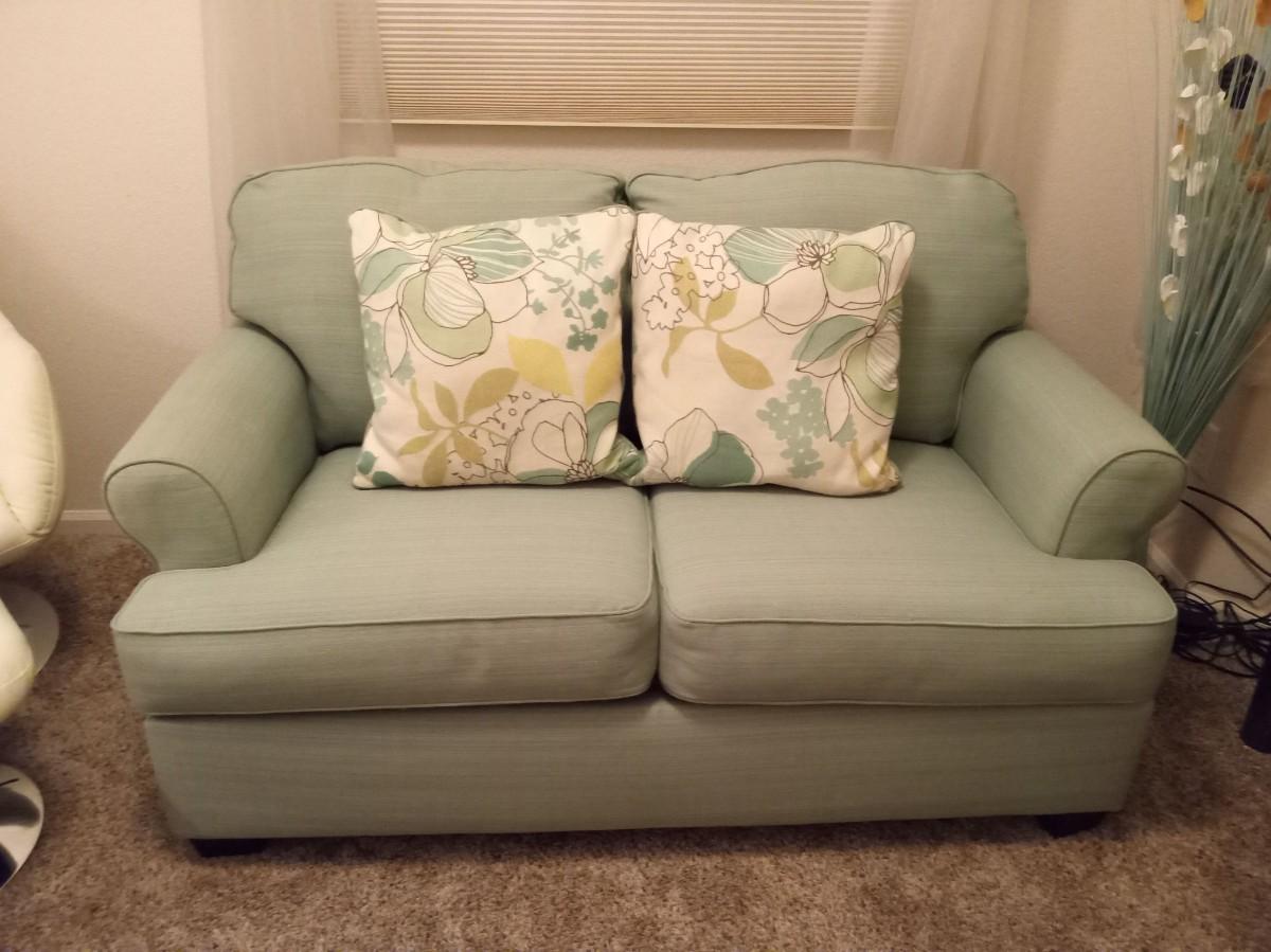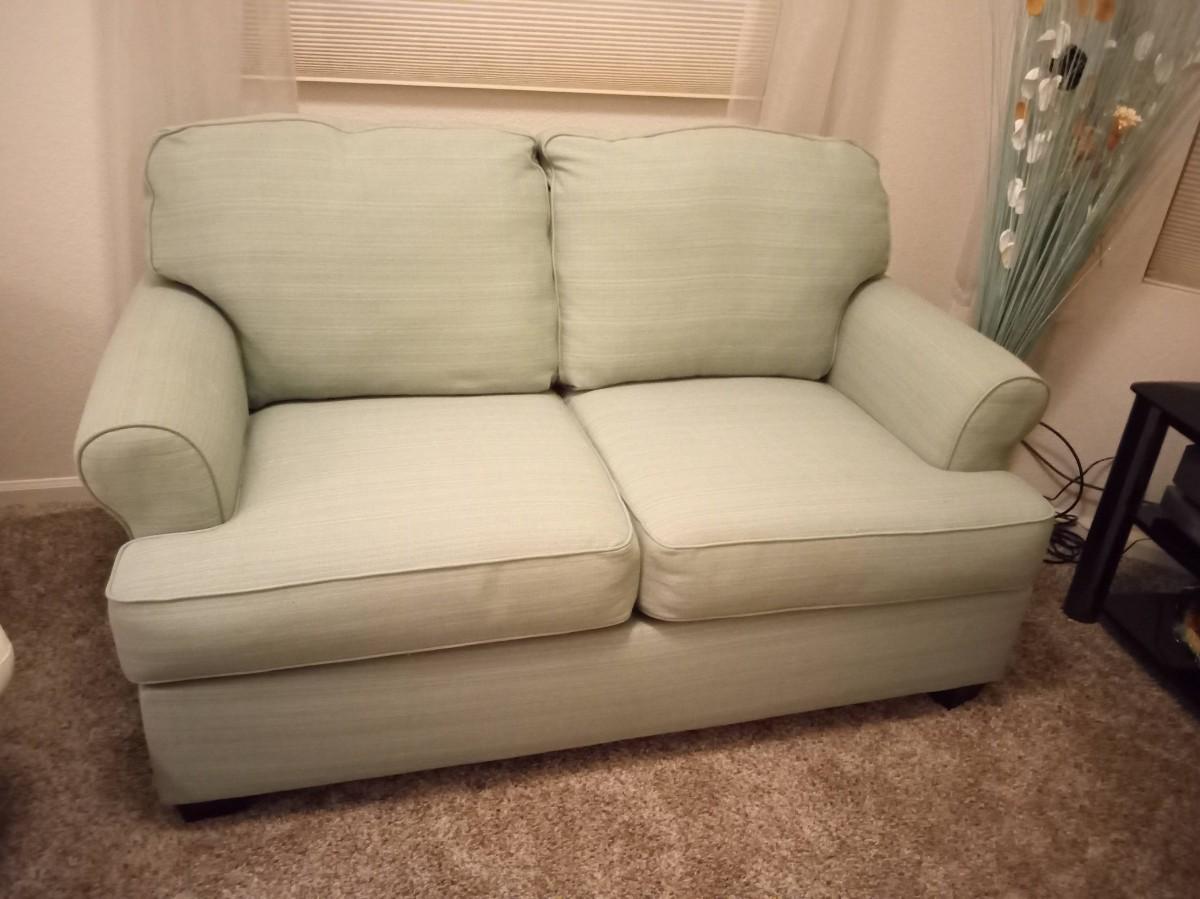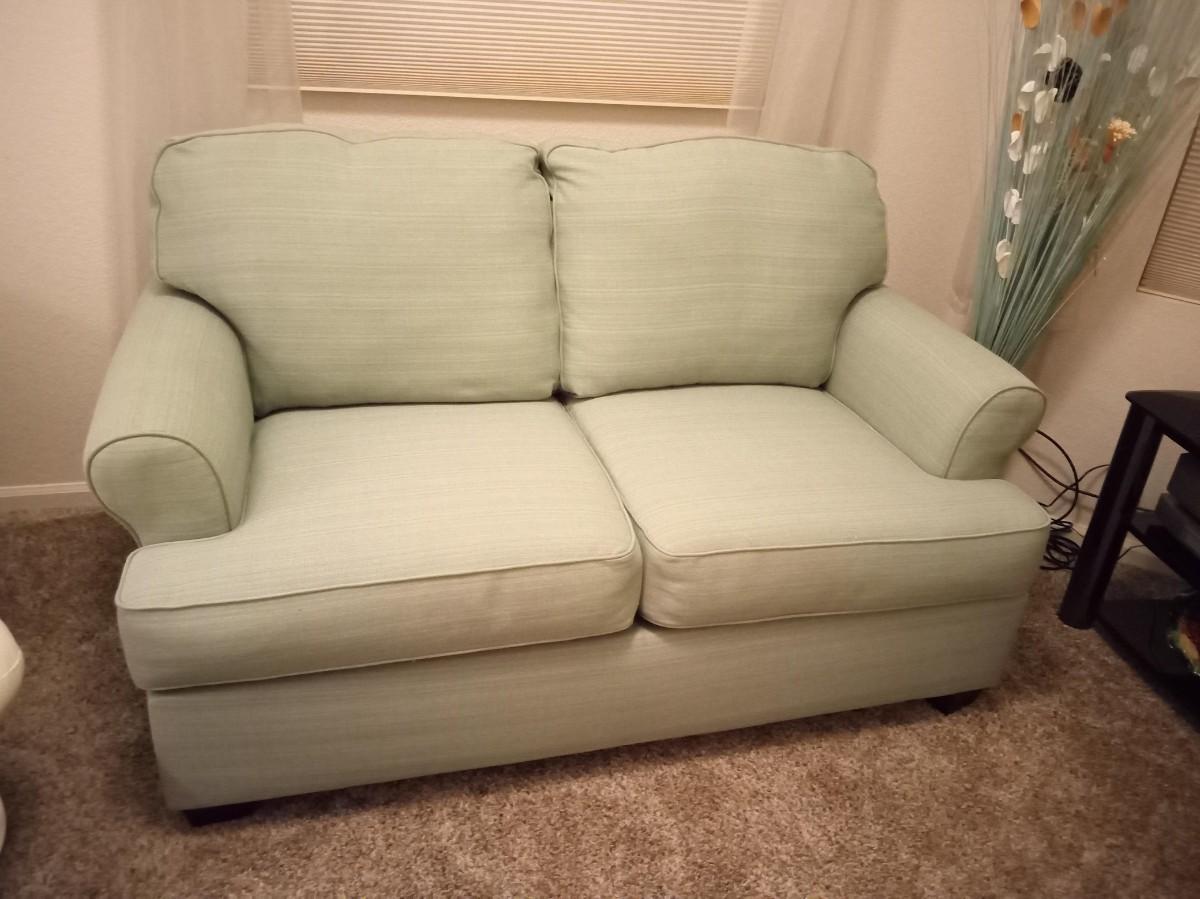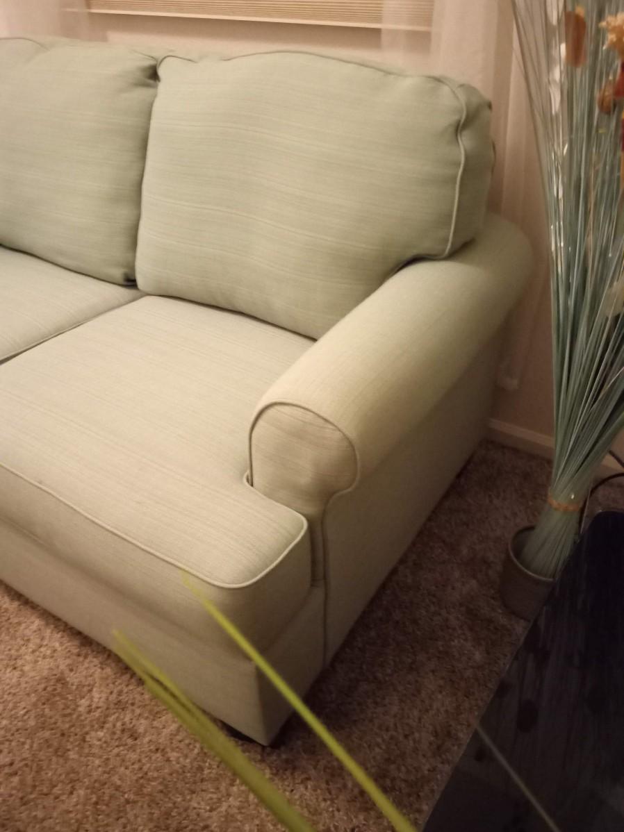 59" X 36" VERY GOOD CONDITION, THE CUSHIONS ARE SLIP COVERED FOR EASY CLEANING IN THE FUTURE