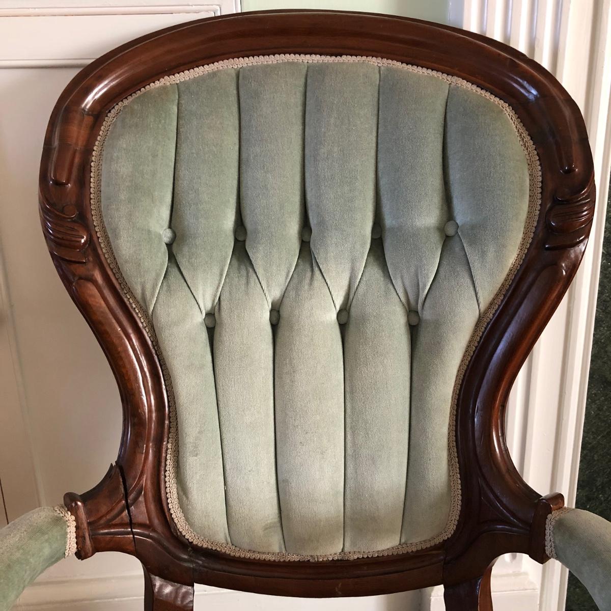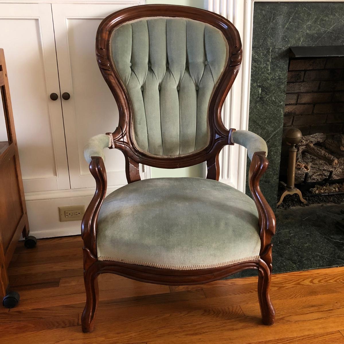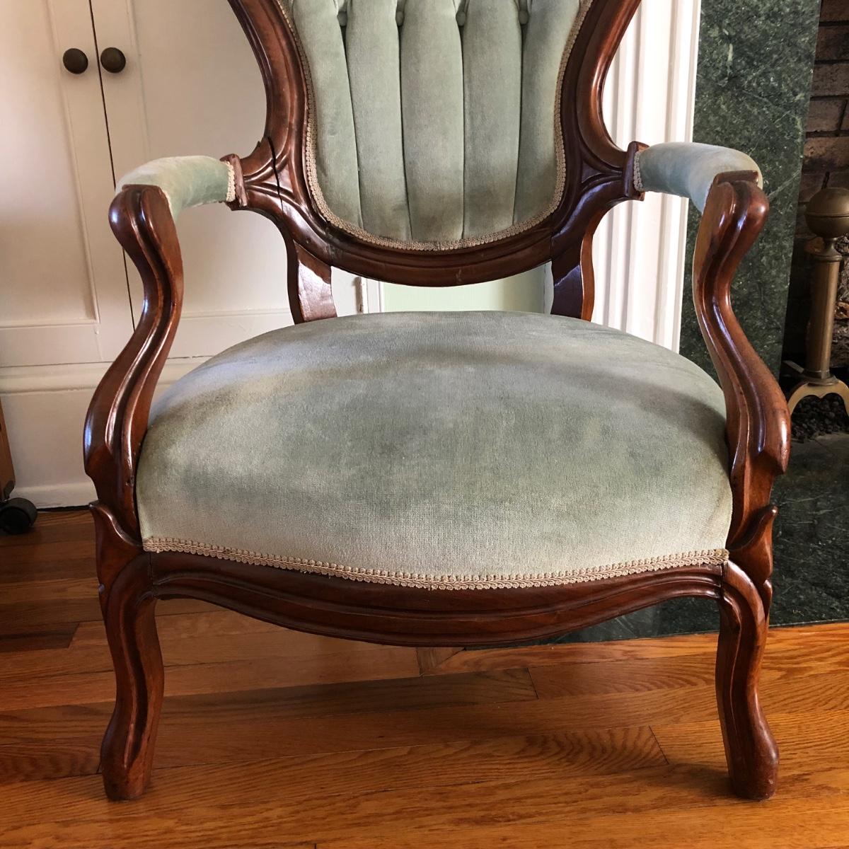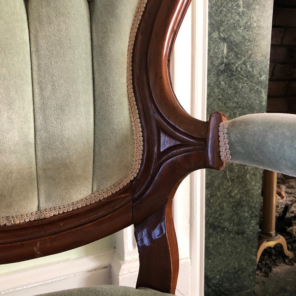 This mint green Victorian chair is velvet with a wooden frame with carved details. The chair measures 2' 1.5" x 3' 3.5" x 2' 10".