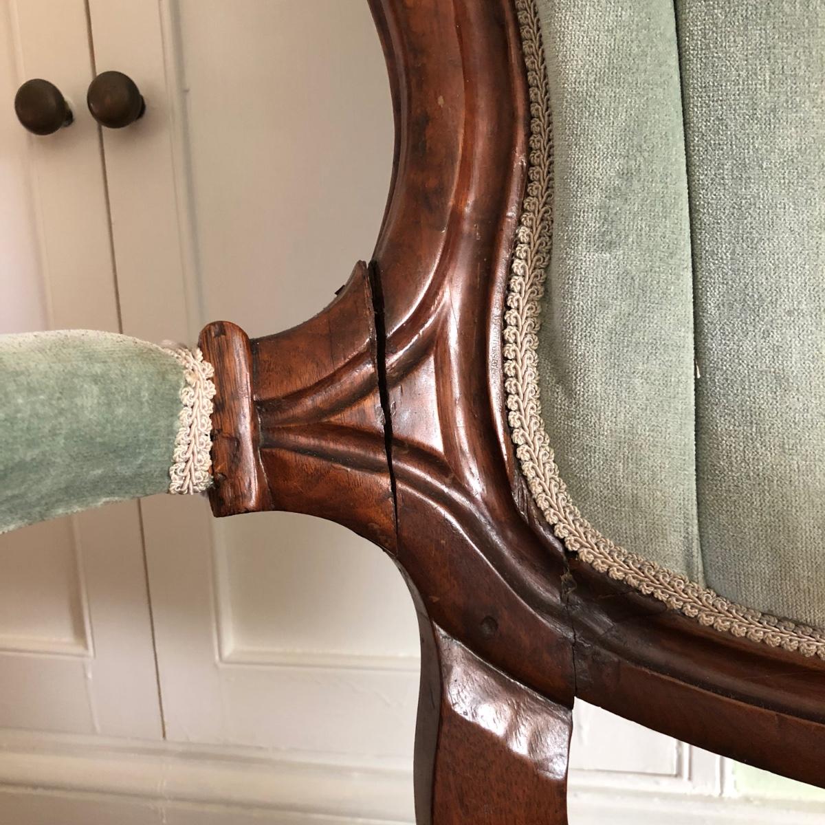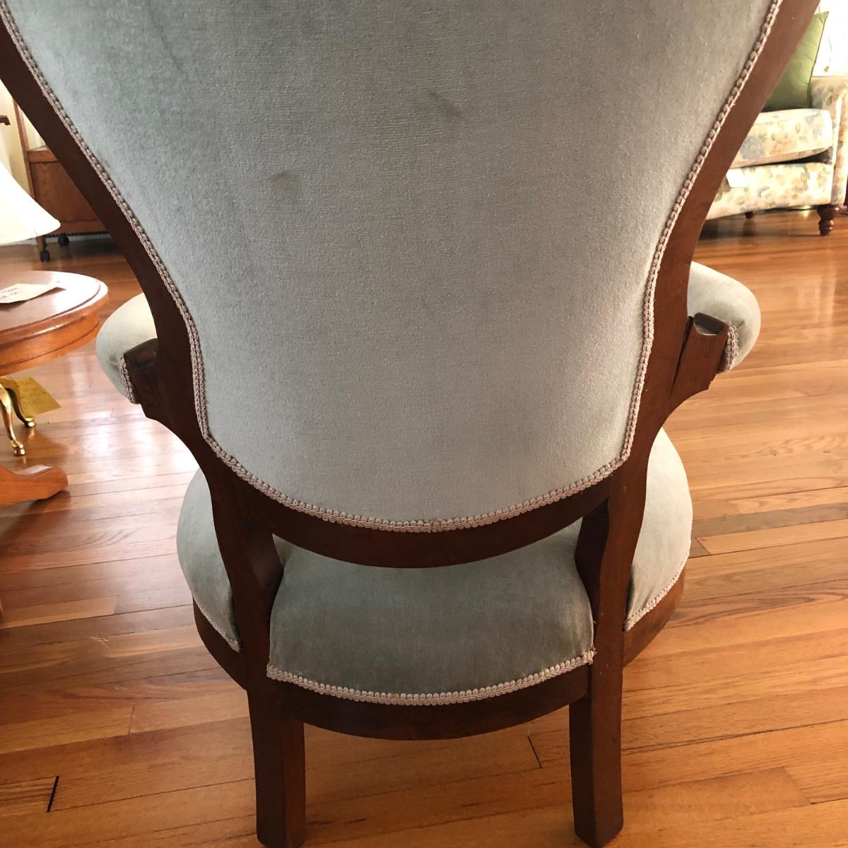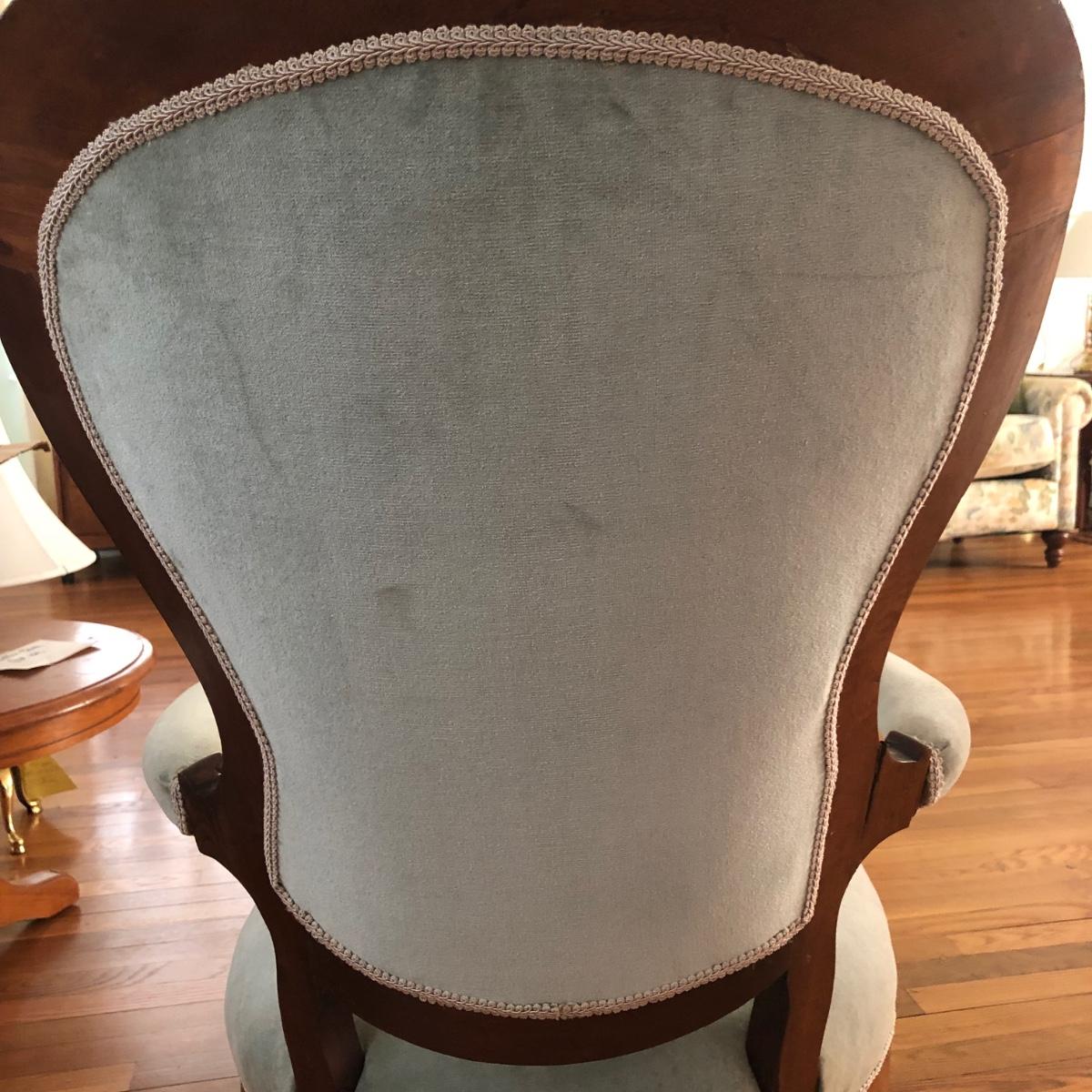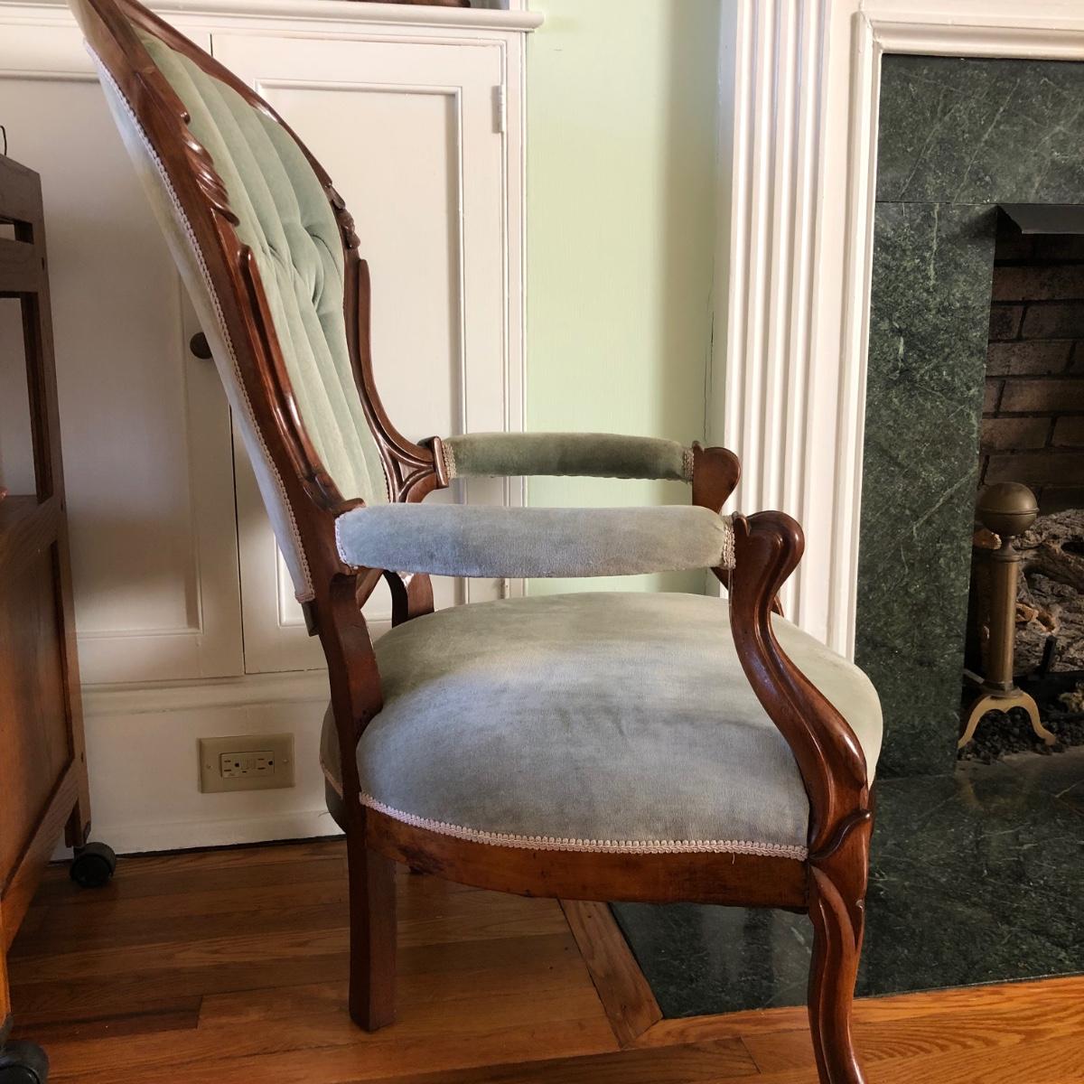 This mint green Victorian chair is velvet with a wooden frame with carved details. The chair measures 2' 1.5" x 3' 3.5" x 2' 10".