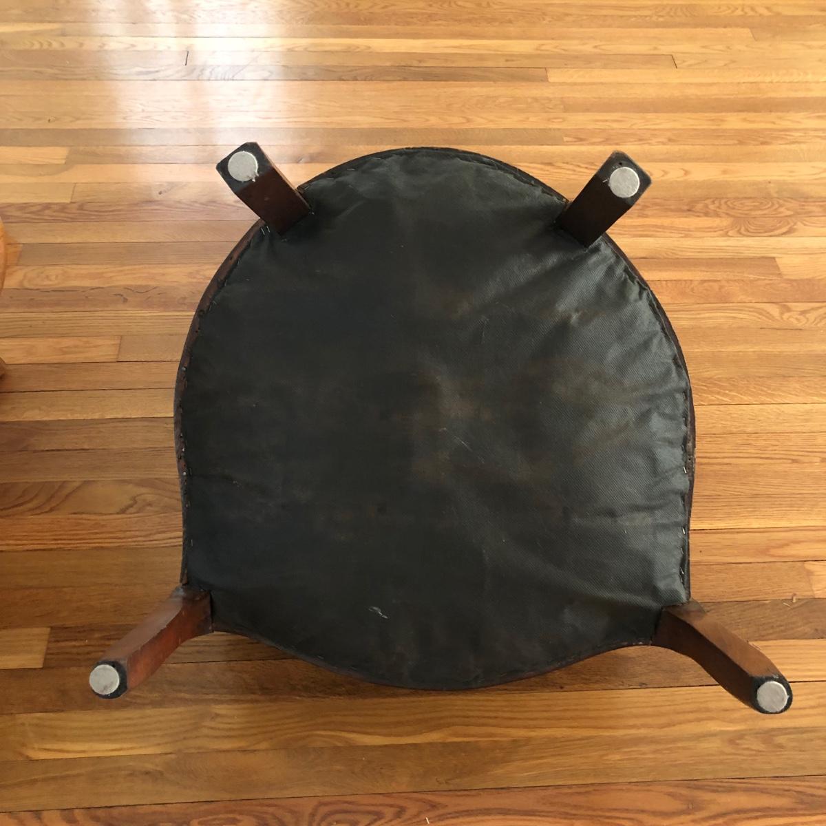 The seat is at 1' 2.5". There is no noticeable smell and the velvet is in good condition. The wooden seam has come apart on one of the arms. Local pickup only.