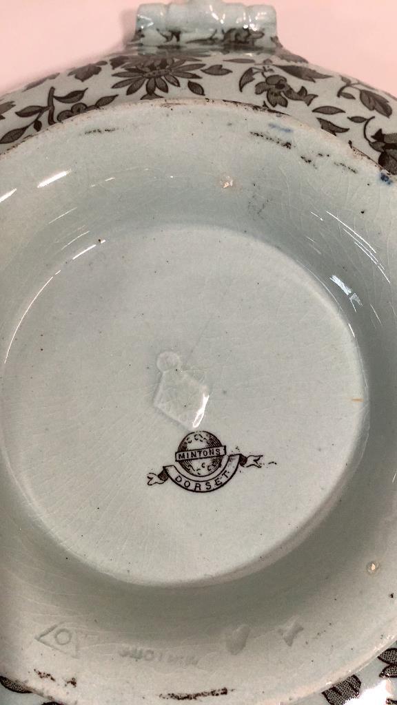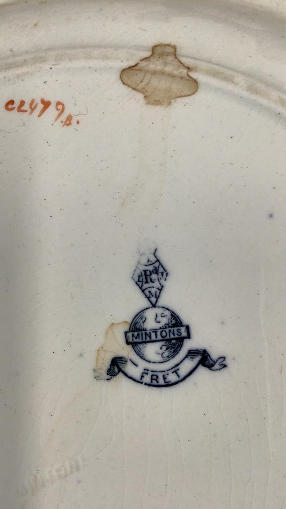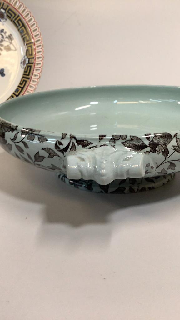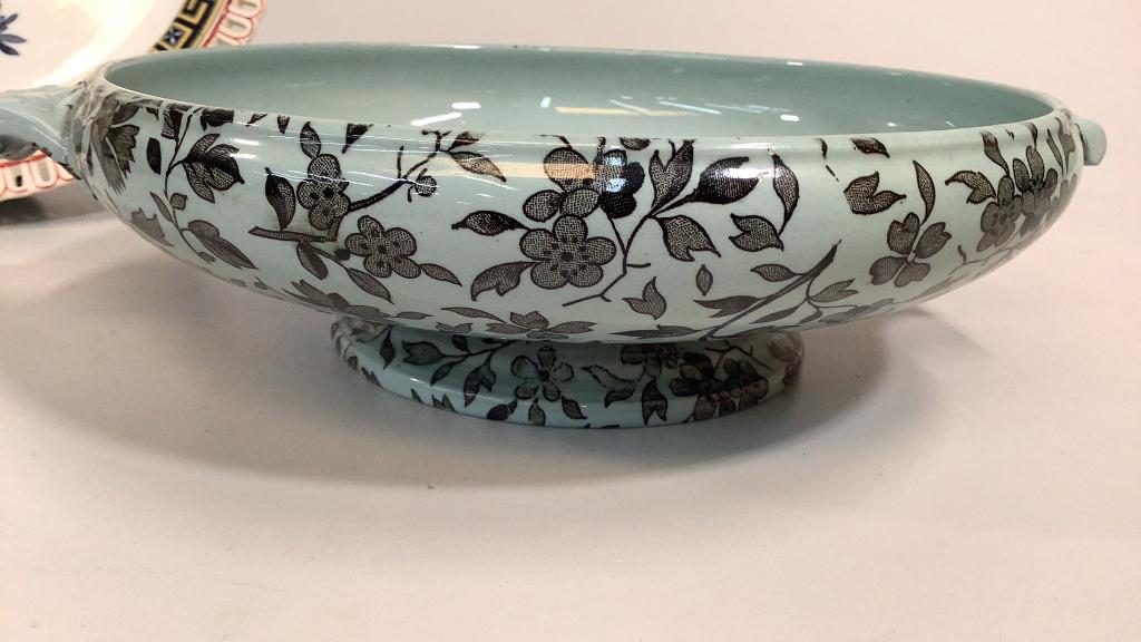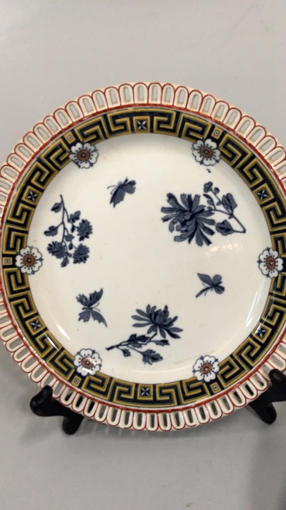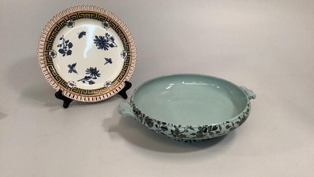 11 inch open bowl in unusual color combination..pattern is DorsetÂ…black on teal groundÂ…9 inch Reticulated plate in Fret pattern, blue, with red tracings aroun rimÂ…