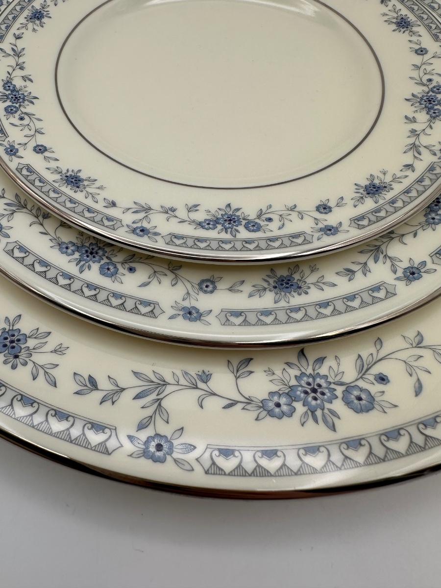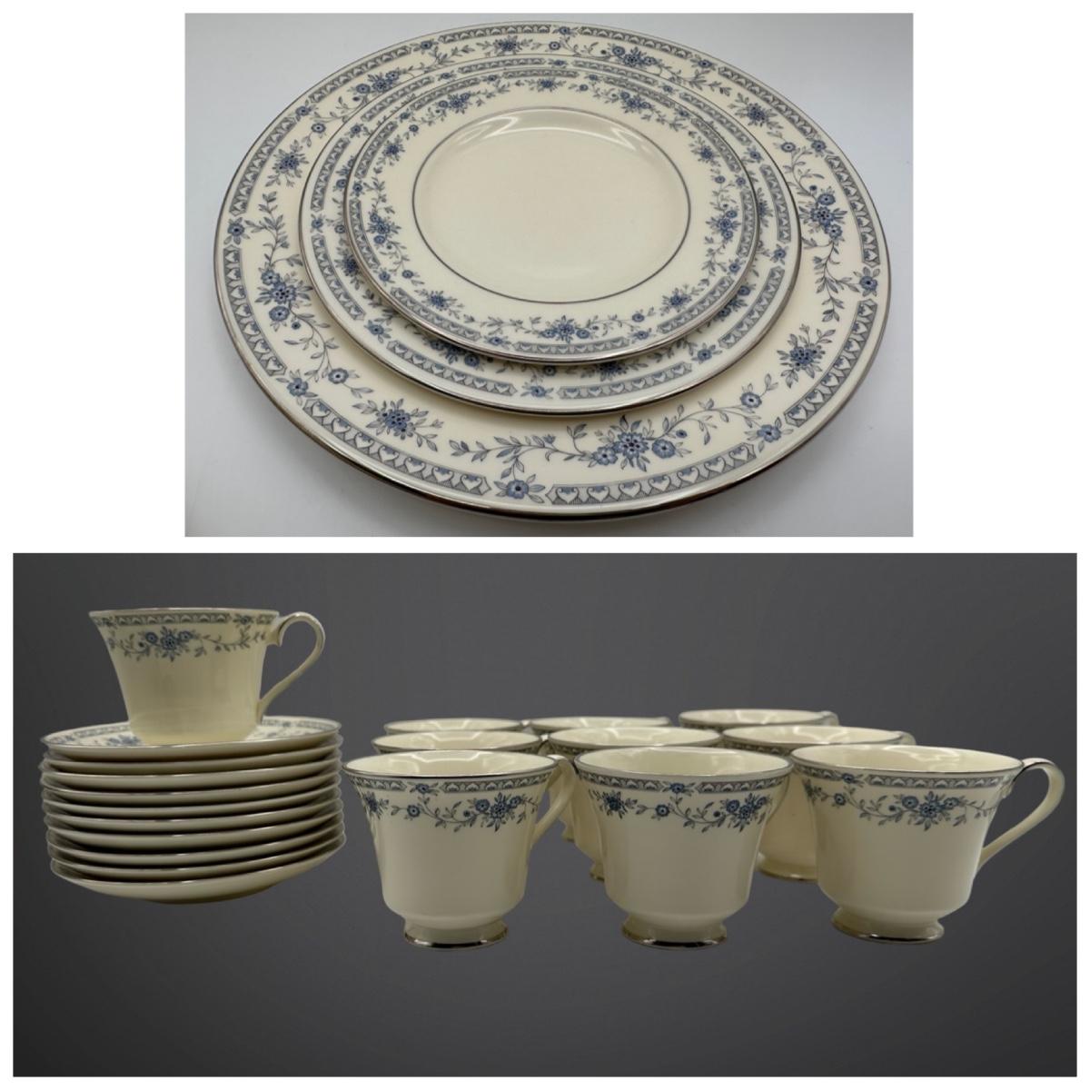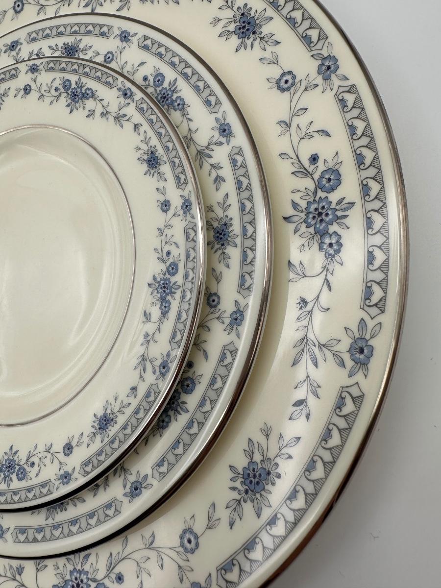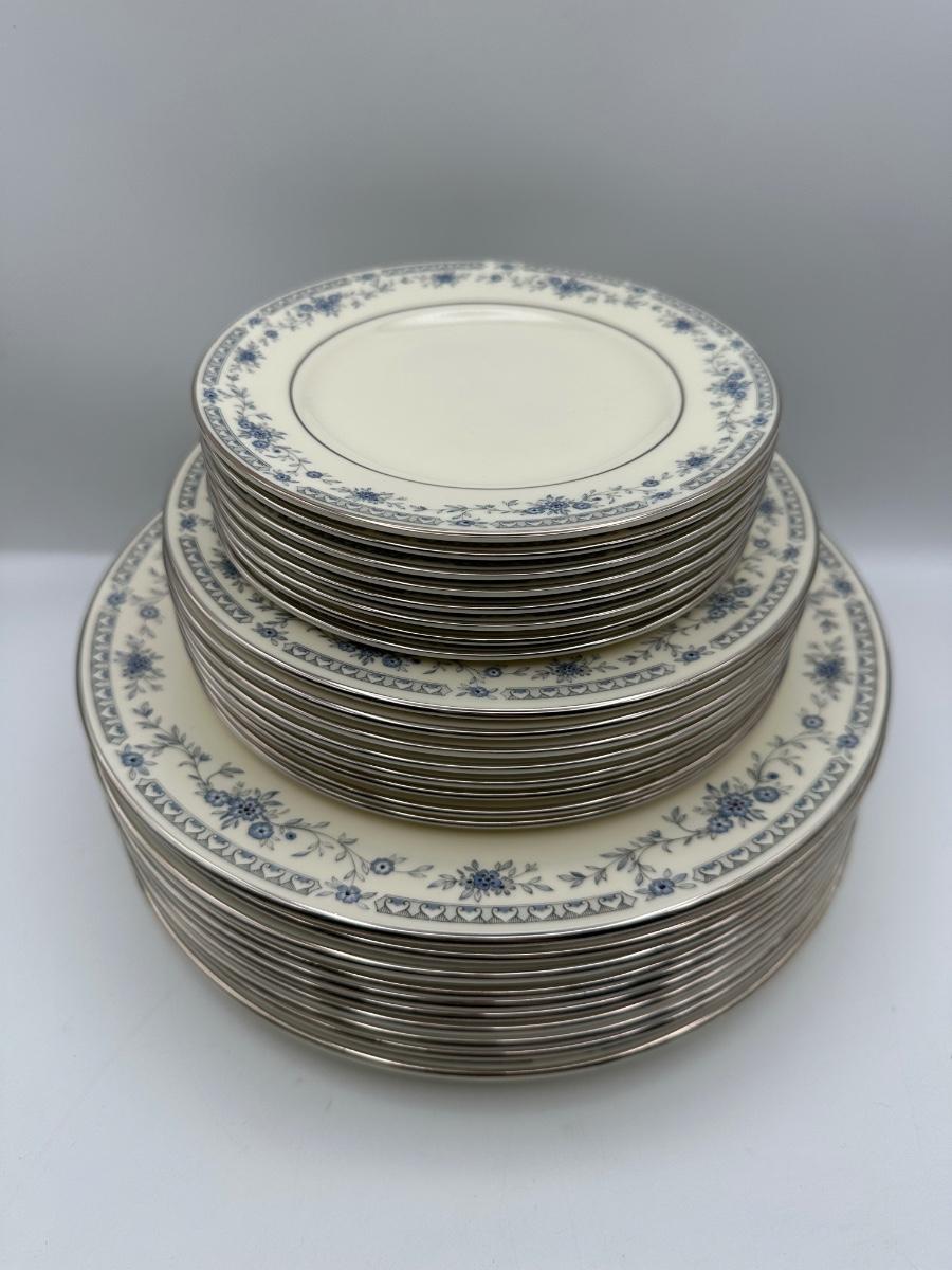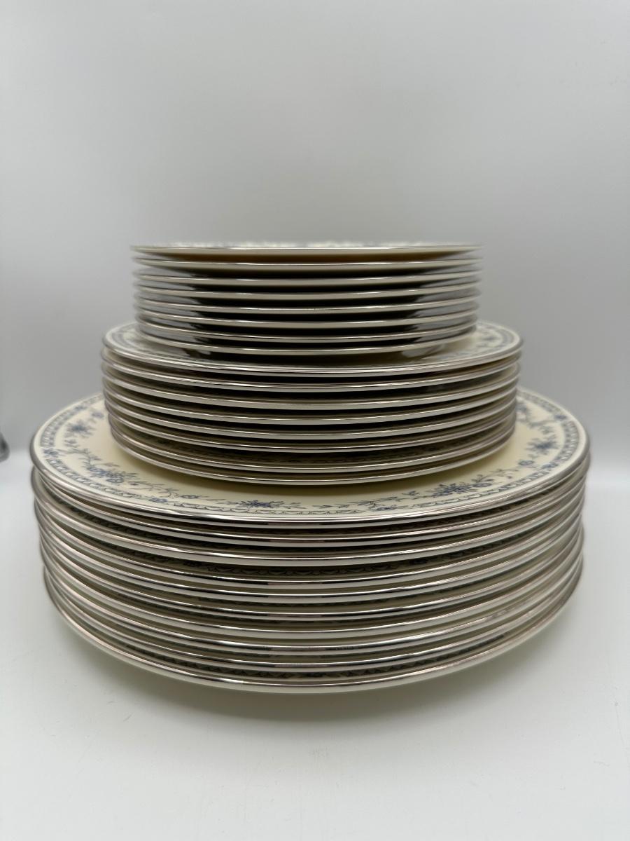 Minton Fine China Dinnerware Service – Blue Floral with Silver Trim, Complete Set of Plates, Cups & Serving Pieces