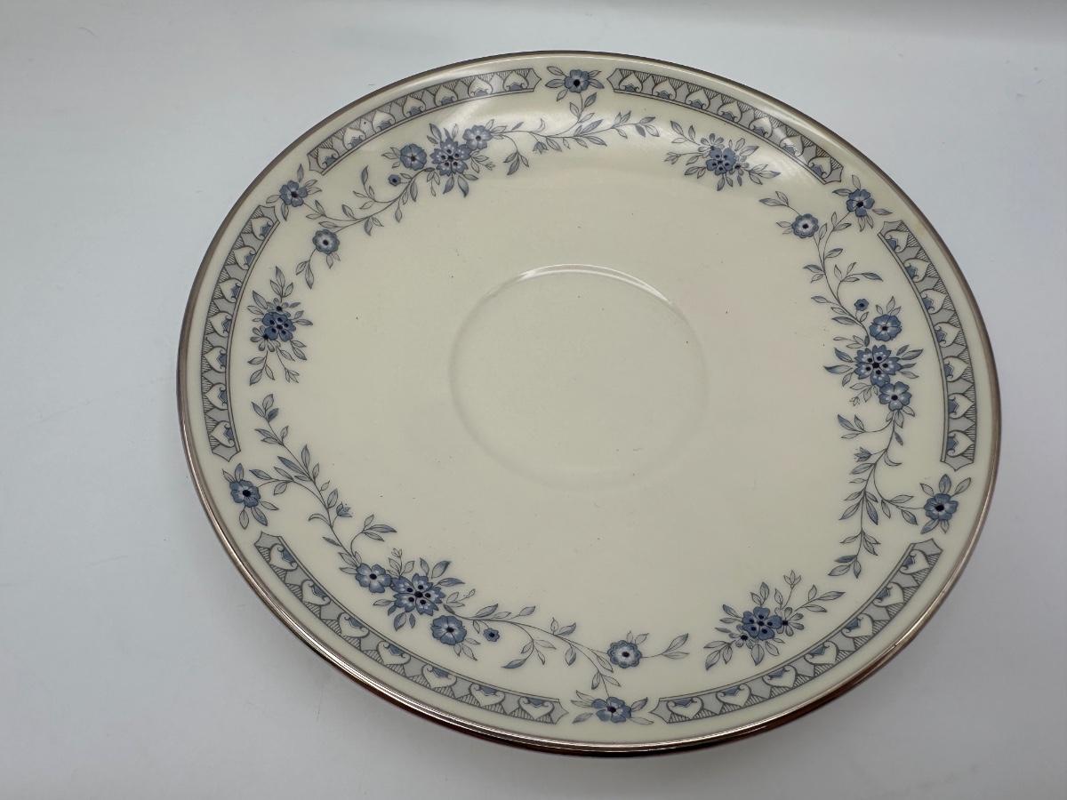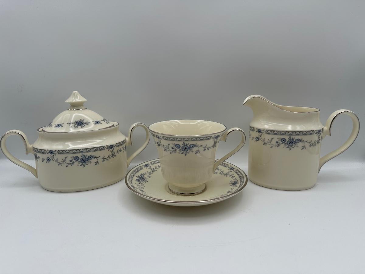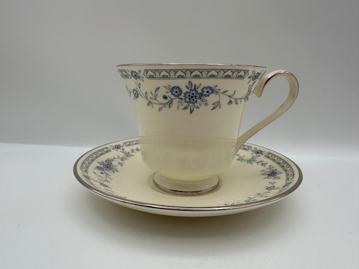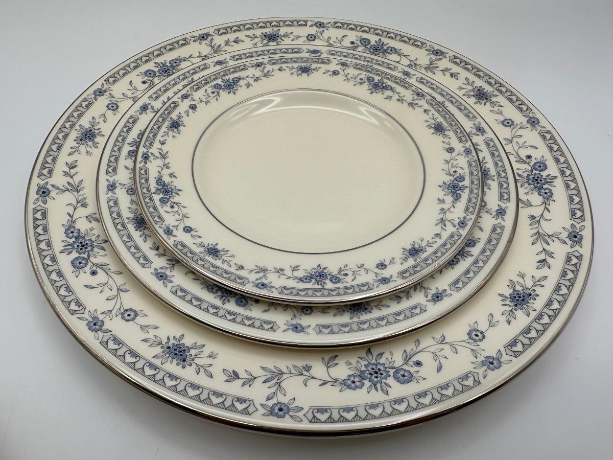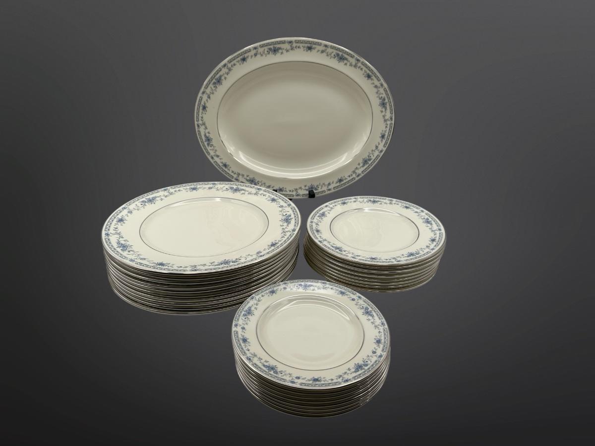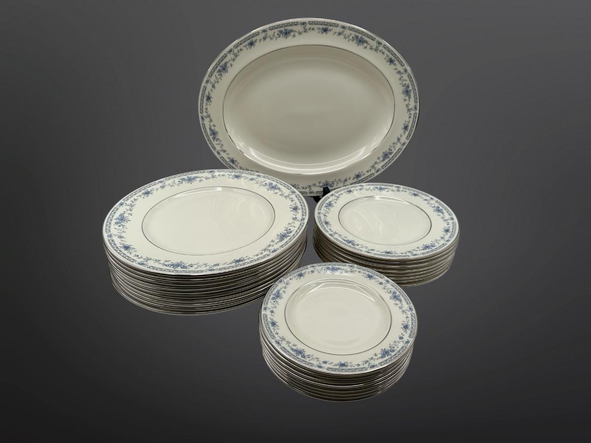 Minton Fine China Dinnerware Service – Blue Floral with Silver Trim, Complete Set of Plates, Cups & Serving Pieces