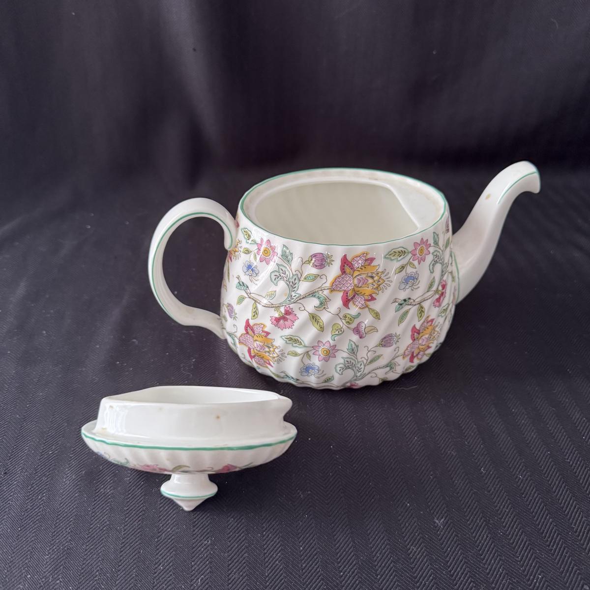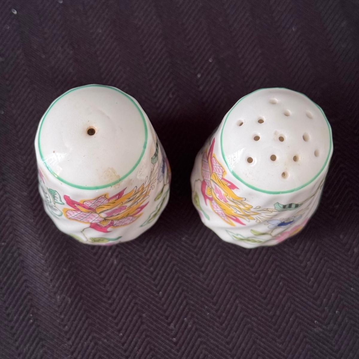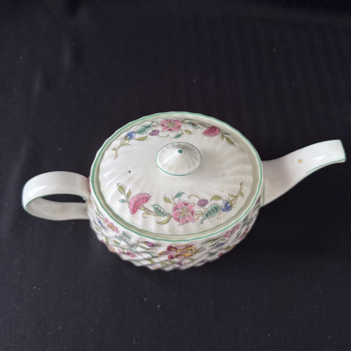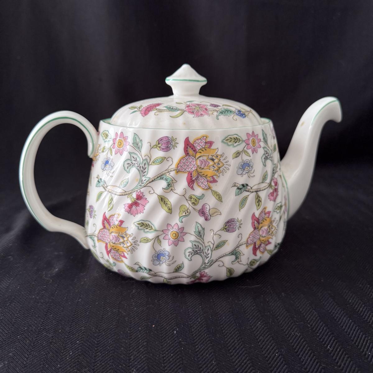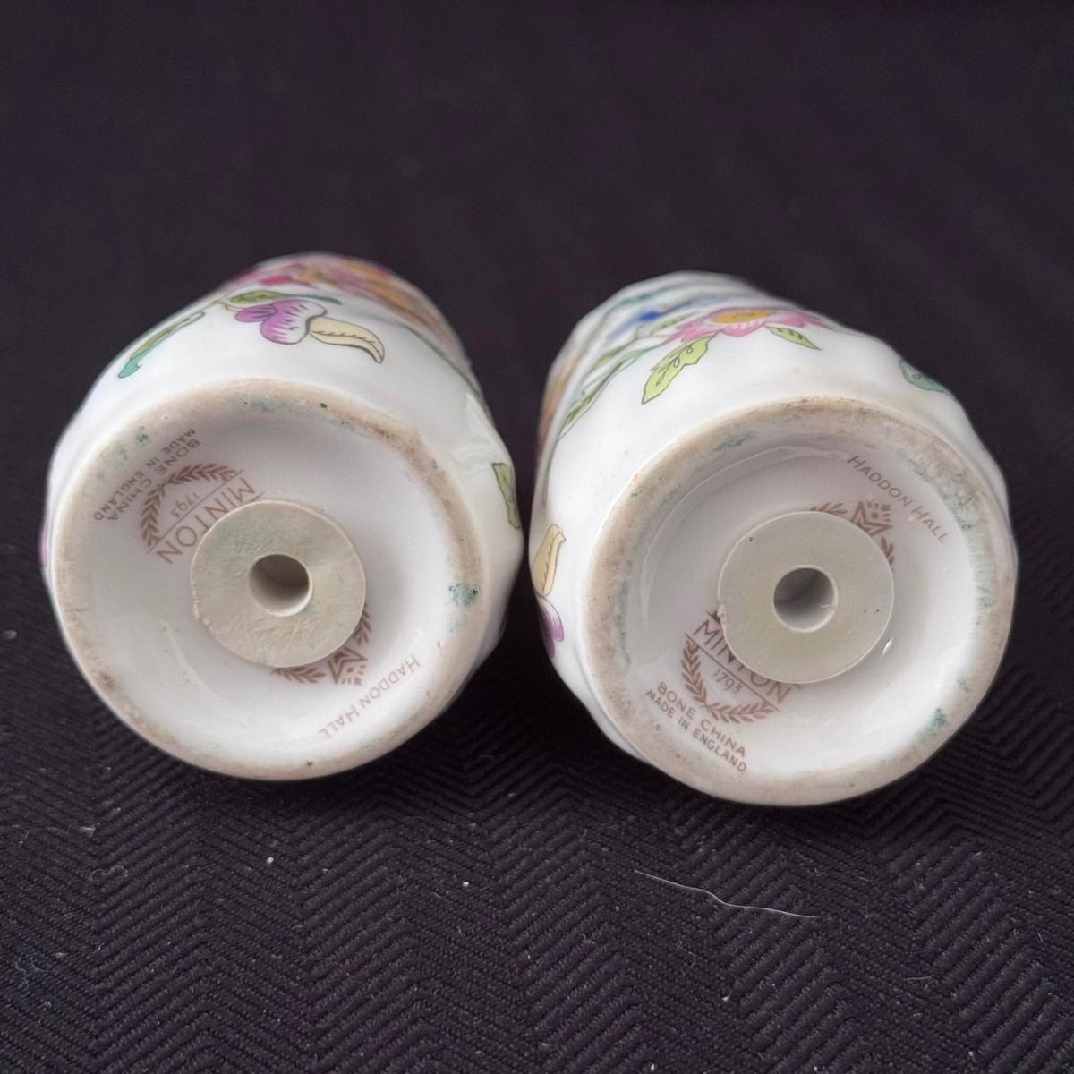 This lot of Minton china includes a set of salt and pepper shakers, one teapot with lid (9" x 4" x 6"H), one small bowl, and one salad plate. All pieces are a part of the Haddon Hall pattern, made of porcelain, and are stamped on the bottom. The salt and pepper shakers come with plugs. Shipping available.
