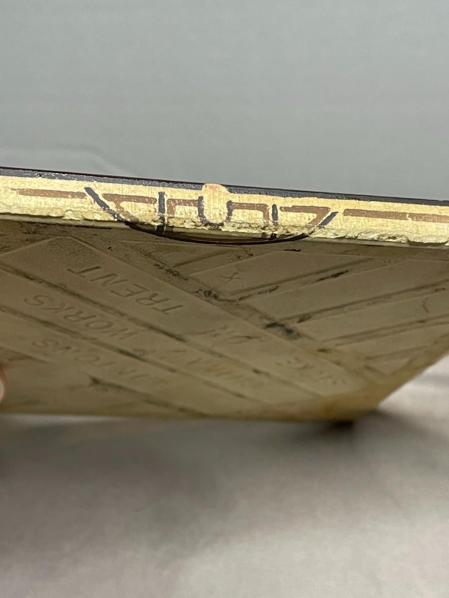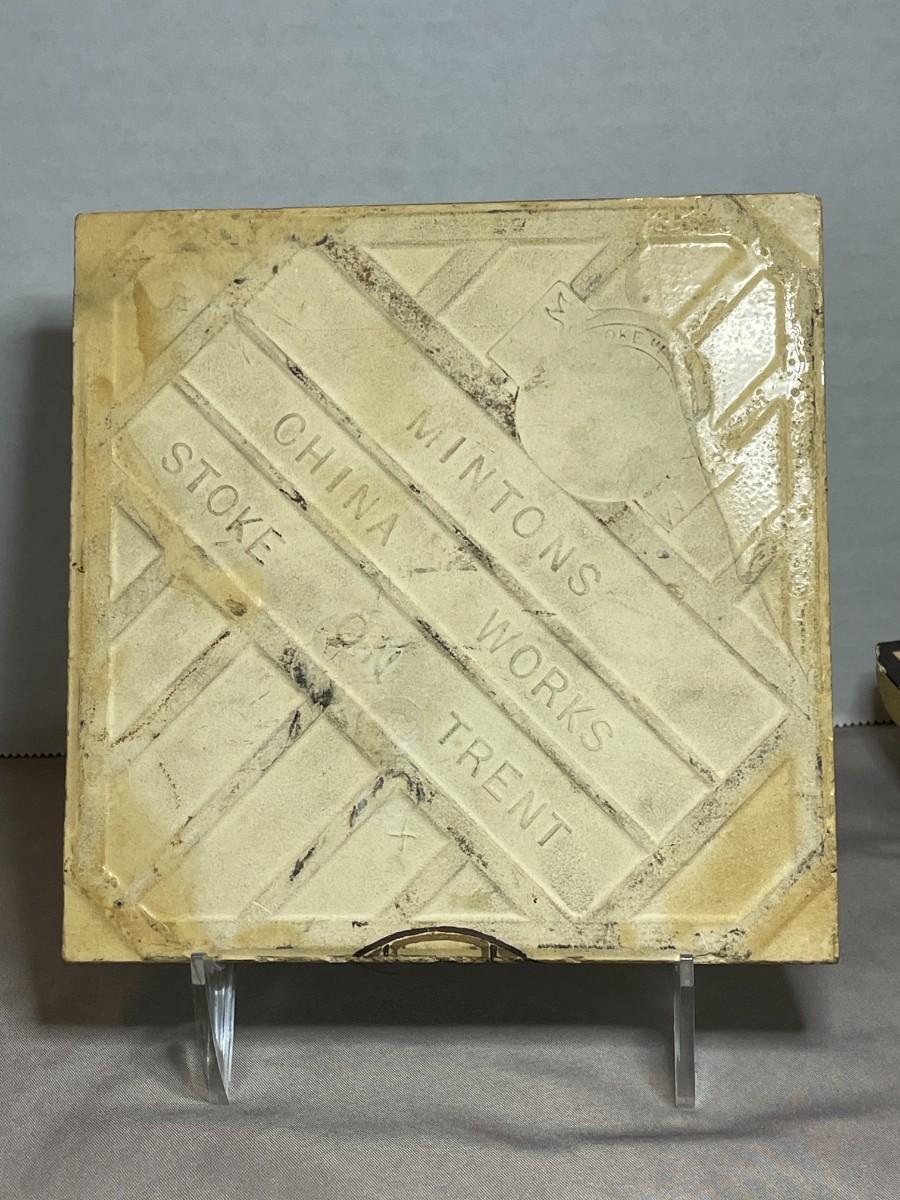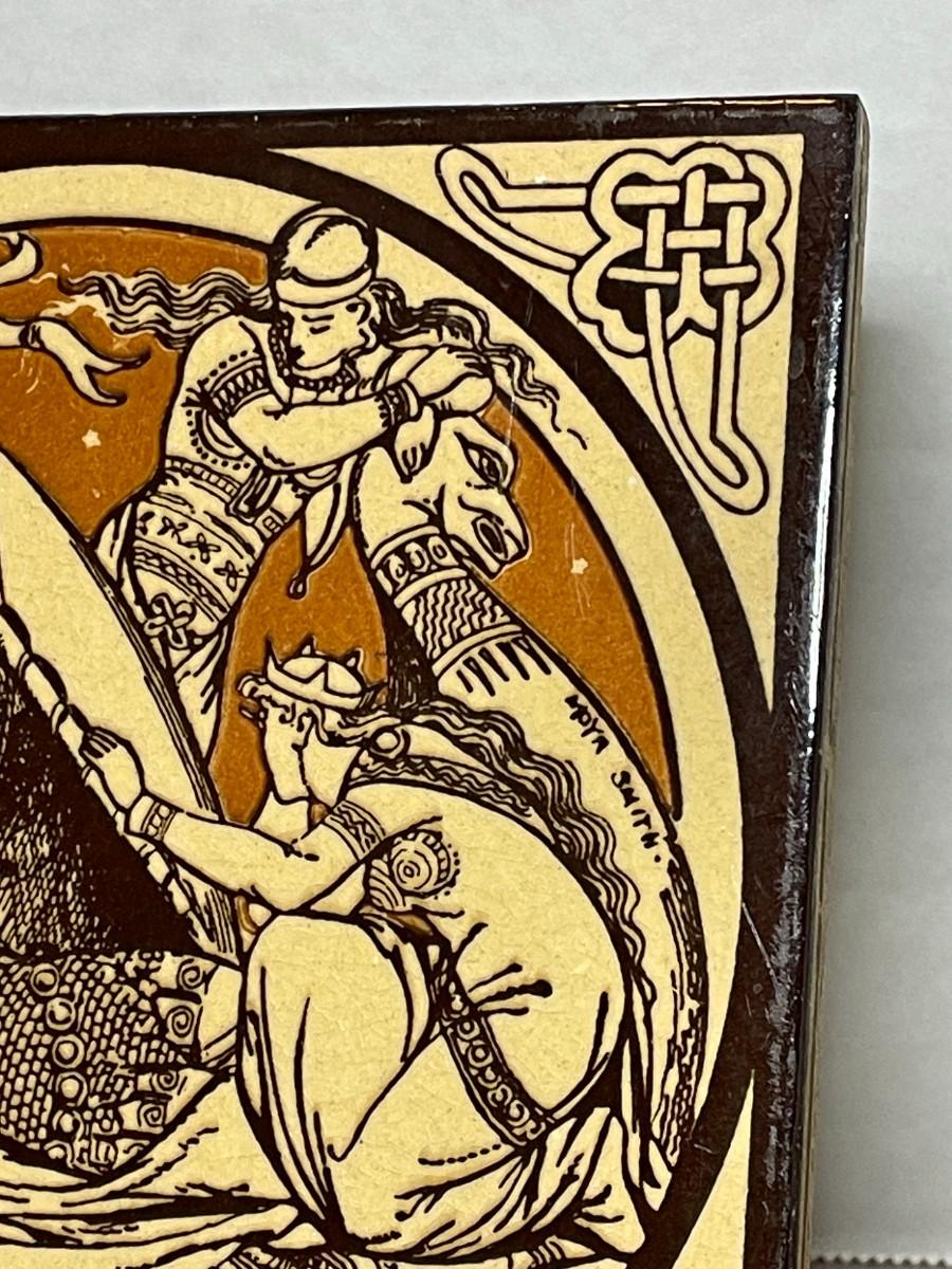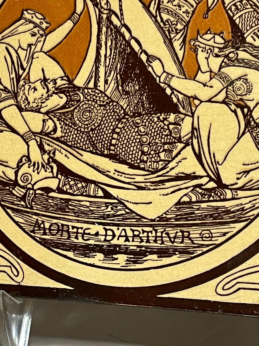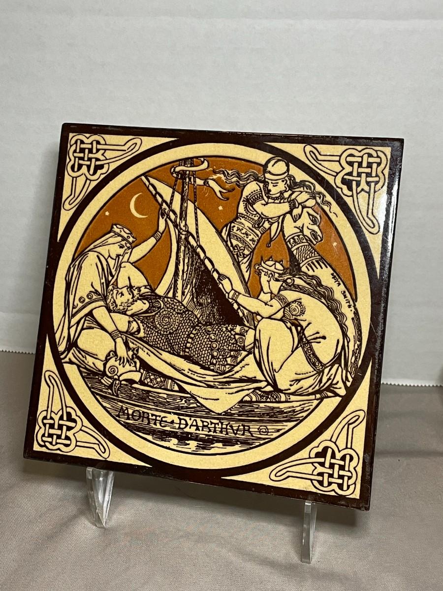 Not a mistake - this is a duplicate of Lot 20. This ceramic tile has a representation from Tennyson's Idylls of the King and is one of the 12 that were originally created by John Moyr Smith circa 1876 for Mintons. This tile is titled "Death of Arthur" and meaures about 6 inches square. The stand shown is included.