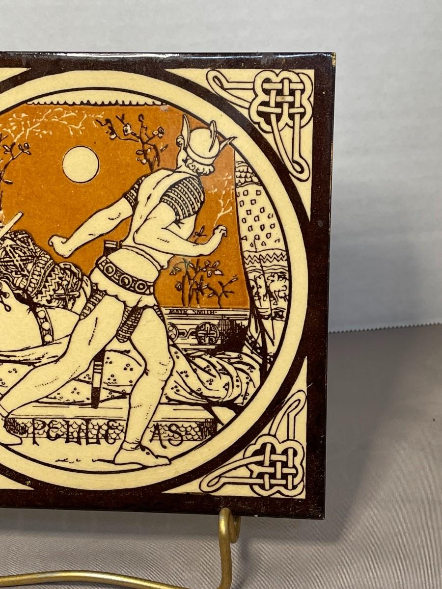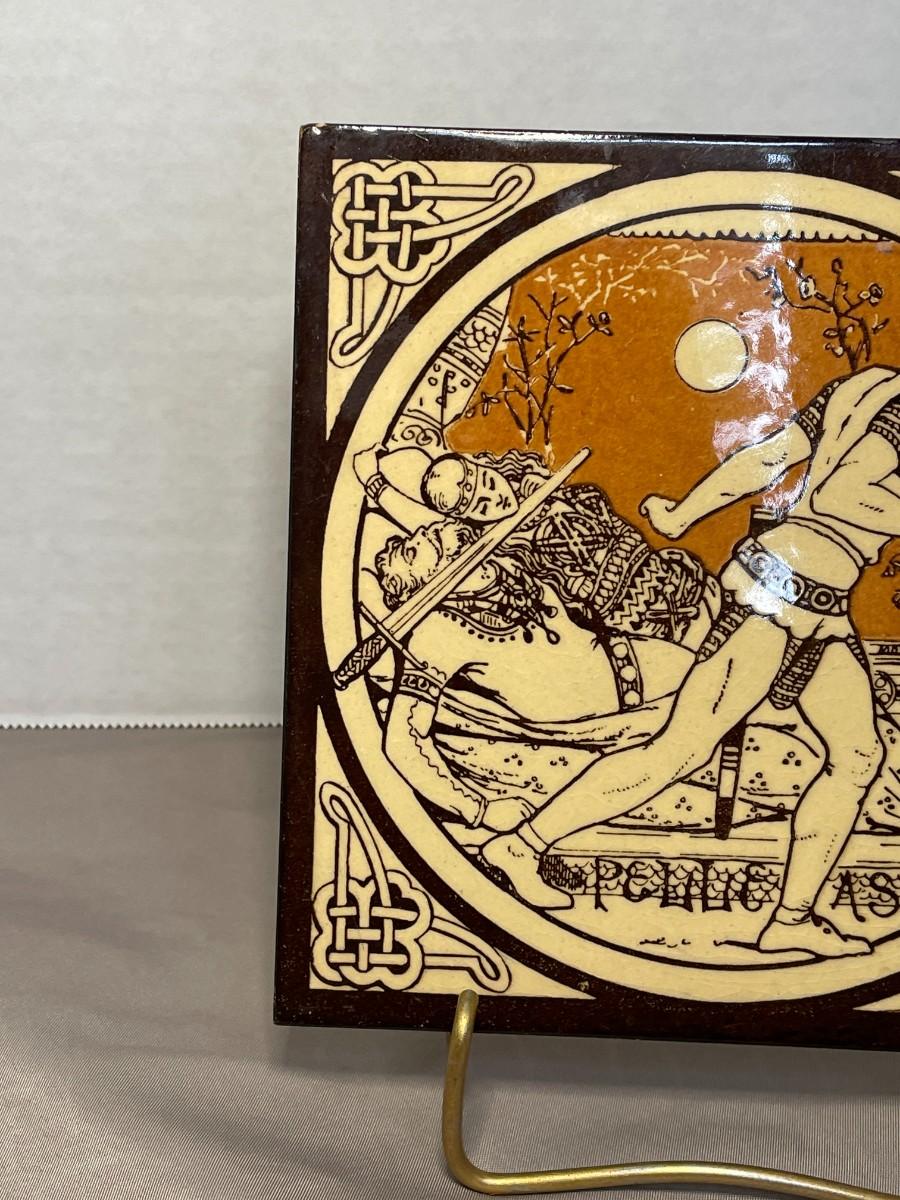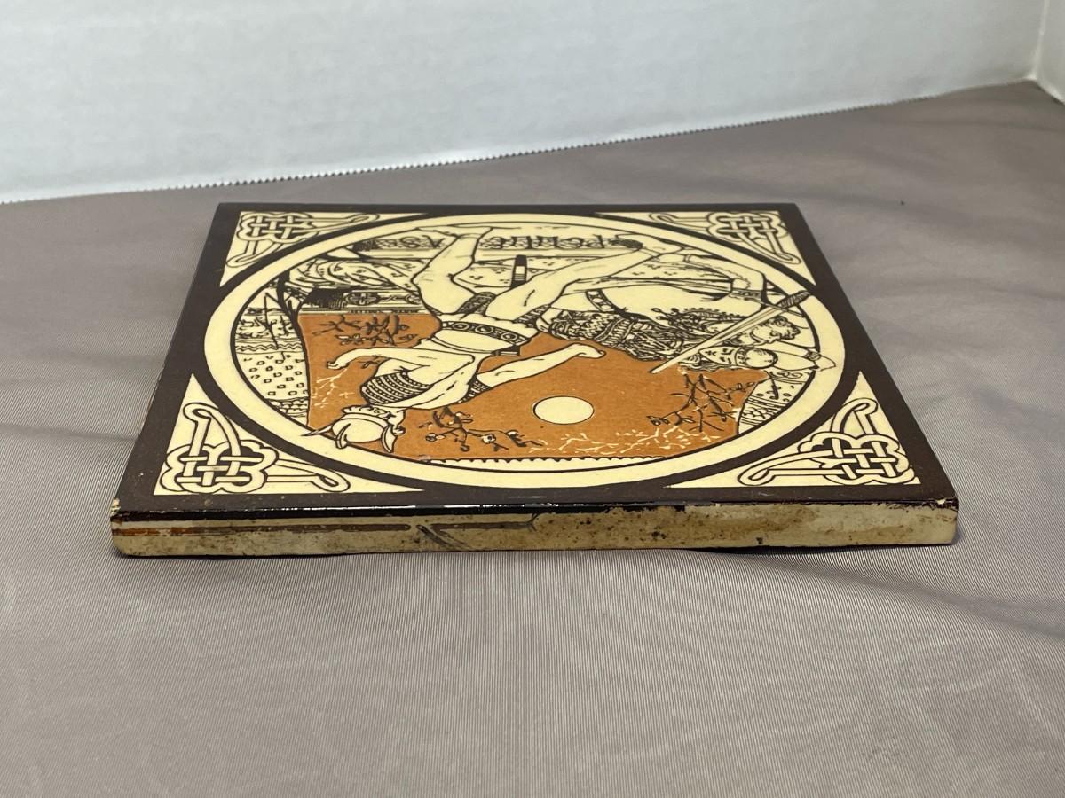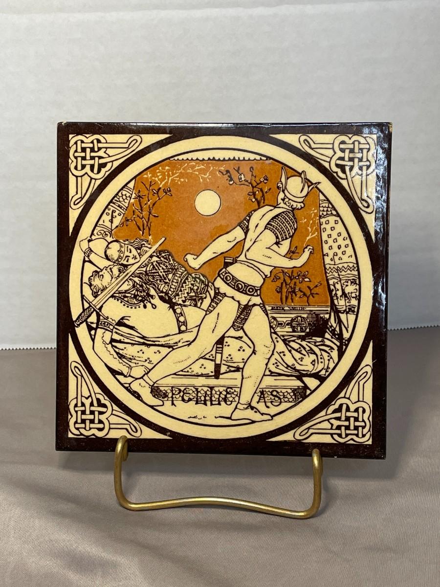 This ceramic tile has a representation from Tennyson's Idylls of the King and is one of the 12 that were originally created by John Moyr Smith circa 1876 for Mintons. This tile is titled "Pelleas" and meaures about 6 inches square. The stand shown is included.