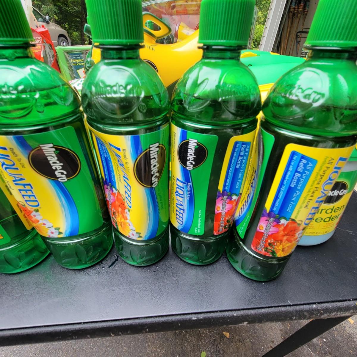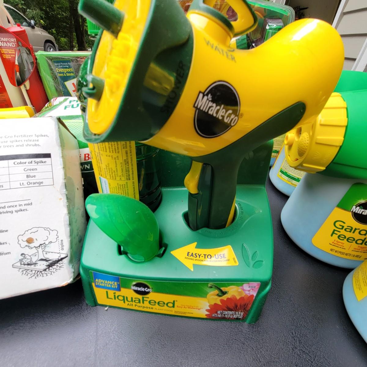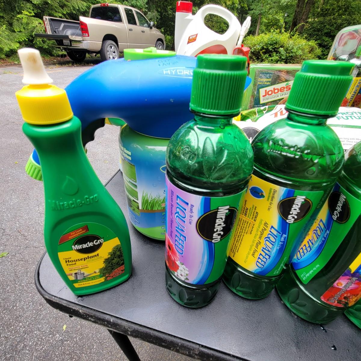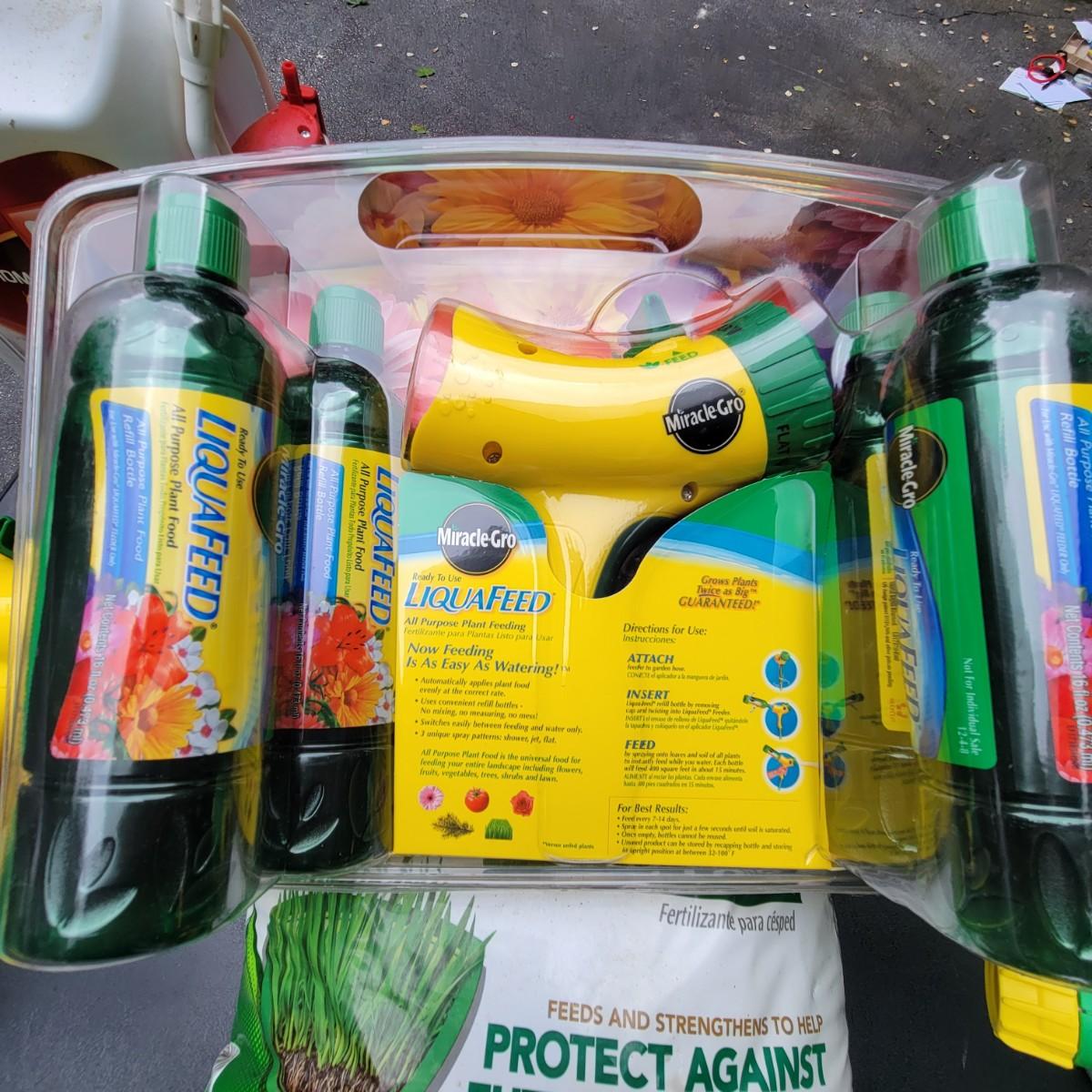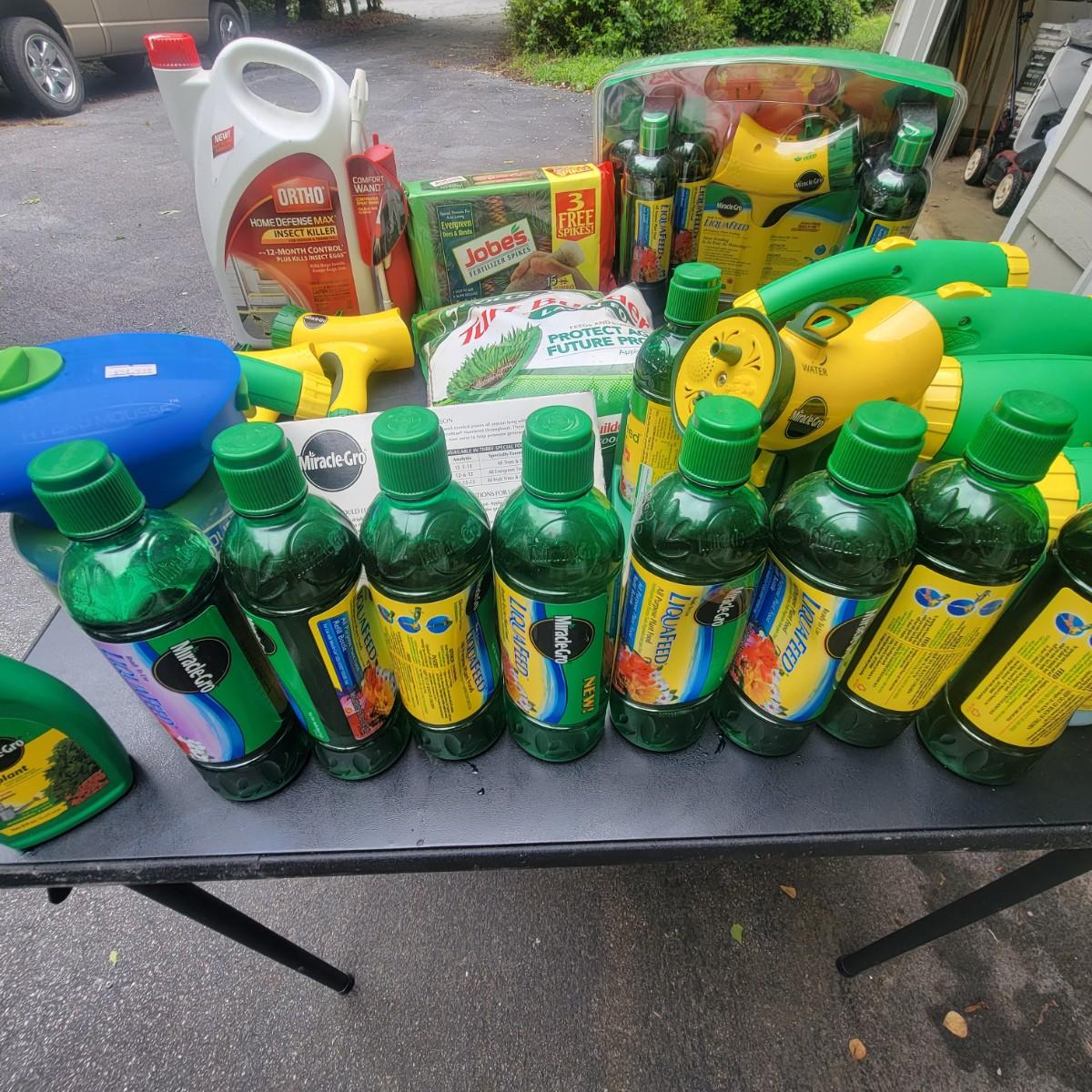 A large assortment of Miracle-Gro fertilizers. Mutliple hose attachments for fertilizer broadcasting. An assortment of prefilled amendments and bottles for a variety of plant needs. Also includes a bottle of Ortho Insect killer, Jobes evergreen fertilizer and more. Local pickup only