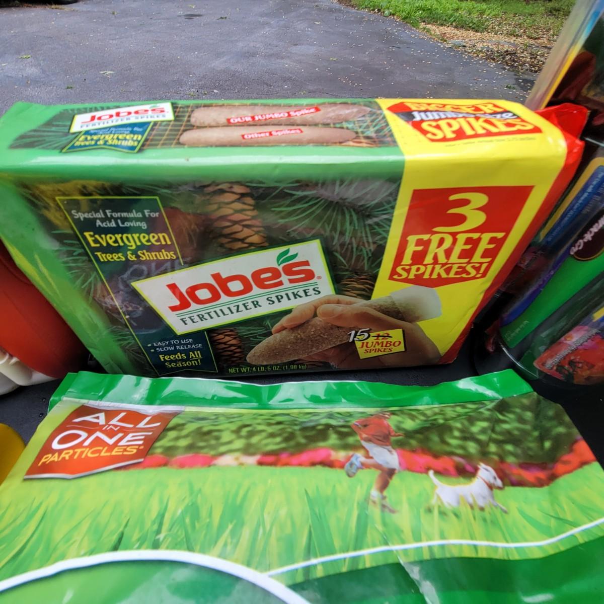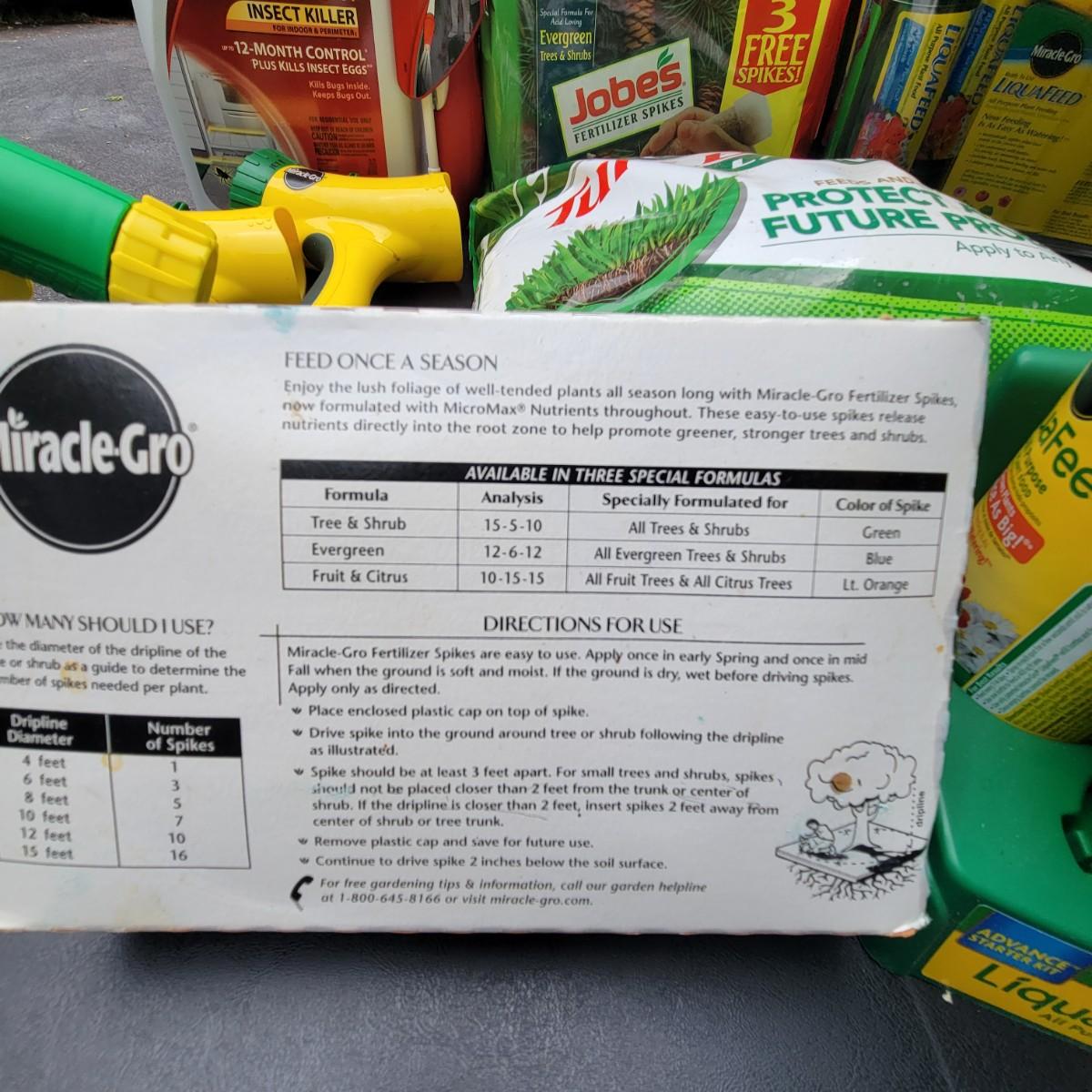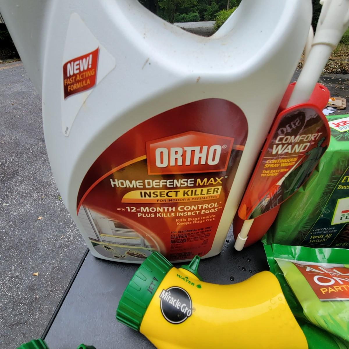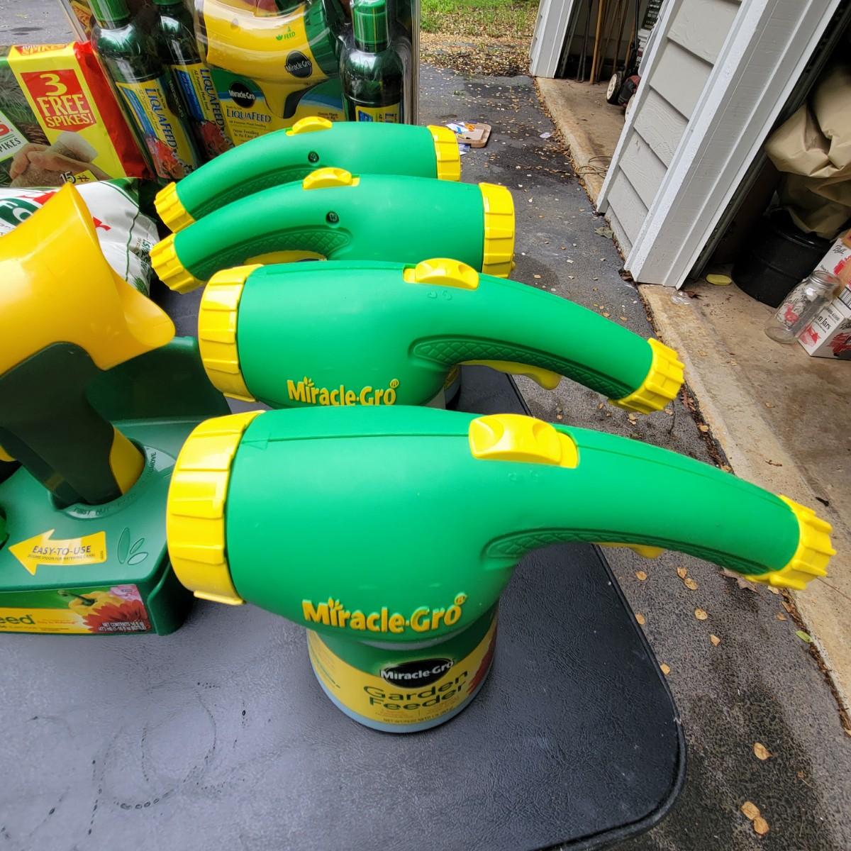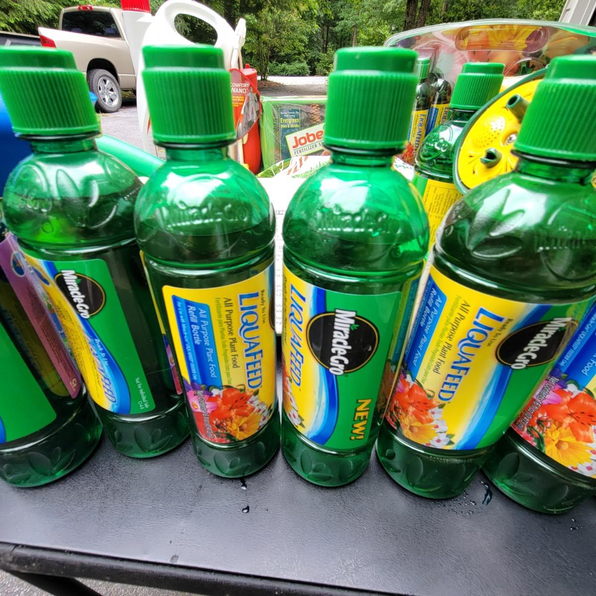 A large assortment of Miracle-Gro fertilizers. Mutliple hose attachments for fertilizer broadcasting. An assortment of prefilled amendments and bottles for a variety of plant needs. Also includes a bottle of Ortho Insect killer, Jobes evergreen fertilizer and more. Local pickup only