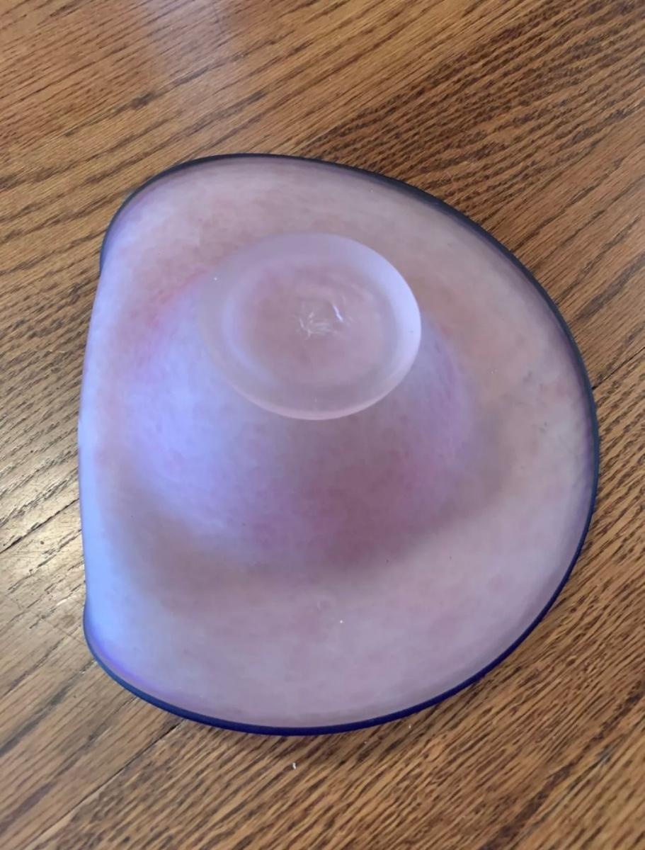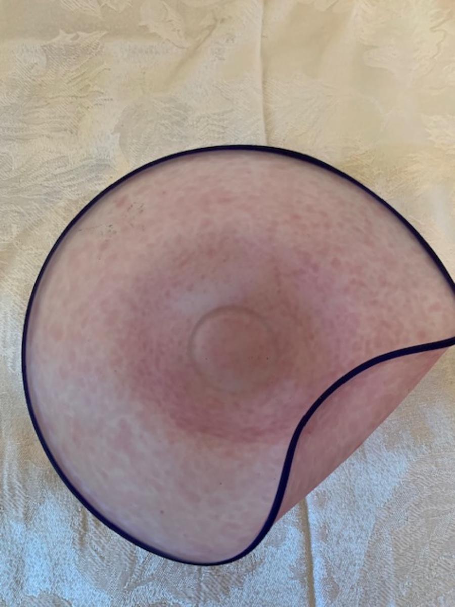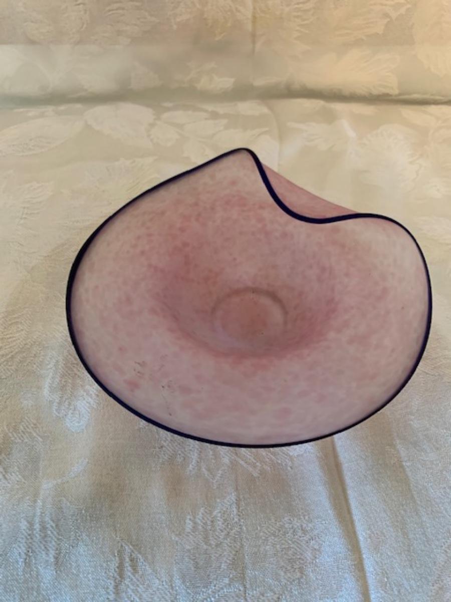 Murano pink art glass centerpiece bowl. Cobalt blue trim. 7 3/"dia X 2 3/4"H