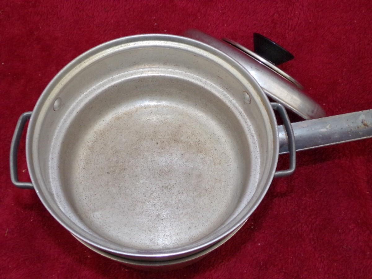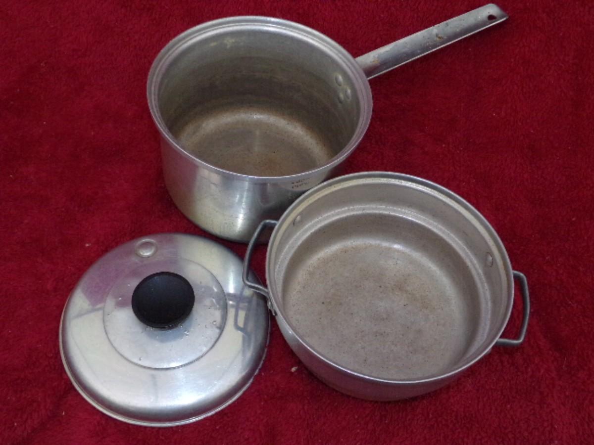 Mirro 3qt. Pan w/matching lid and double boiler. Lid has pressure relief pop-it. Good condition.