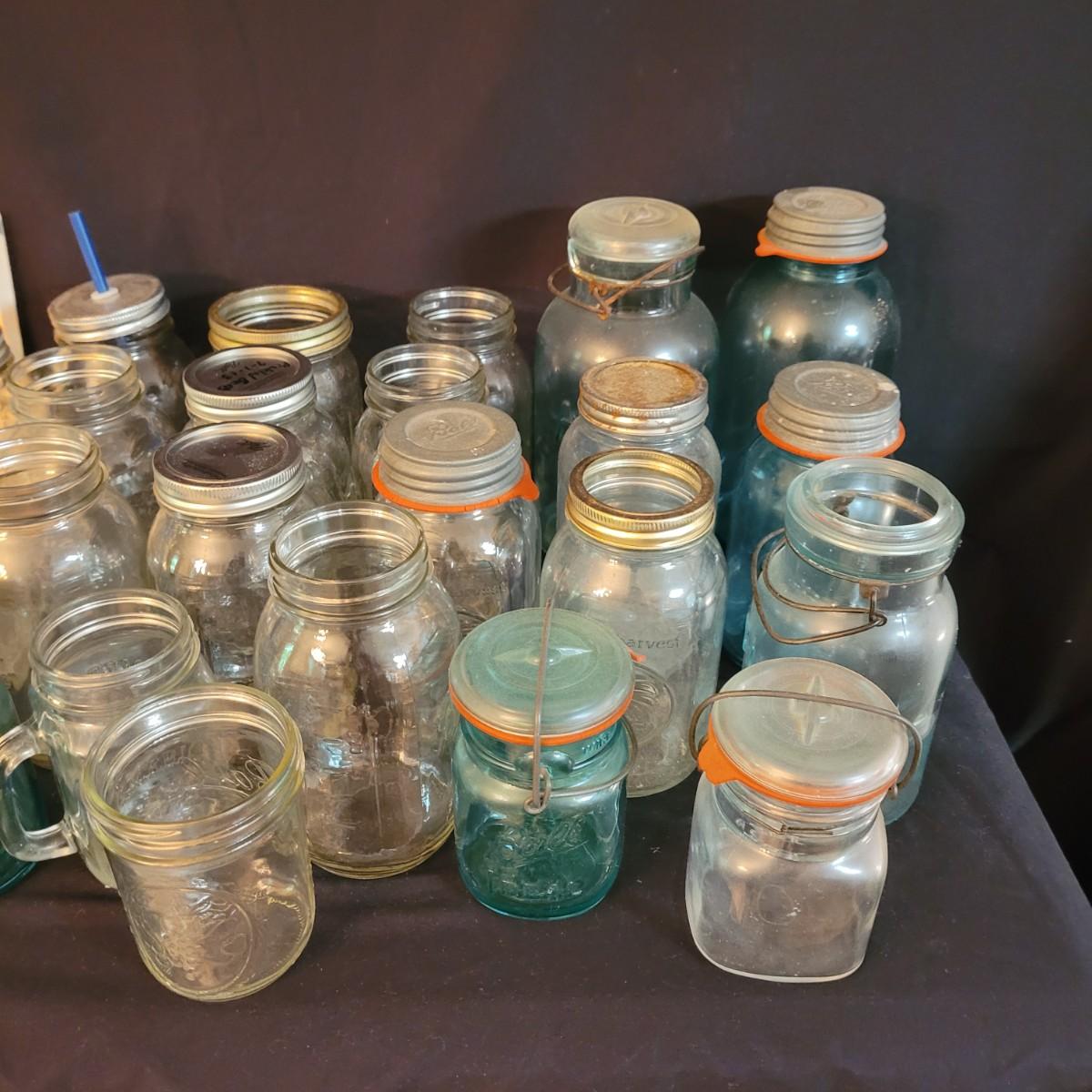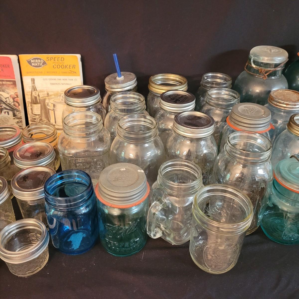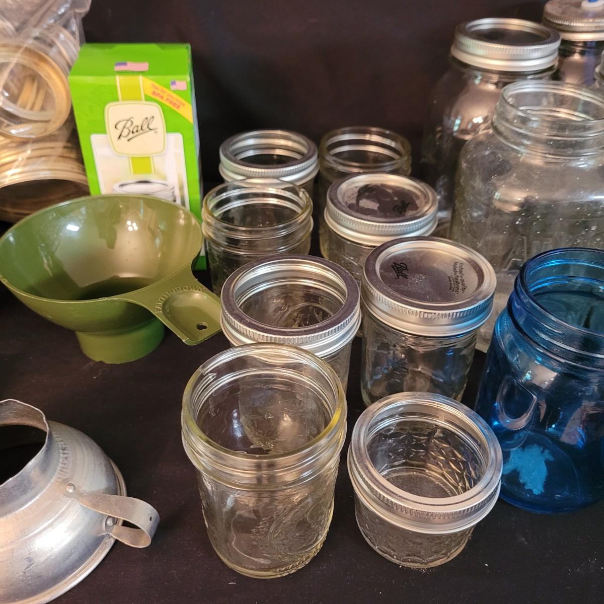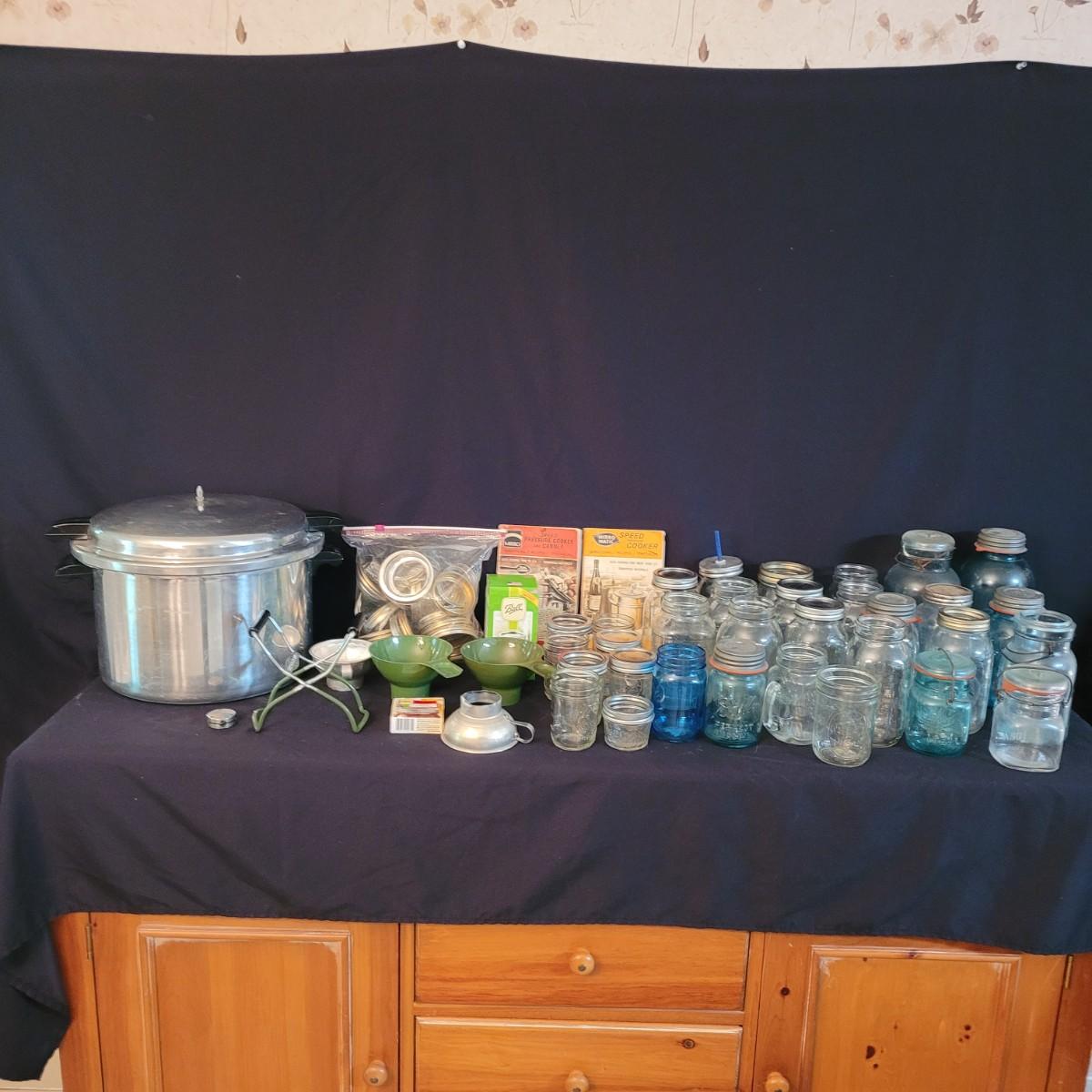 Large Mirro aluminum pressure canner comes with manuals and a variety of supplies including handles, lids, funnels and a large quantity of canning jars of various sizes. Shipping available.