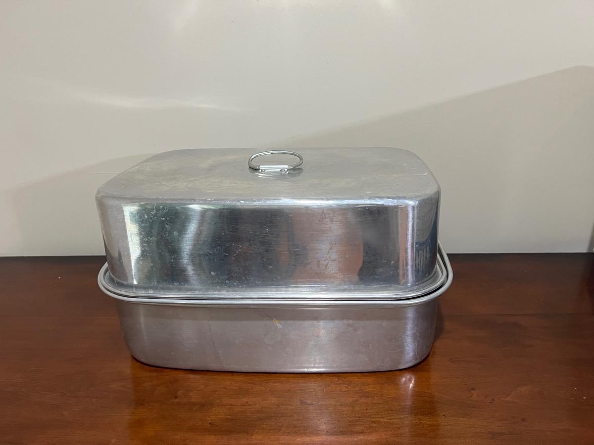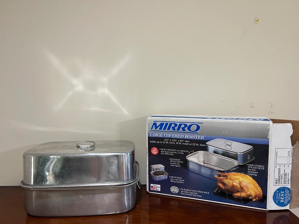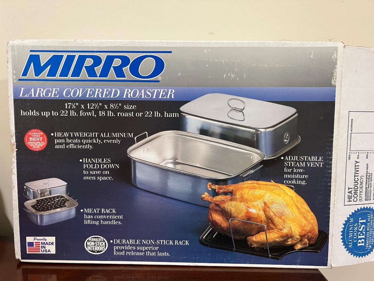 MIRRO Large Covered Aluminum Roaster holds up to 22 pound foul, 18 pound roast or 22 pound ham. Measures 17 1/4” X 12 1/2 “ X 8 1/2”