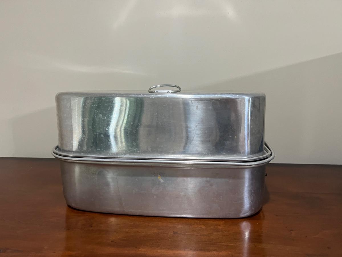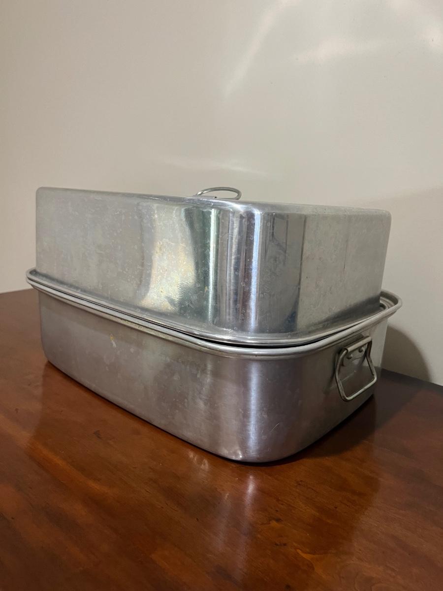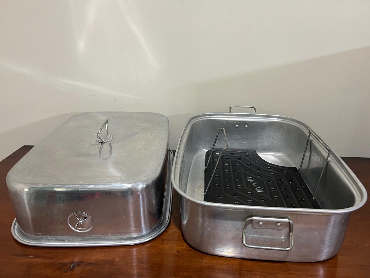 MIRRO Large Covered Aluminum Roaster holds up to 22 pound foul, 18 pound roast or 22 pound ham. Measures 17 1/4” X 12 1/2 “ X 8 1/2”
