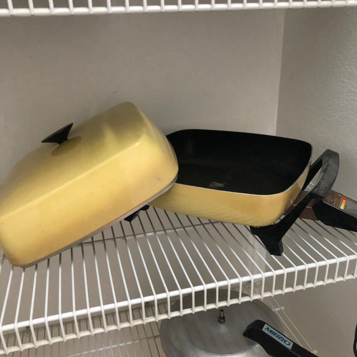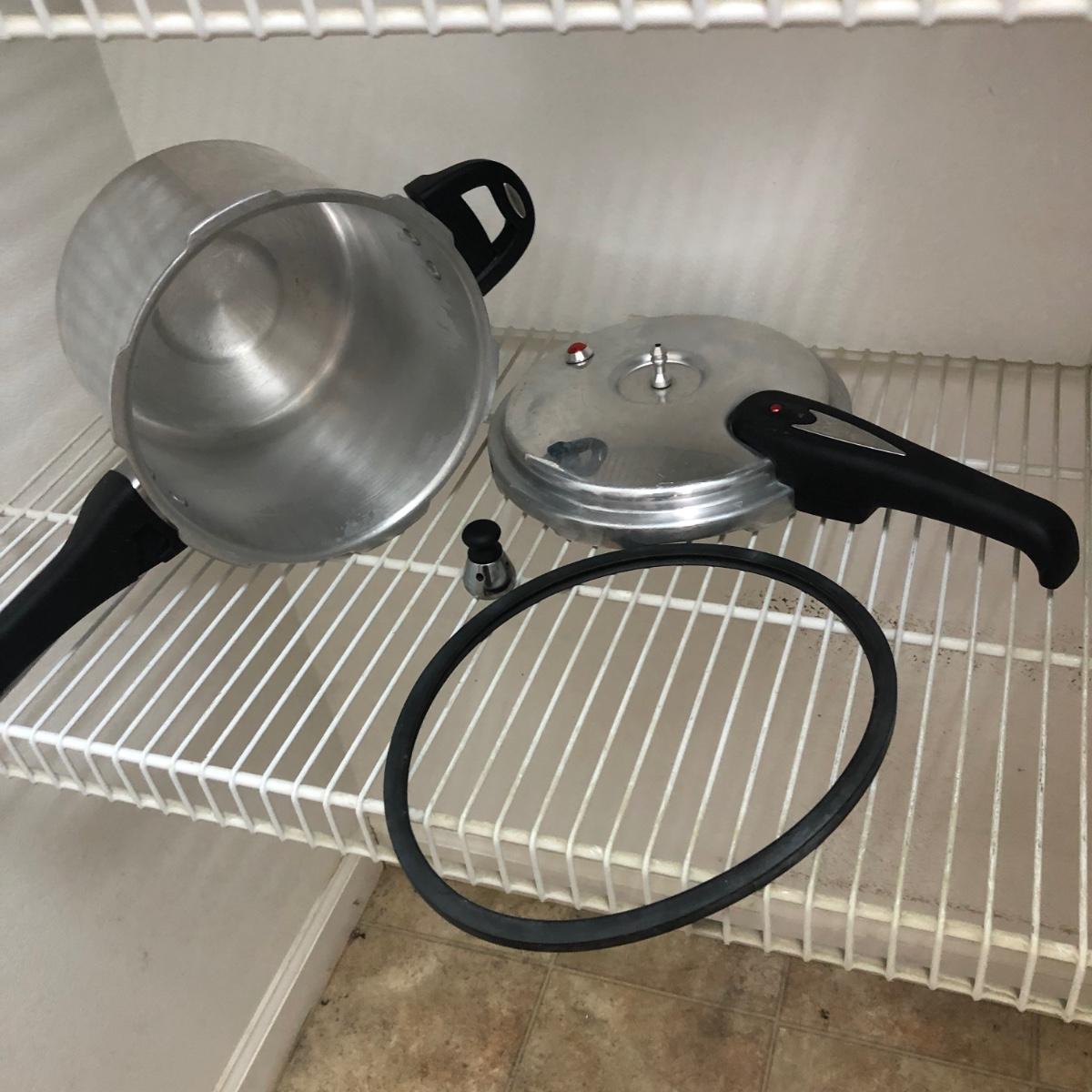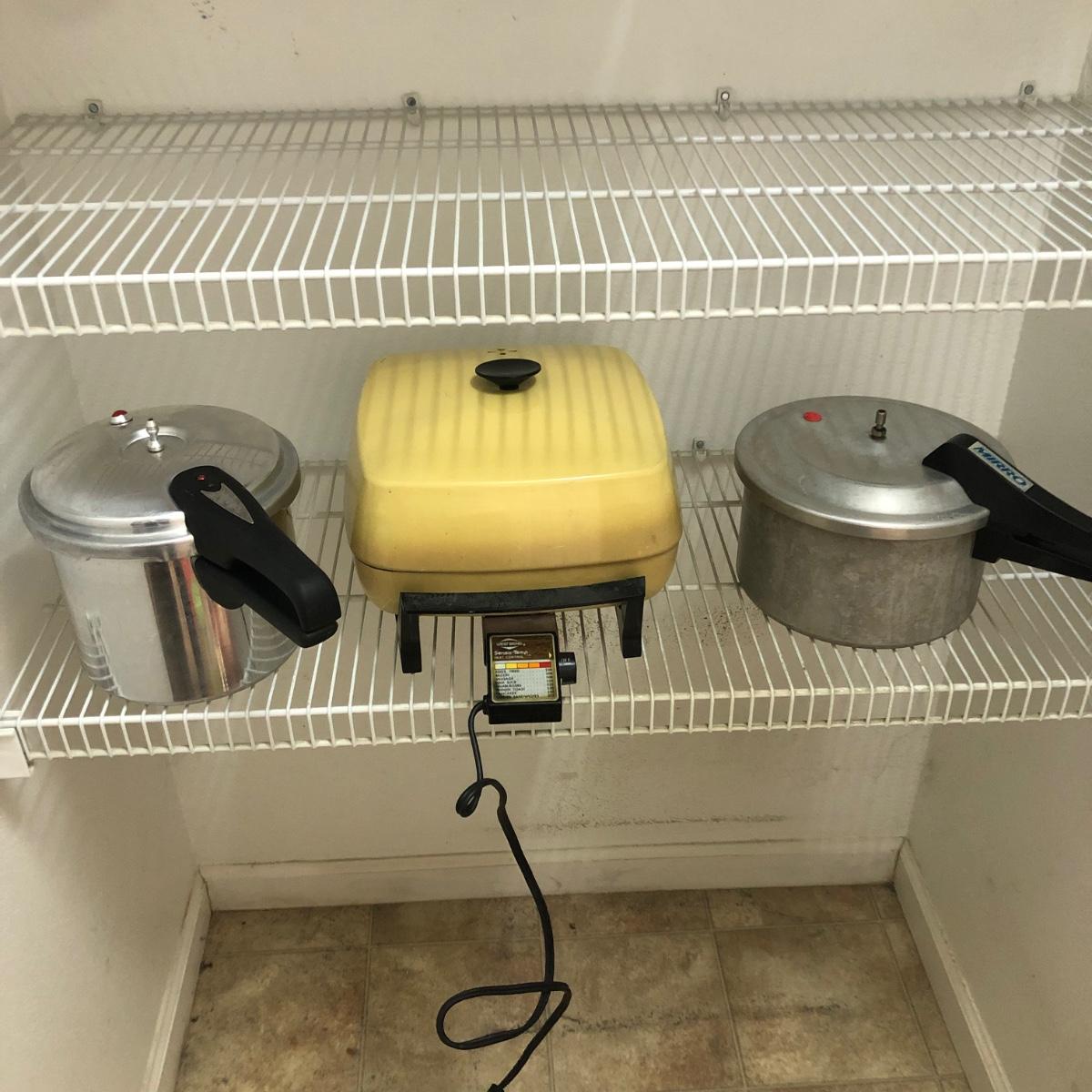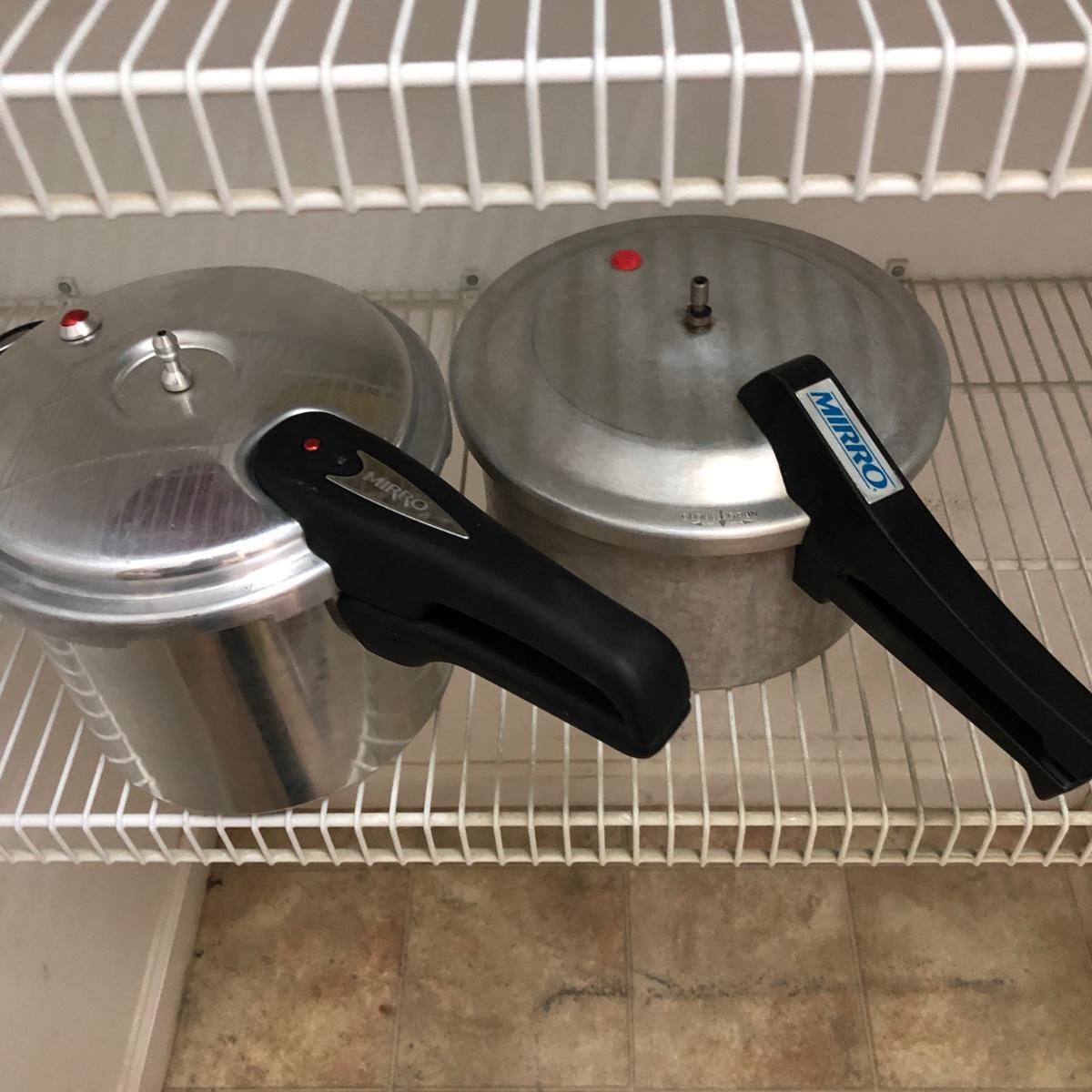 There are three items in this lot: one West Bend covered skillet and two Mirro Pressure Cookers. The West Bend skillet turned on when plugged in. Just the skillet part measures 11” x 11” x 2.5”. The older Mirro pressure cooker is 8.5” in diameter and stands 5” tall. The shiner Mirro pressure cooker is 8” in diameter and stands 6” tall. Shipping Available.