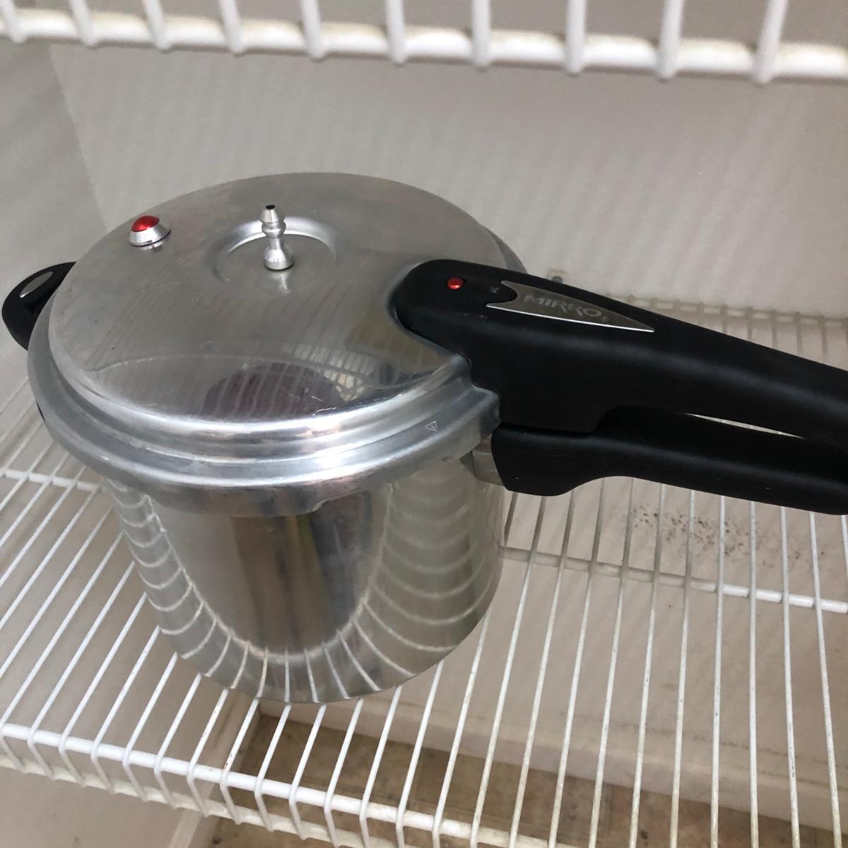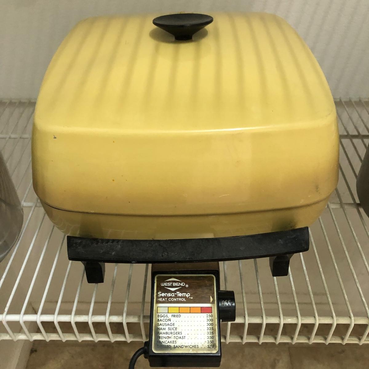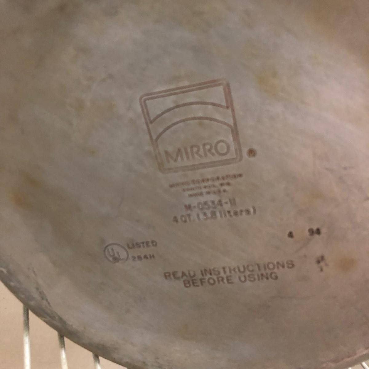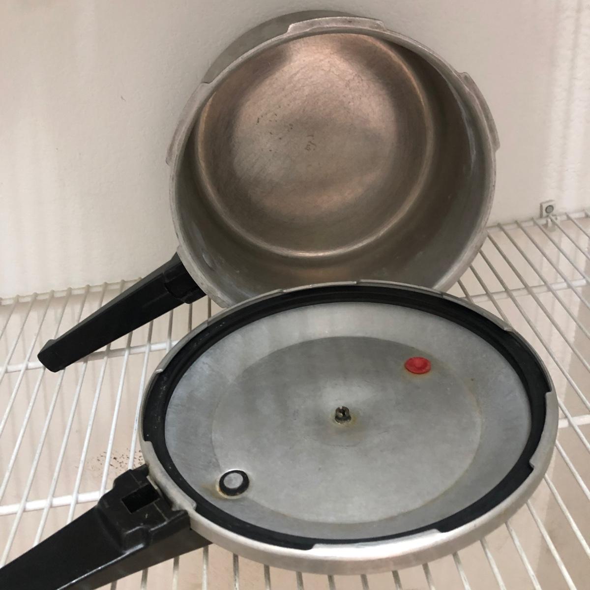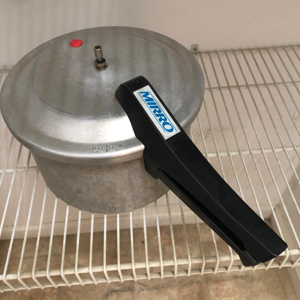 There are three items in this lot: one West Bend covered skillet and two Mirro Pressure Cookers. The West Bend skillet turned on when plugged in. Just the skillet part measures 11” x 11” x 2.5”. The older Mirro pressure cooker is 8.5” in diameter and stands 5” tall. The shiner Mirro pressure cooker is 8” in diameter and stands 6” tall. Shipping Available.