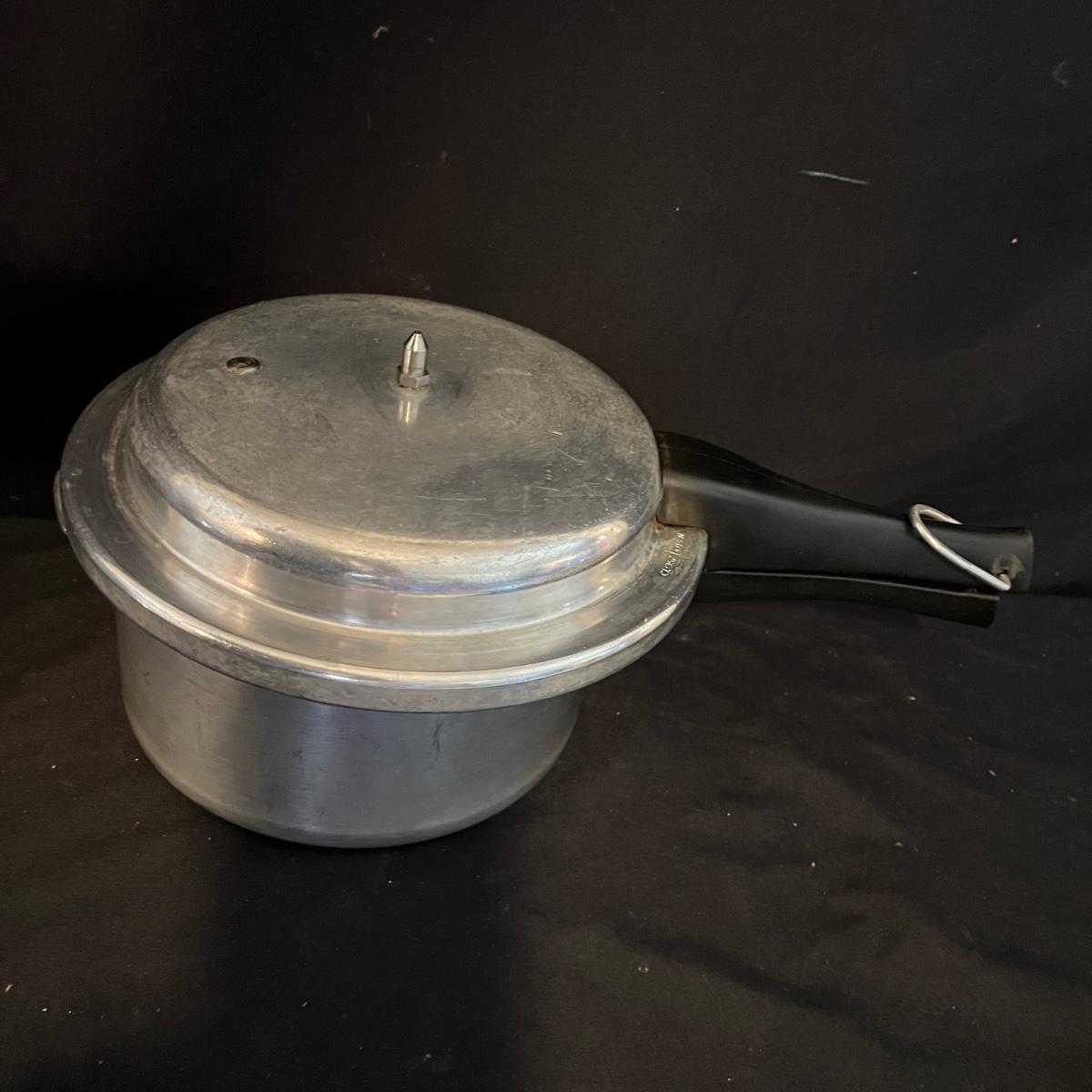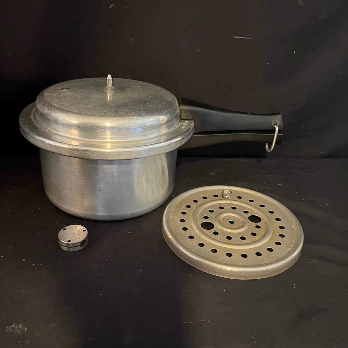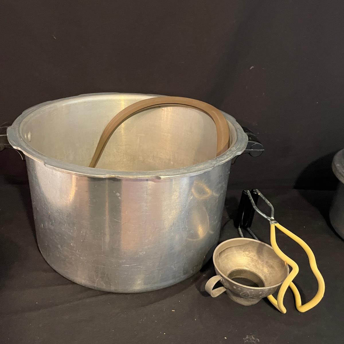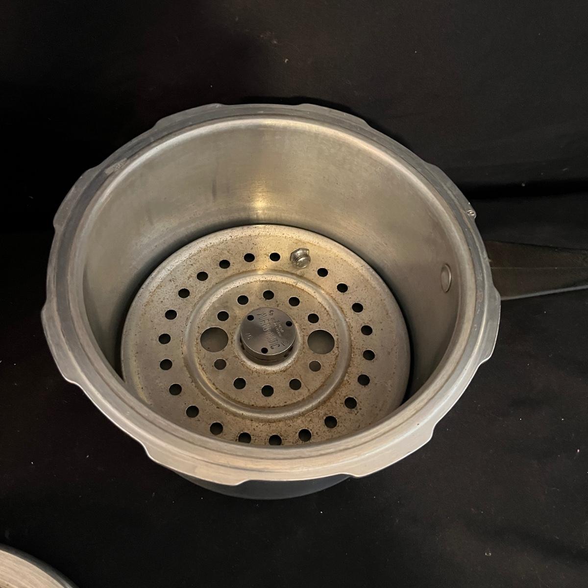 Lot includes a large Mirro pressure cooker that measures 15”D x 11”H., smaller Mirro pressure cooker and a few extra pieces, see pictures.