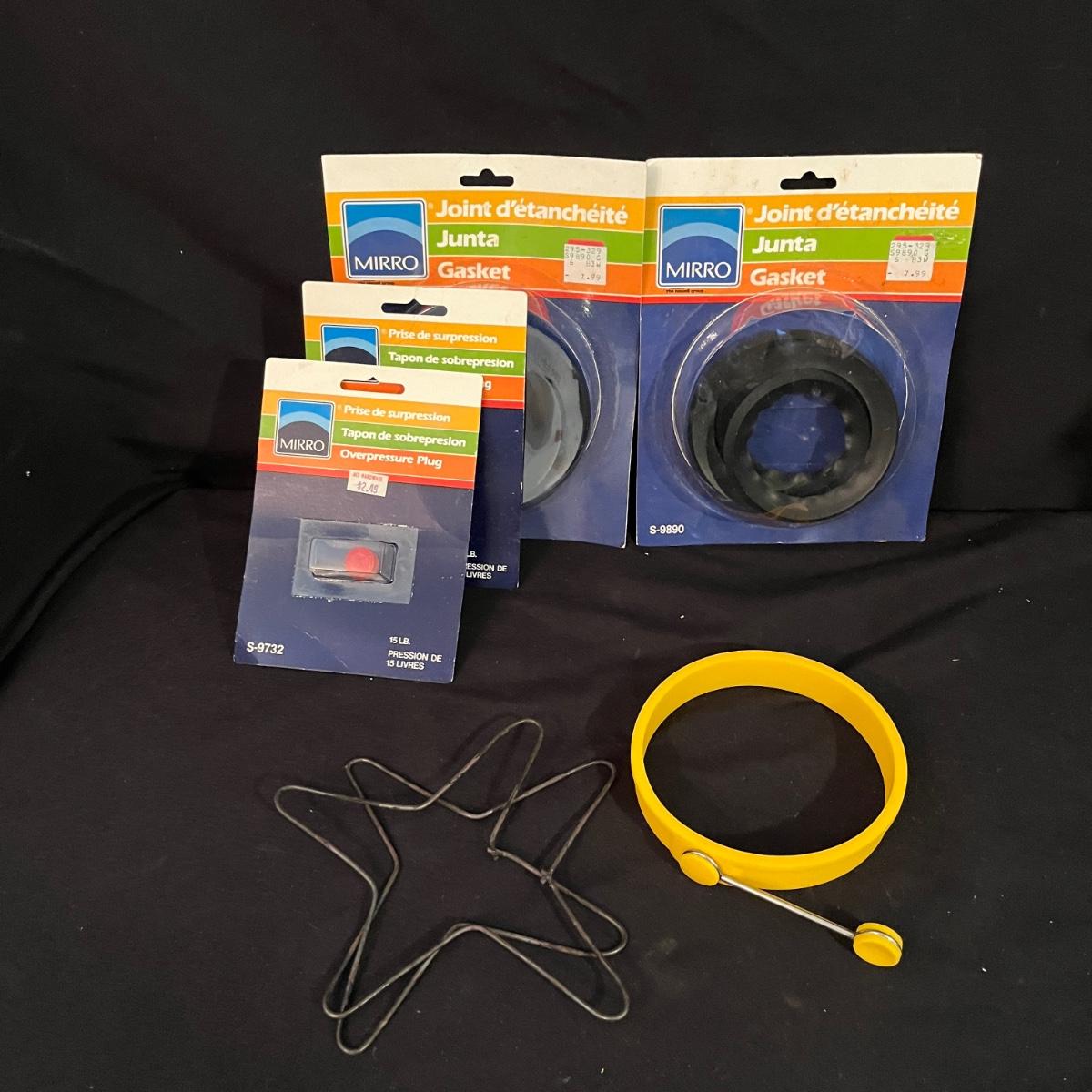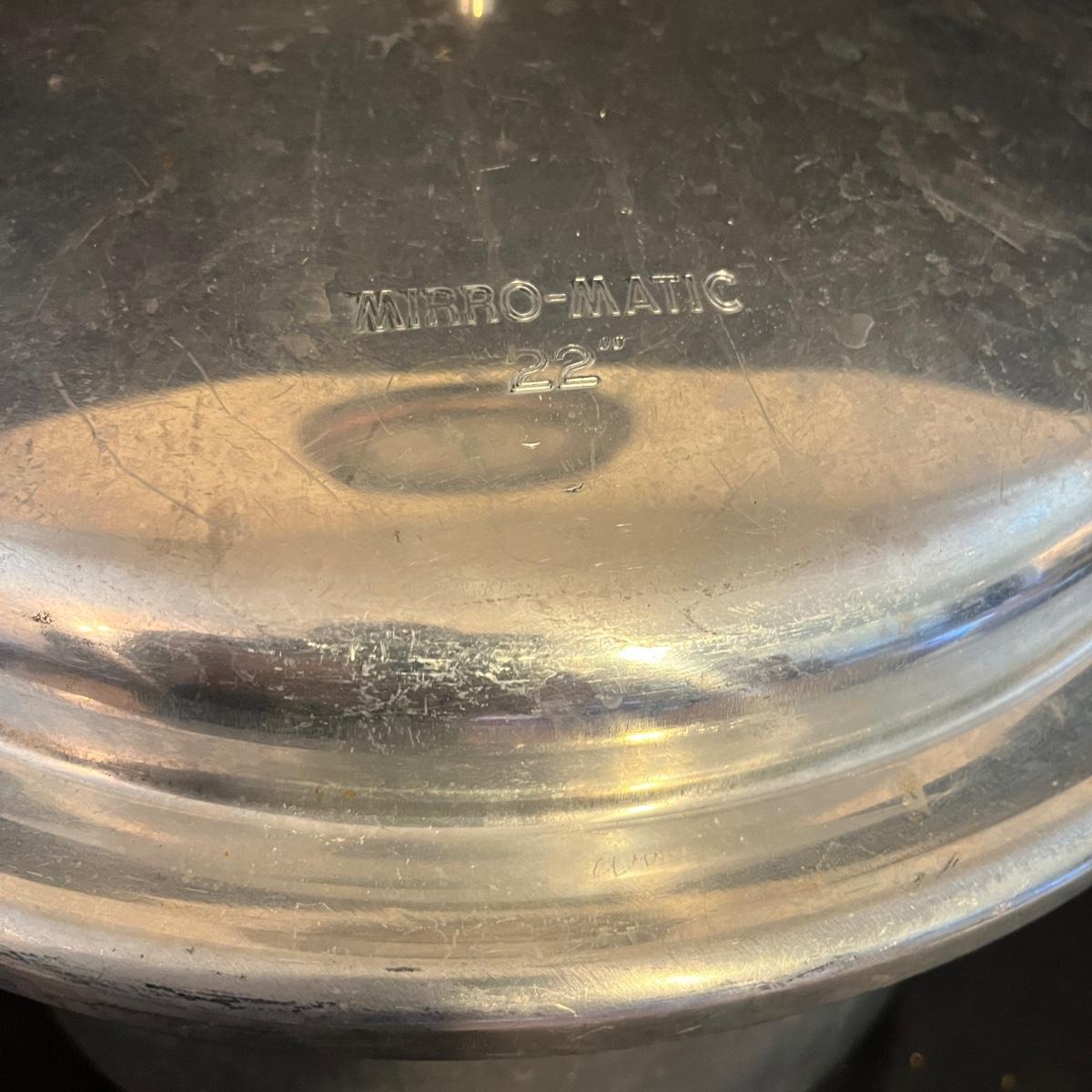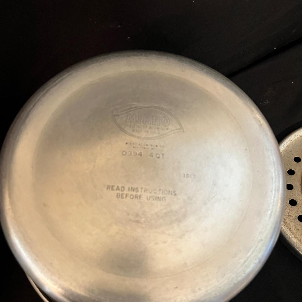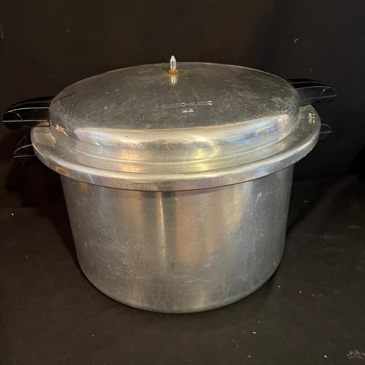 Lot includes a large Mirro pressure cooker that measures 15”D x 11”H., smaller Mirro pressure cooker and a few extra pieces, see pictures.