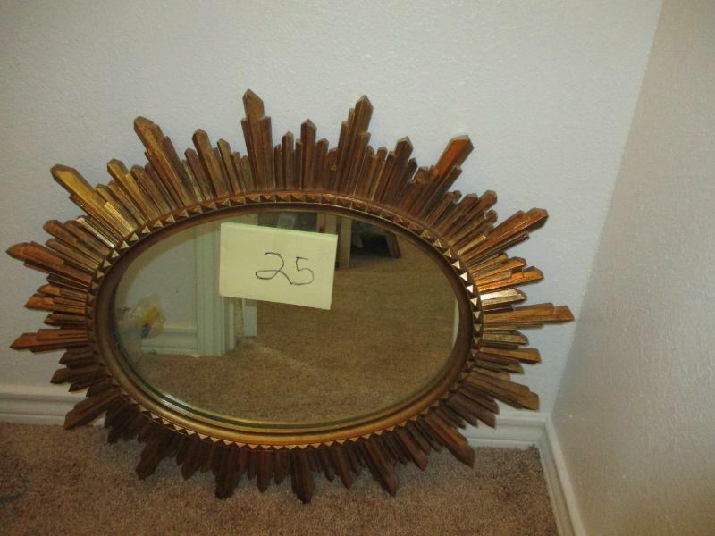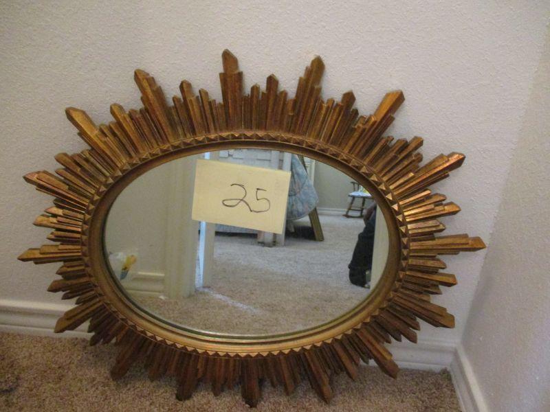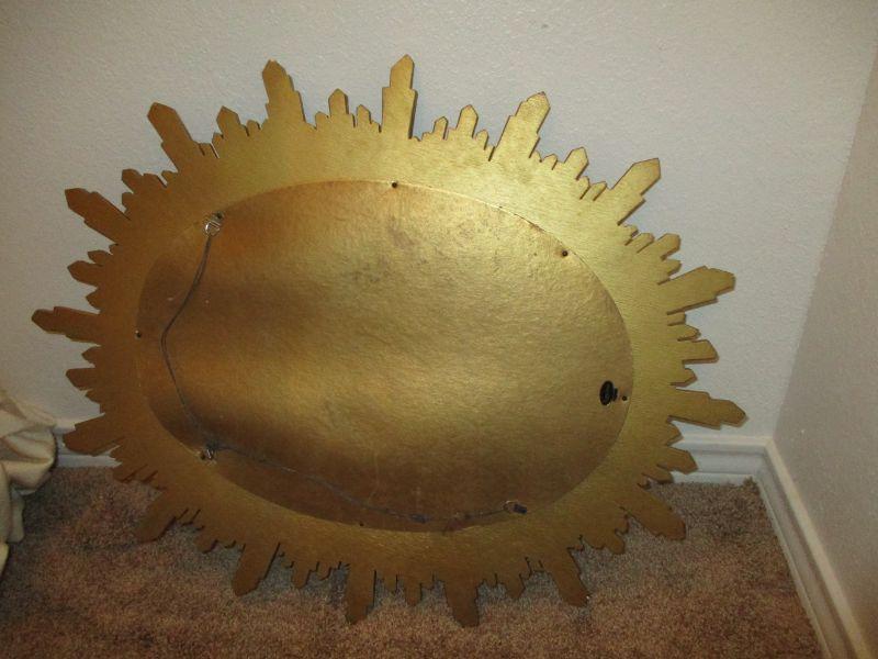 Decorative oval gold sunburst framed mirror. Measures approx 31in x24 1/2