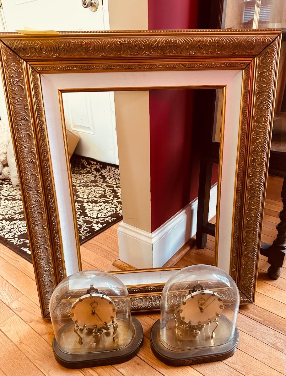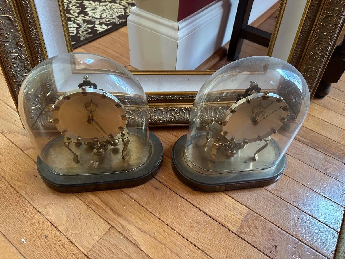 MIRROR AND CLOCK LOT 2 DOME MANTEL CLOCKS, GOLD FRAMED MIRROR AS PICTURED
