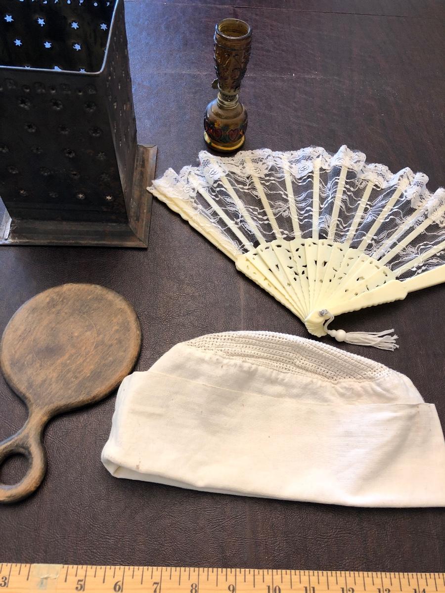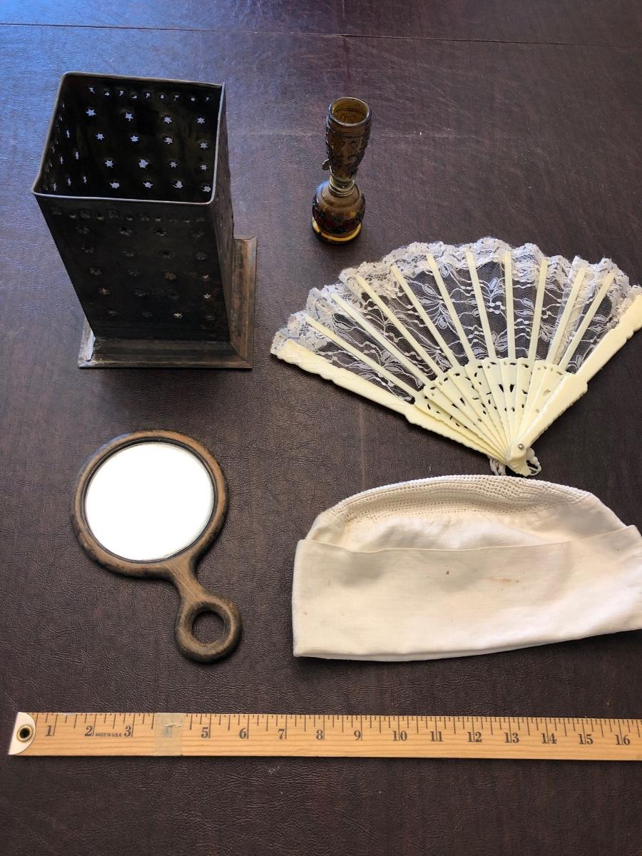 Beveled hand mirror, oil lamp, punched tin candle lantern, decorative fan, and handmade hat.