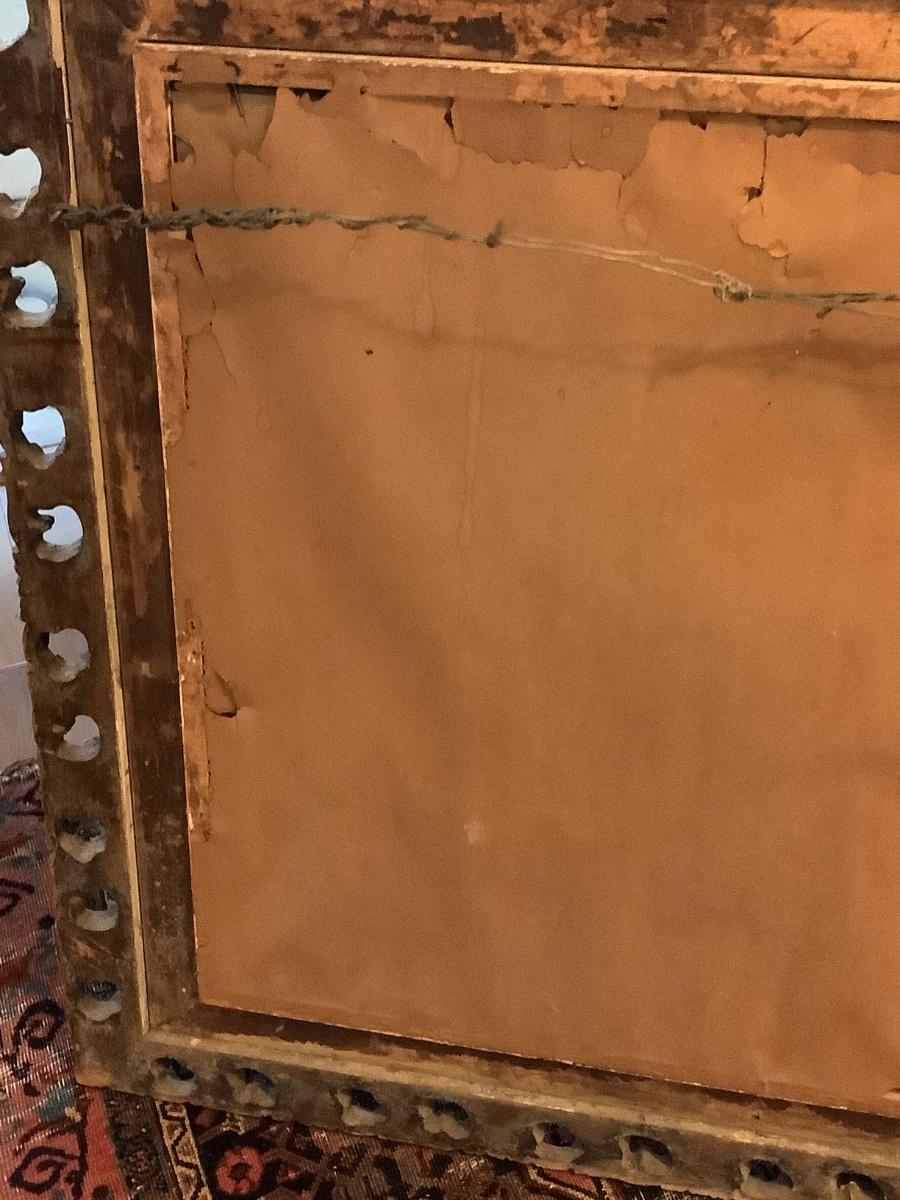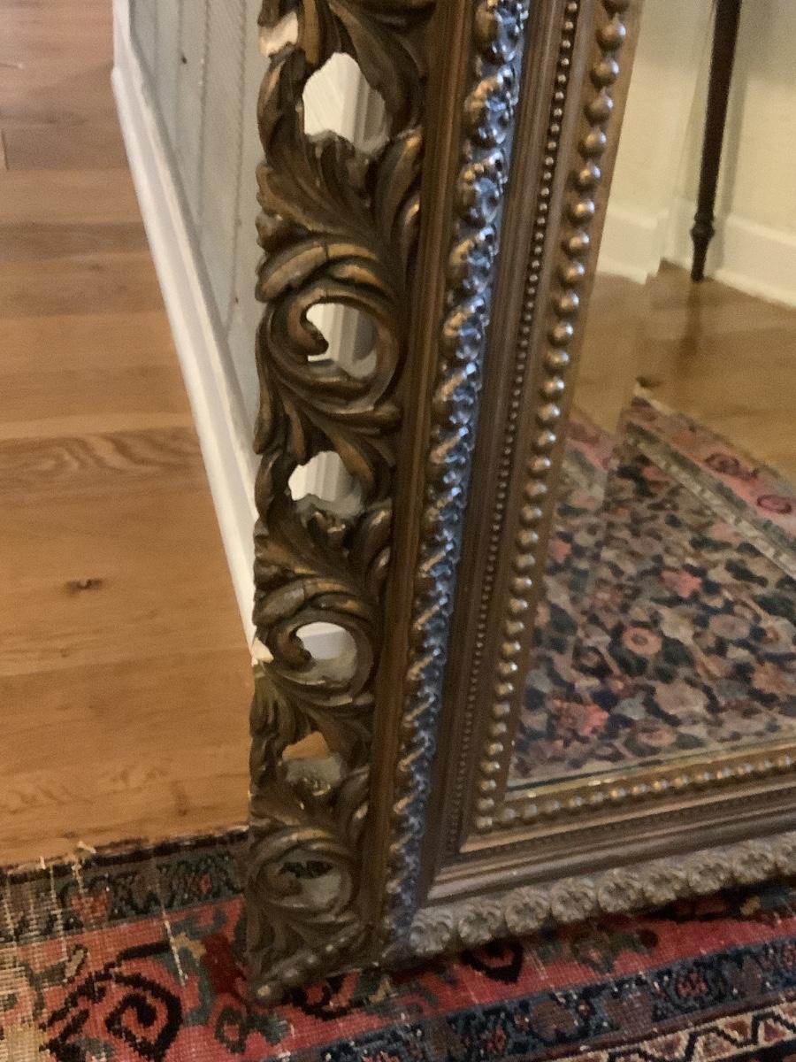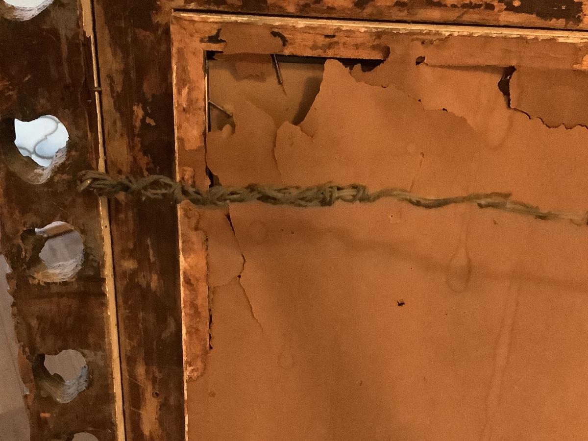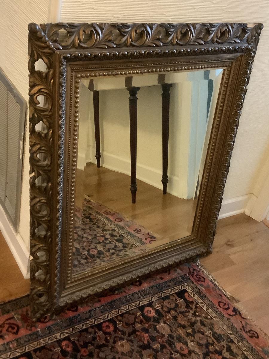 Perfectly aged golden frame on this beveled mirror with wire hang