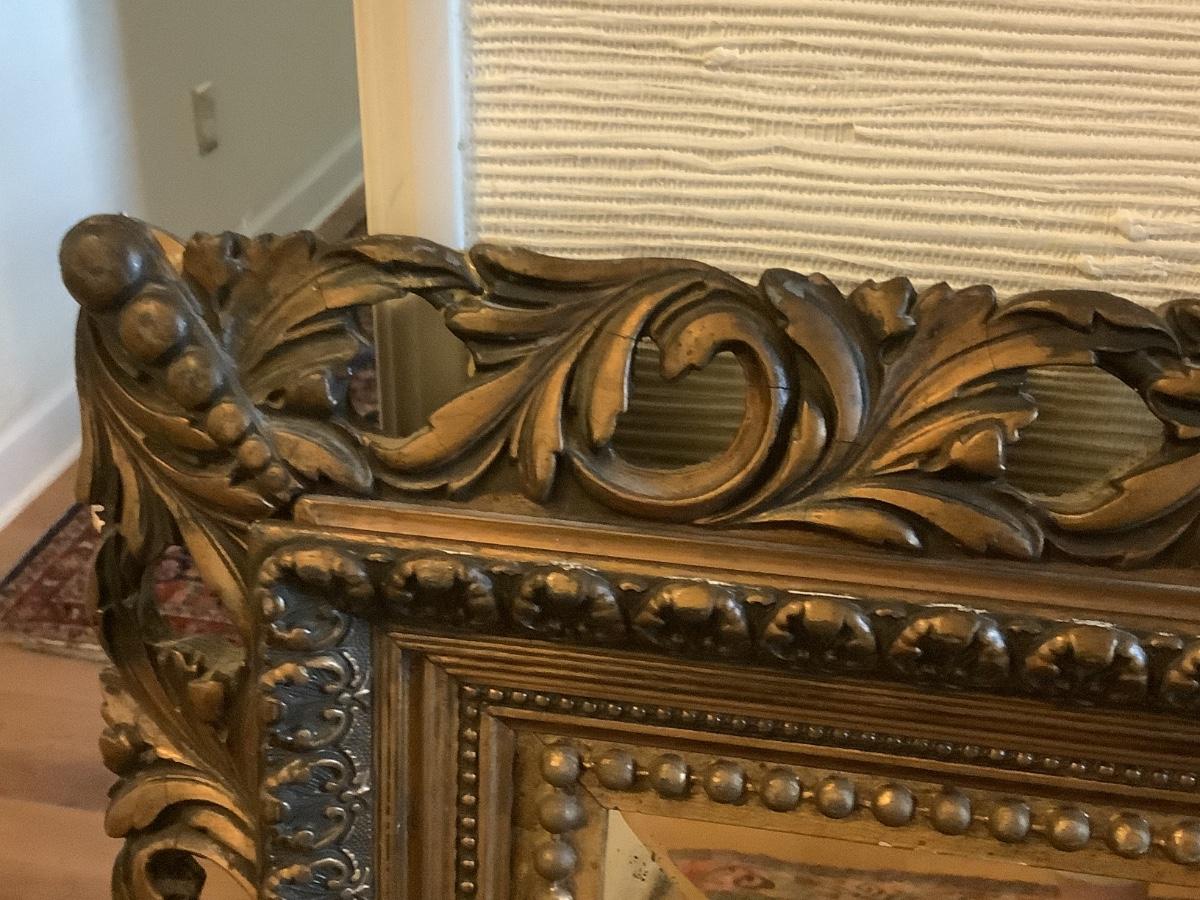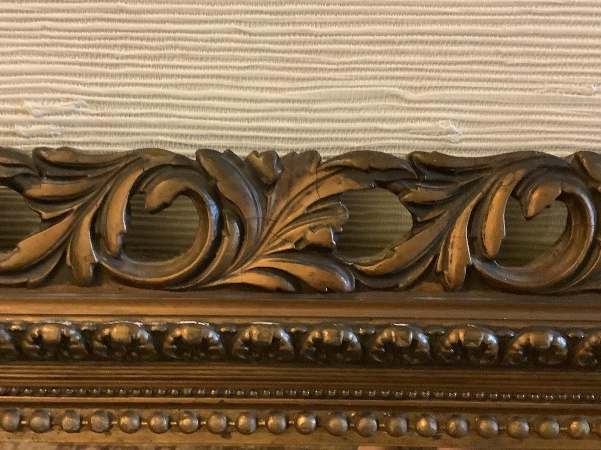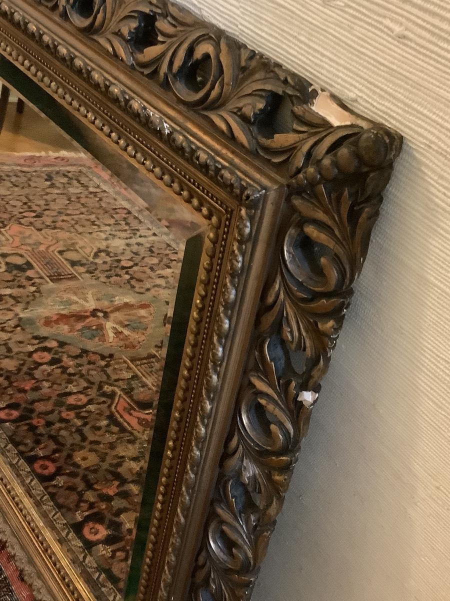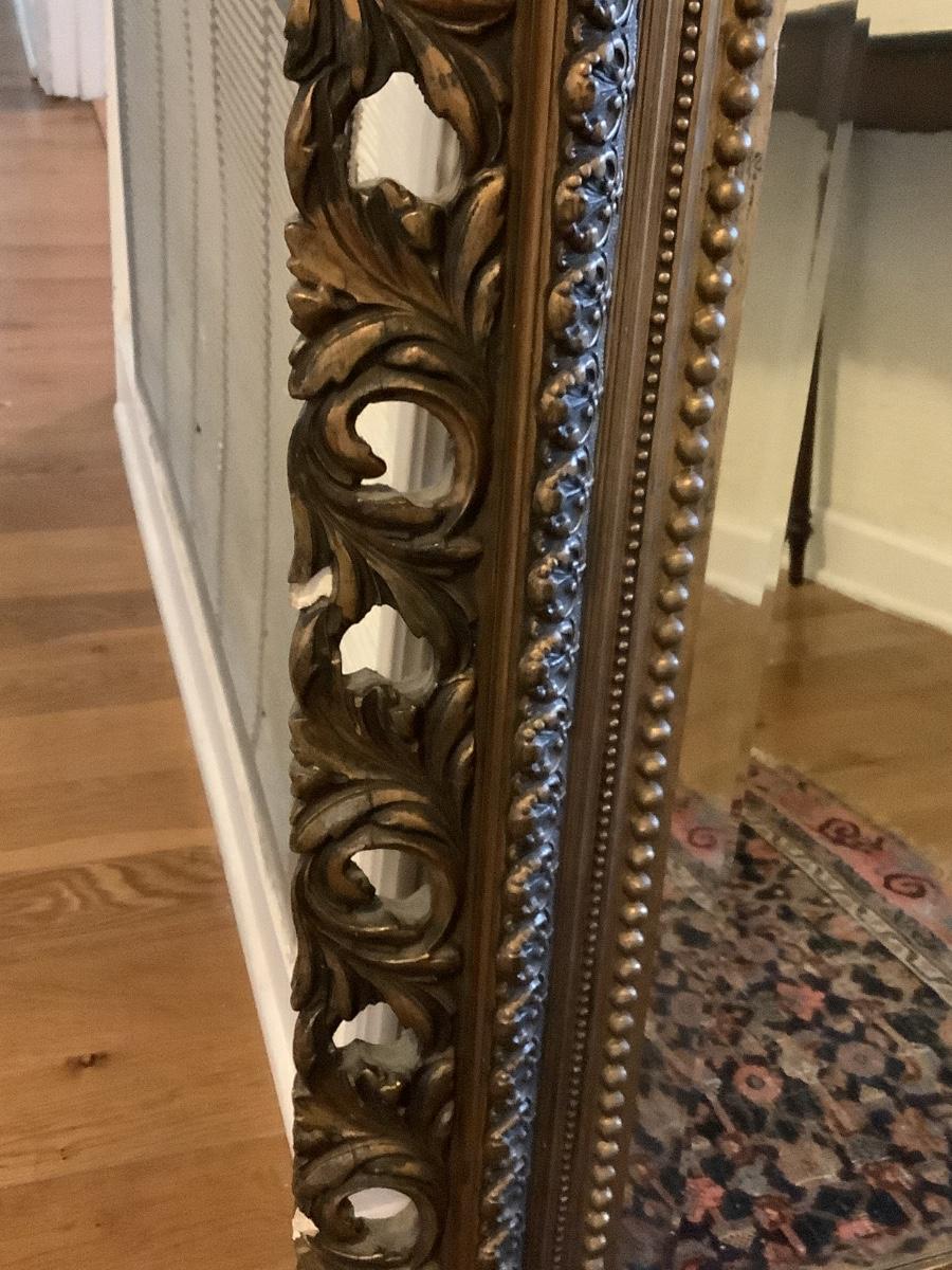 Perfectly aged golden frame on this beveled mirror with wire hang