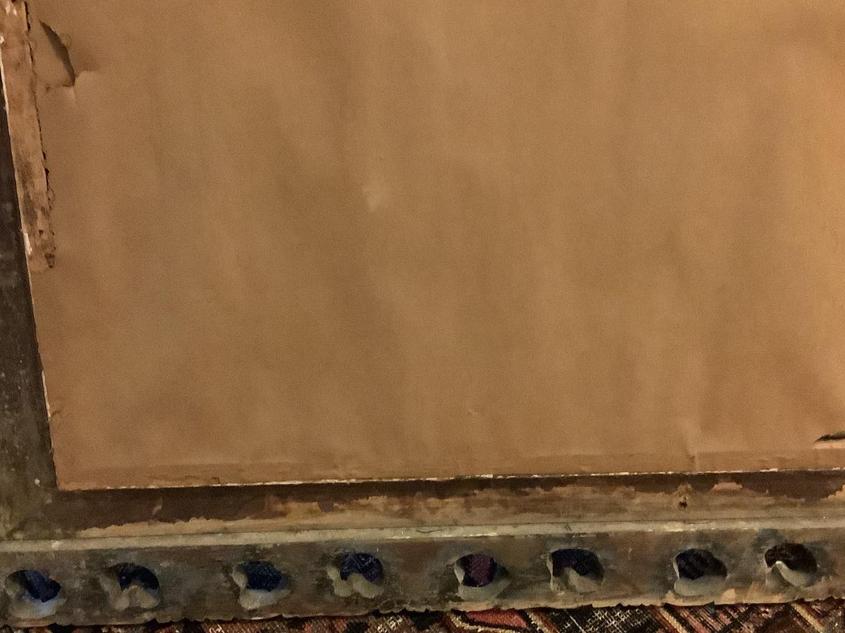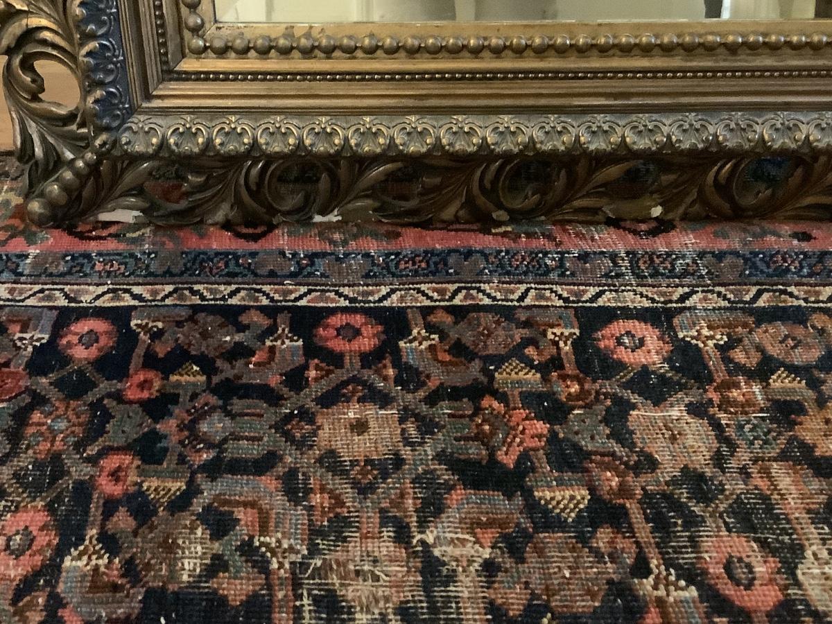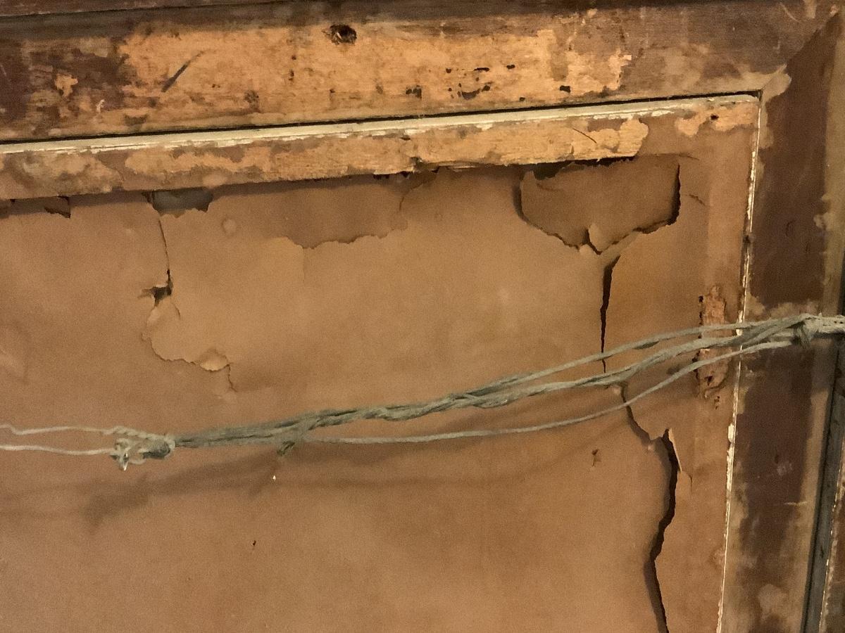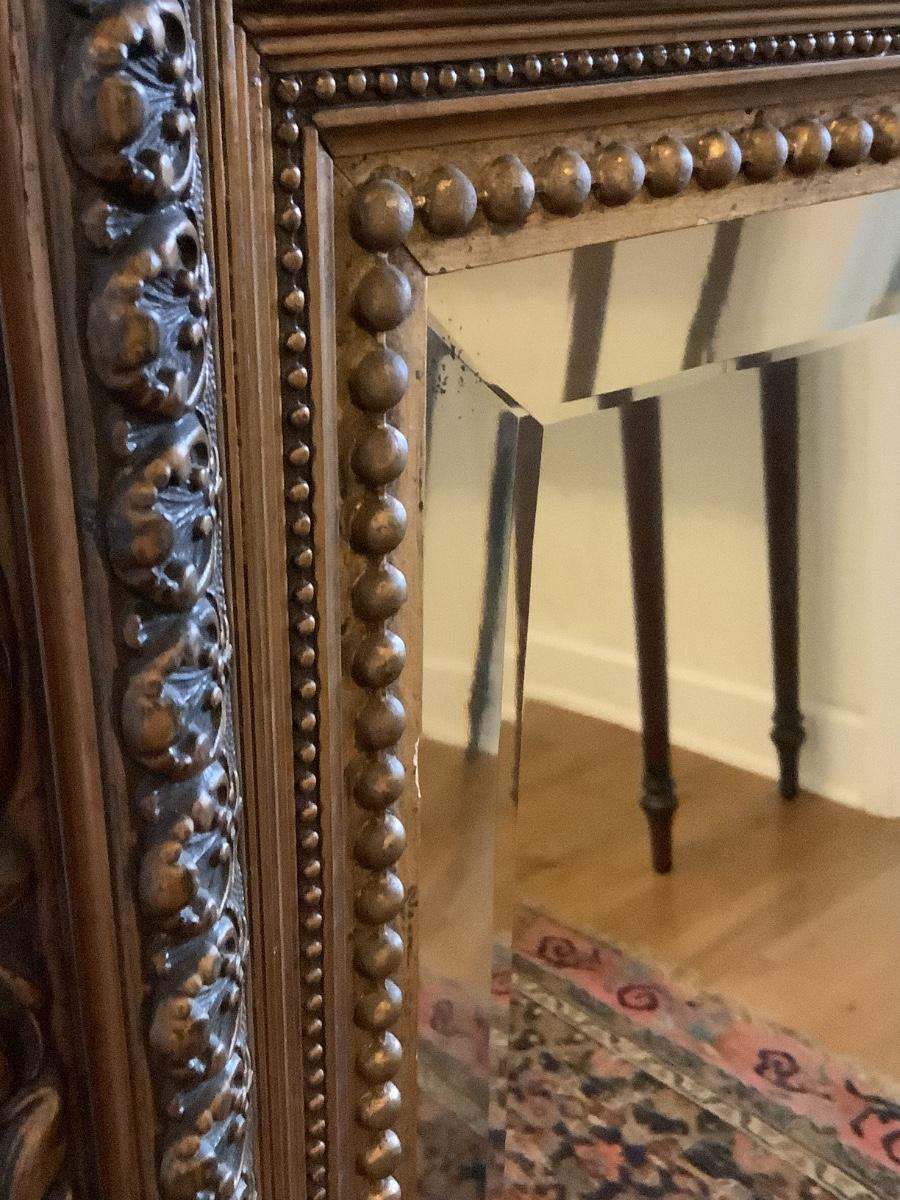 Perfectly aged golden frame on this beveled mirror with wire hang