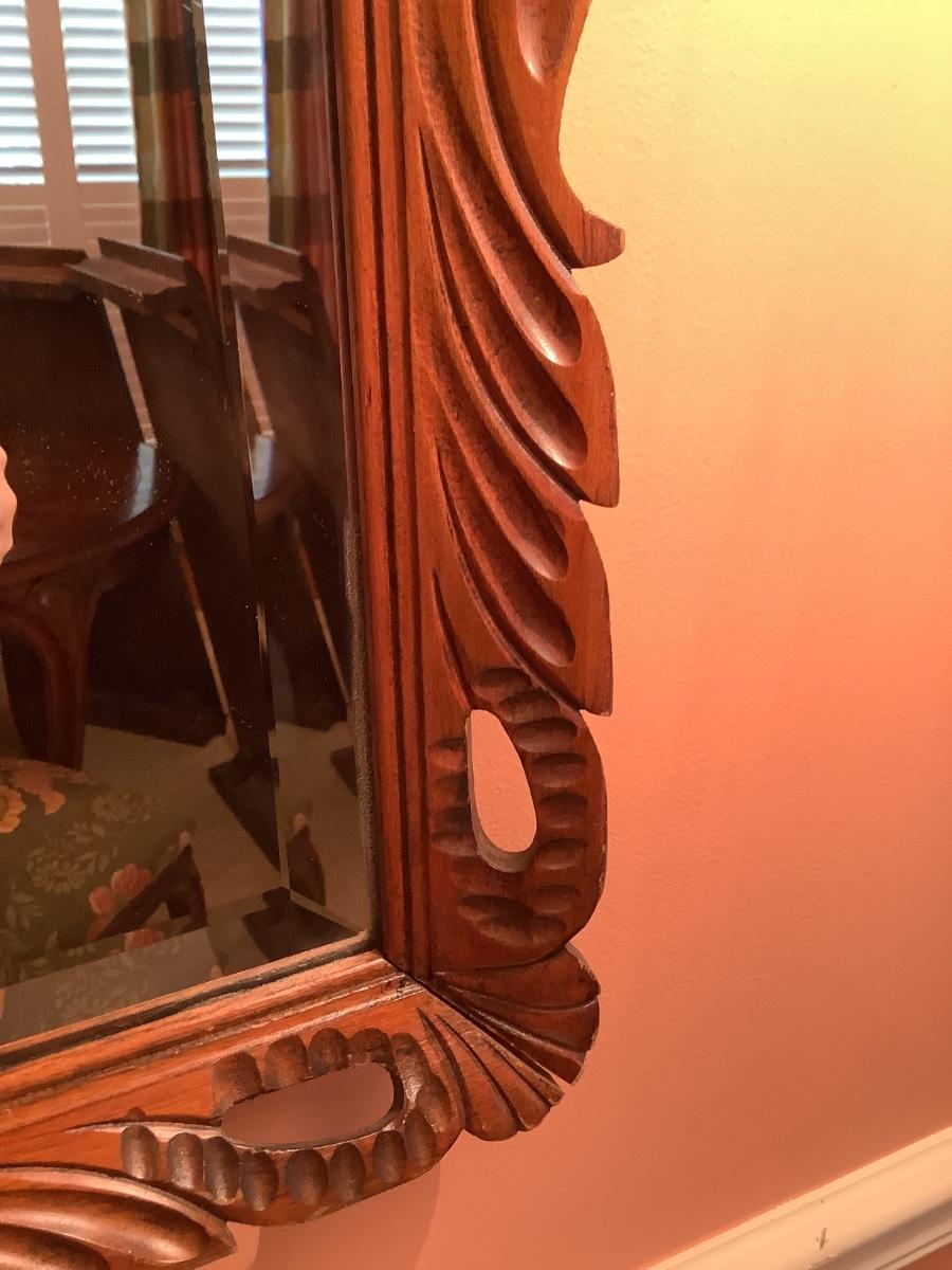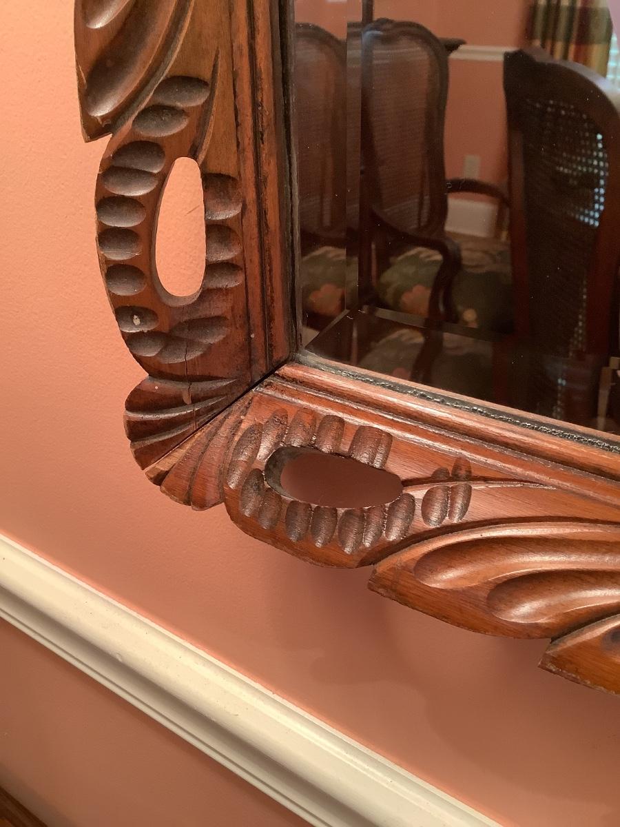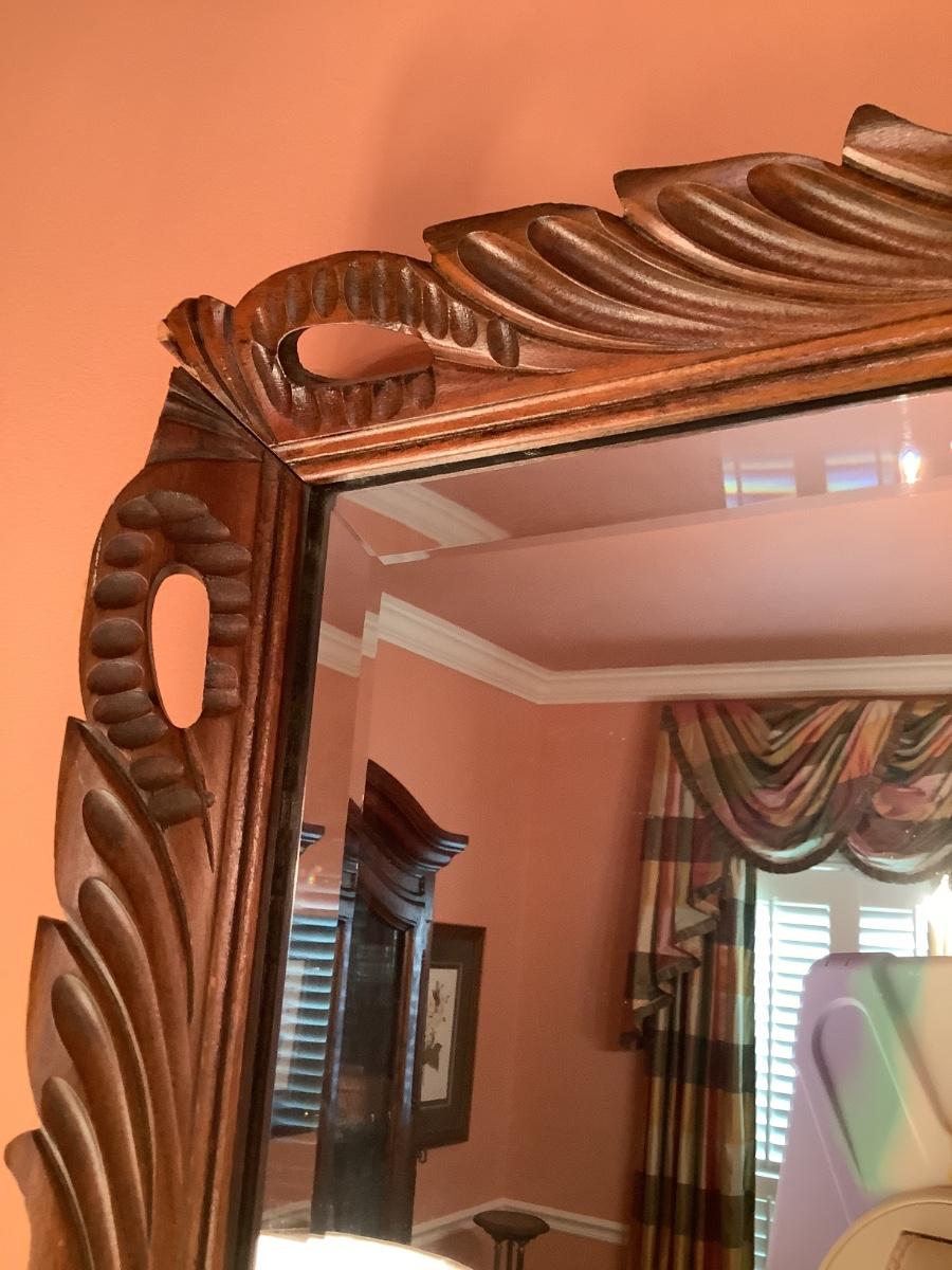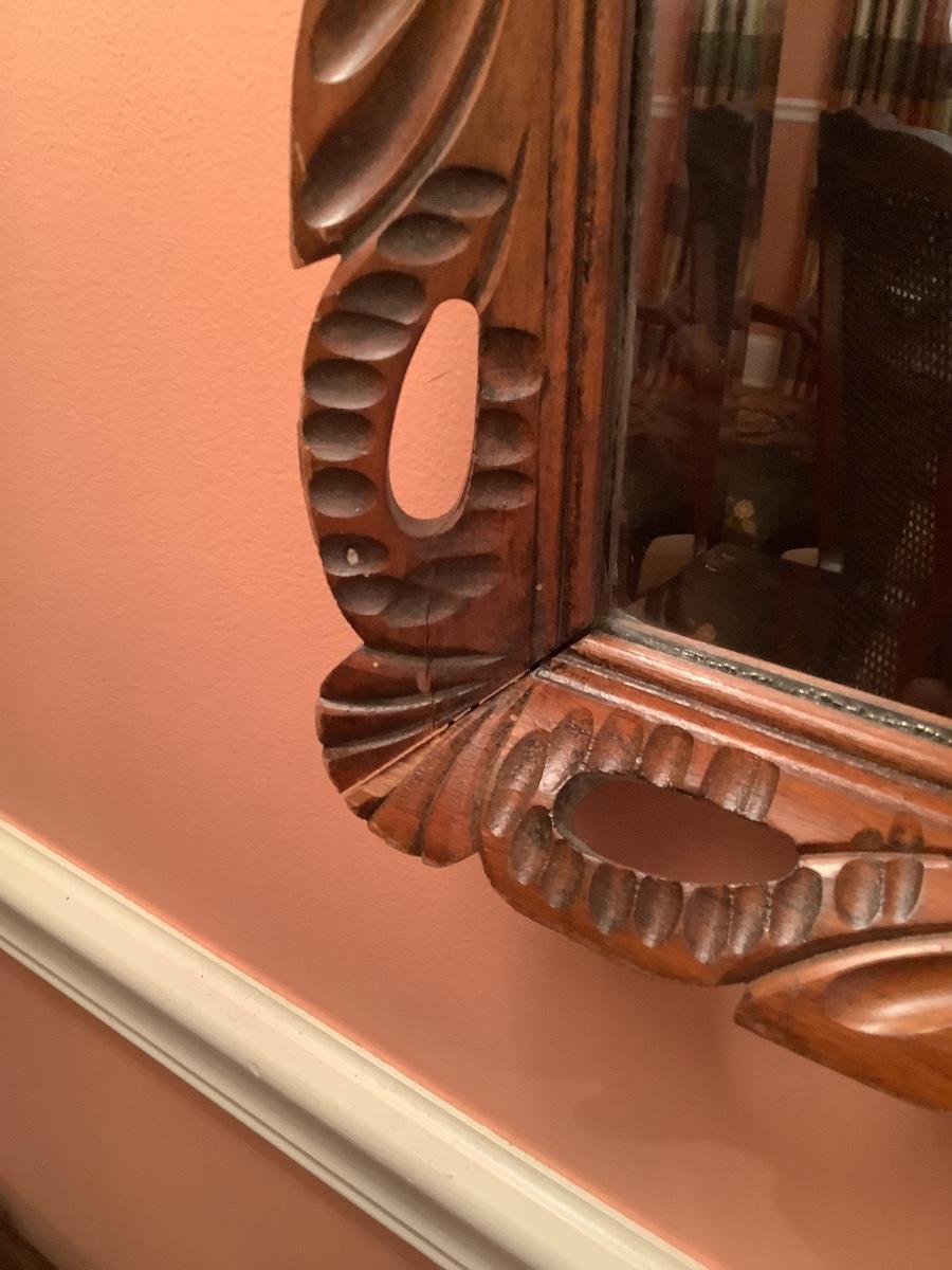 Beveled mirror with a carved wooden frame, corners are separating a bit due to age, see photos, easily fixed or kept to show age