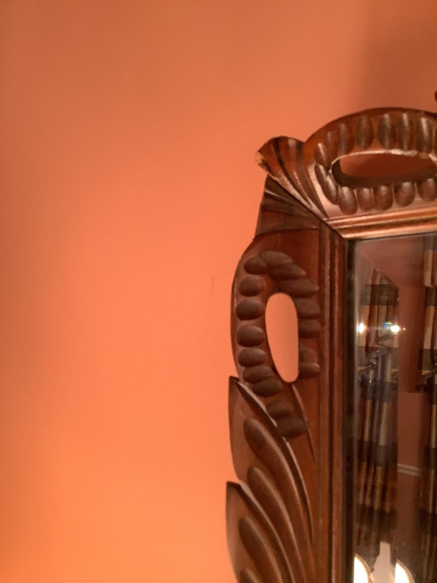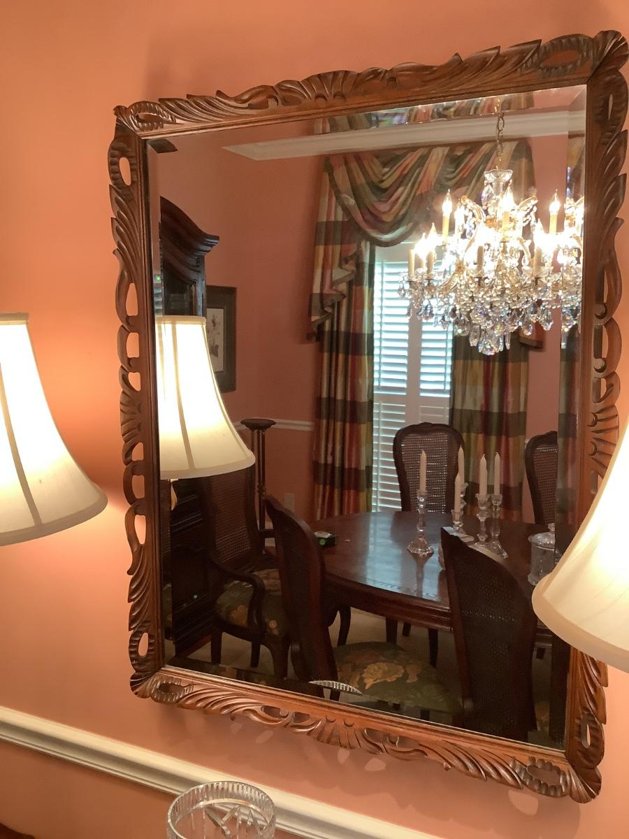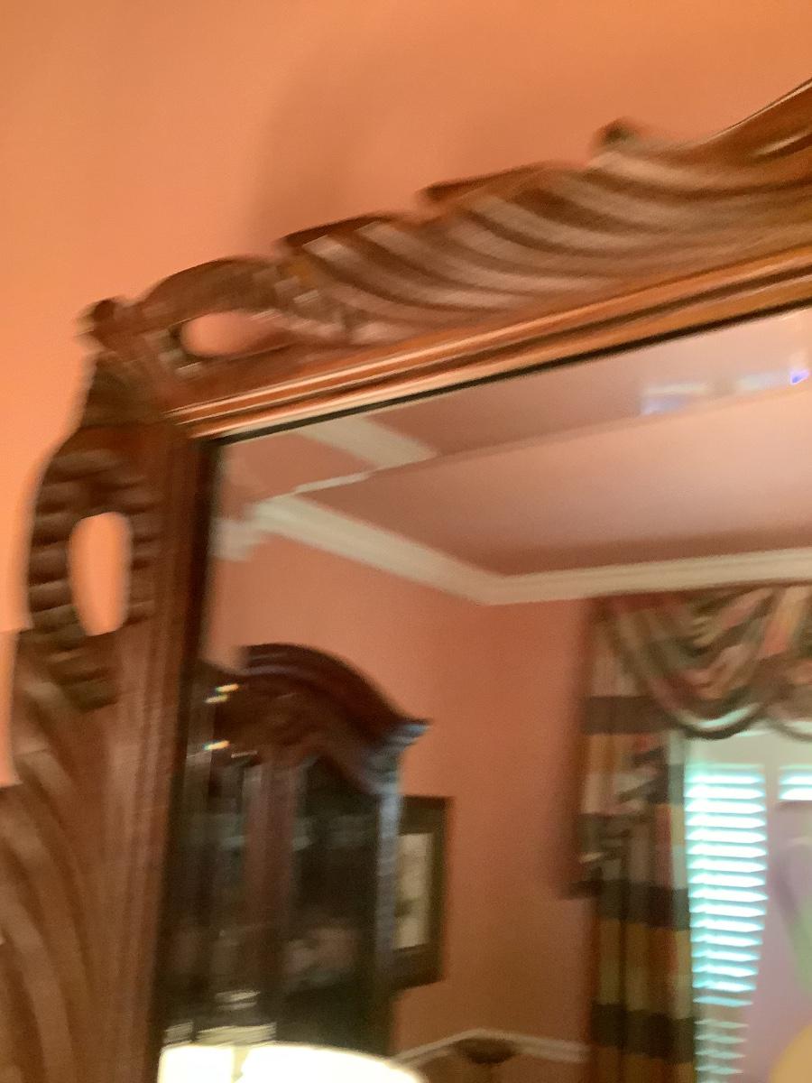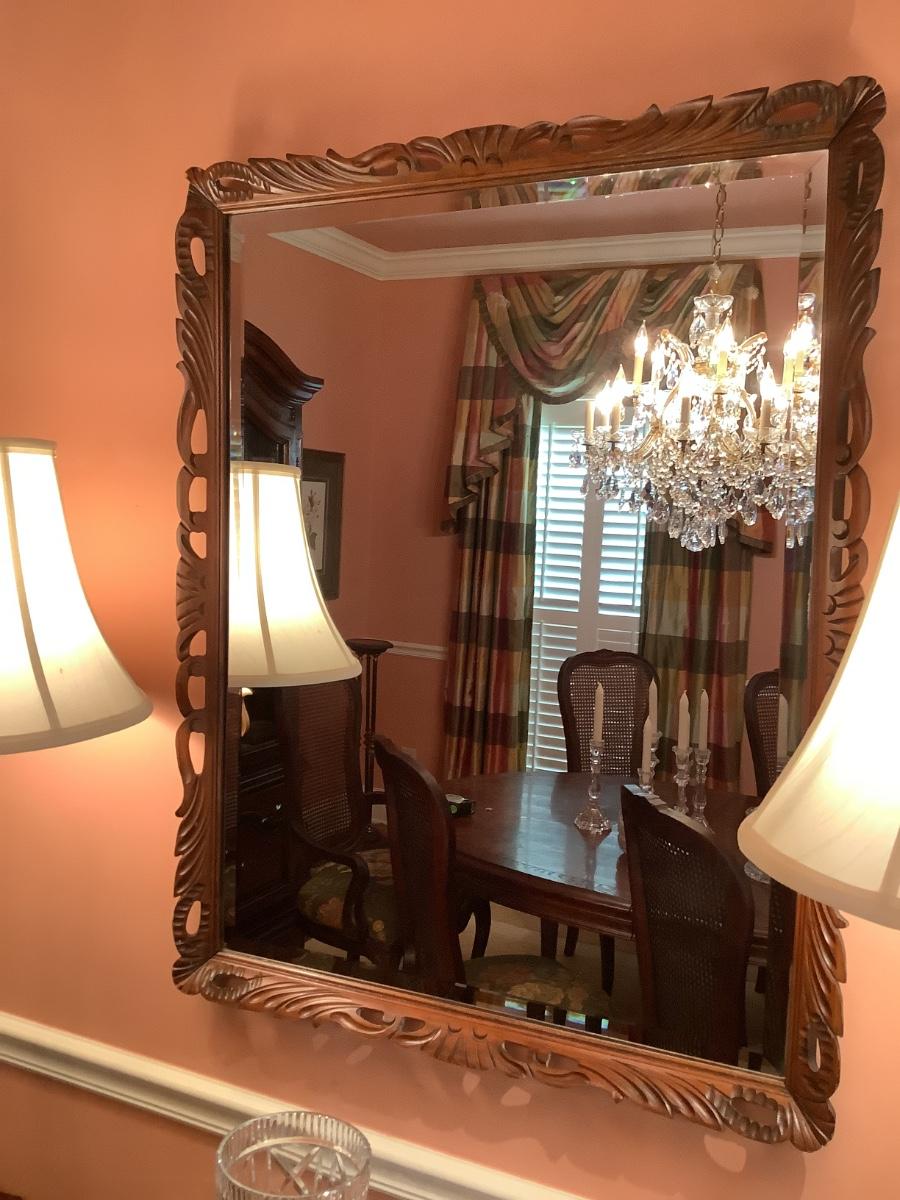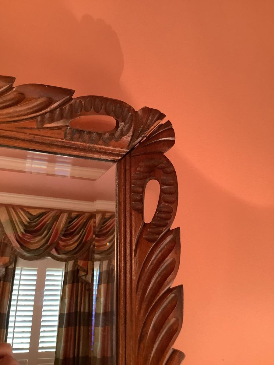 Beveled mirror with a carved wooden frame, corners are separating a bit due to age, see photos, easily fixed or kept to show age