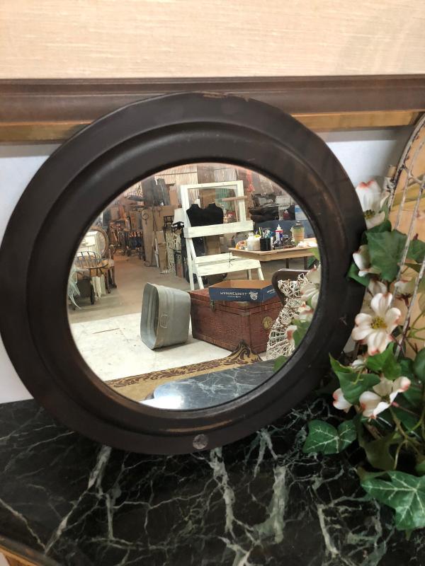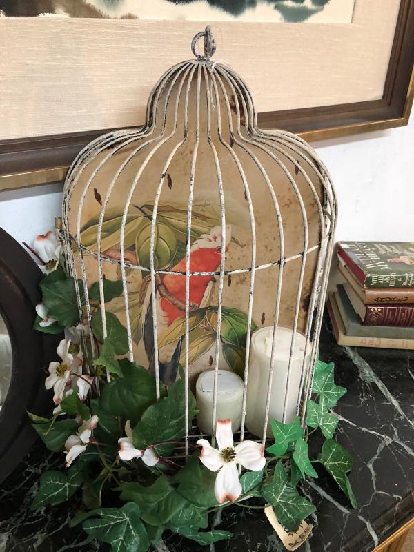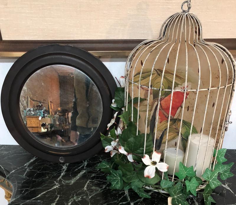 New boutique items, Ca ge is flat for wall hanging and is 19" tall, mirror is 14" in diameter.