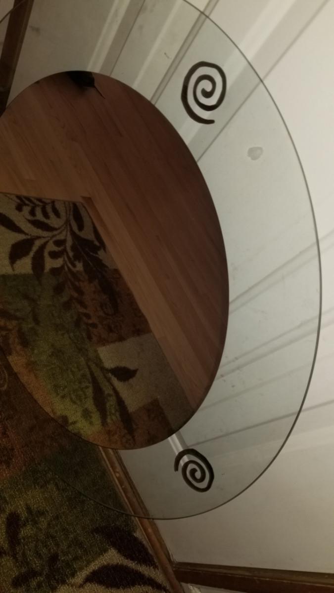 31 inches in diameter. Mirror in center. Clear glass with design in 4 places on outide