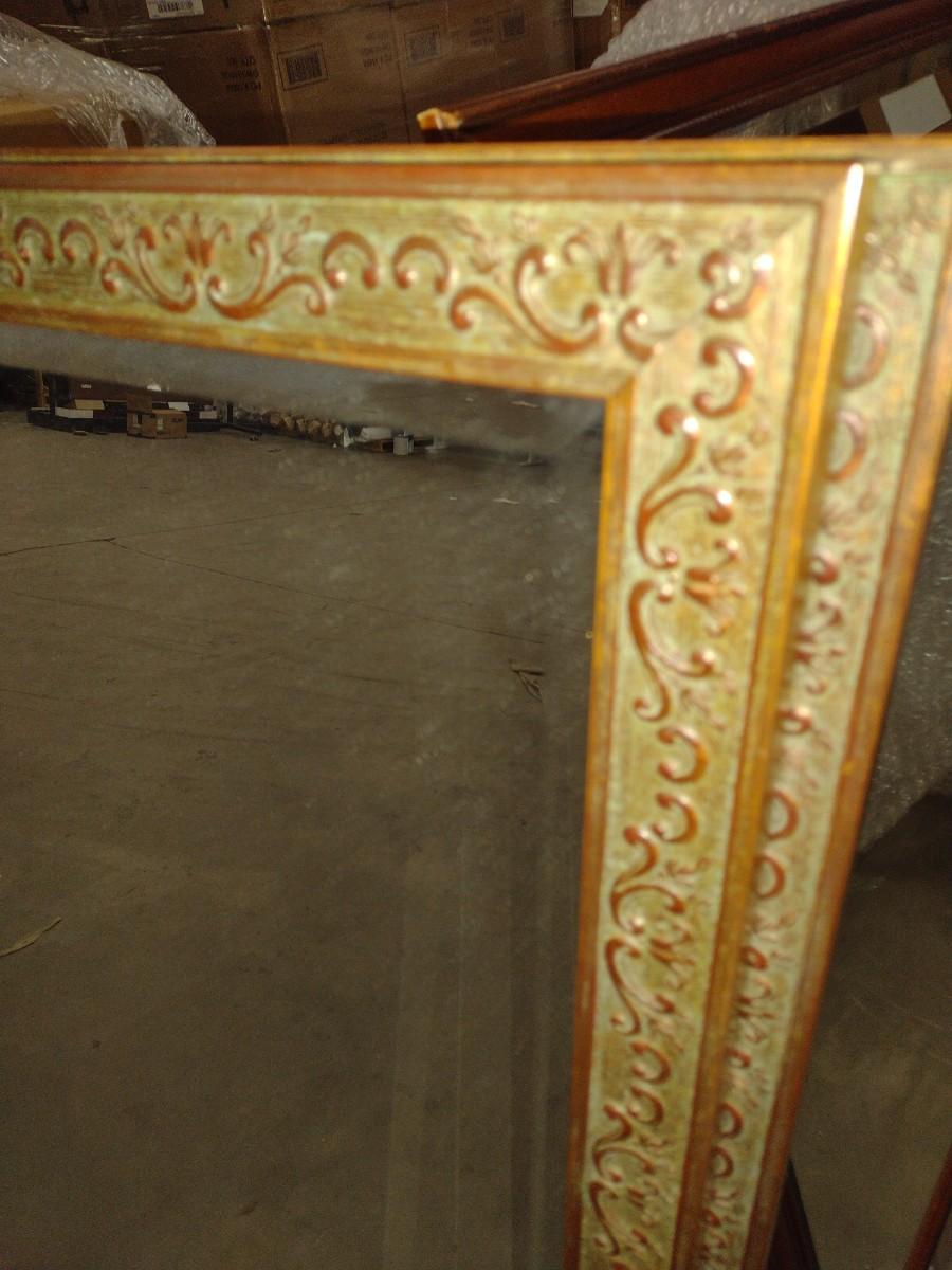 Large Beveled Glass Wall Mirror Brown with Antique Green Frame Shipping option via freight or local mover is Buyer's responsibility and expense. Buyer must have all shipping scheduled within the stated dates and times of pickup. Recommended local movers are Beaty Bros. Moving 828-201-2982 and Carolina Pack n Go 828-489-9773