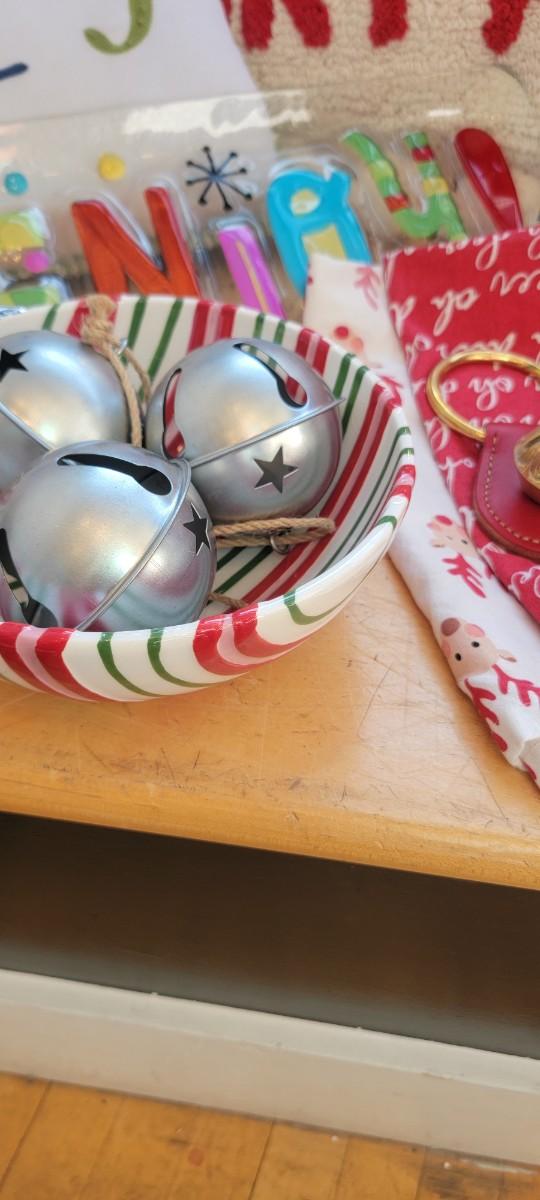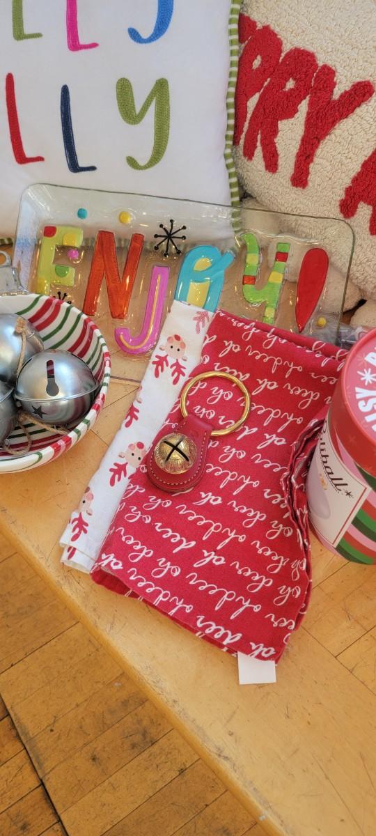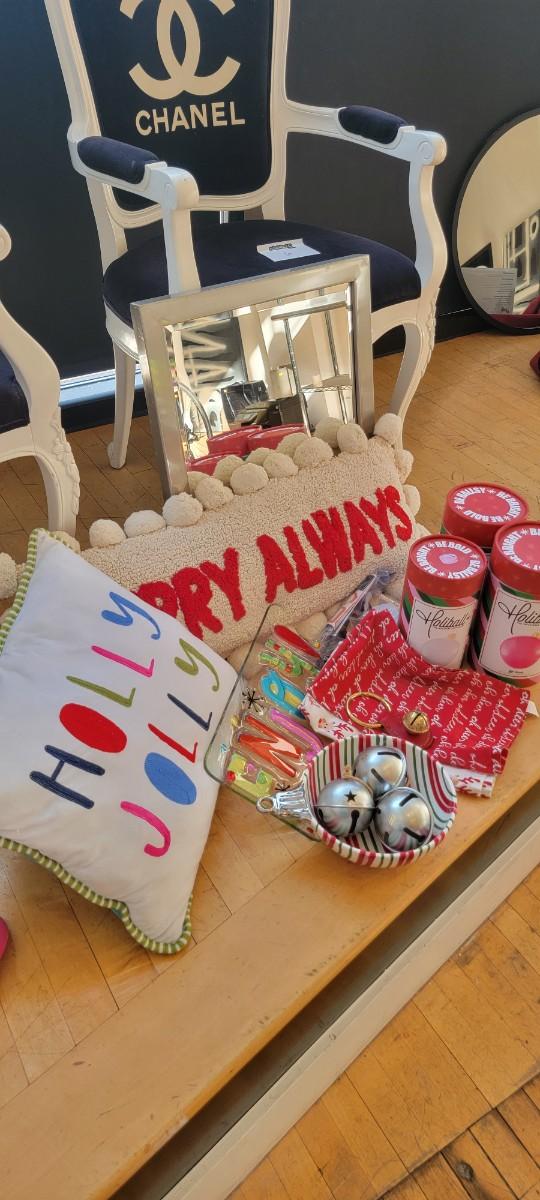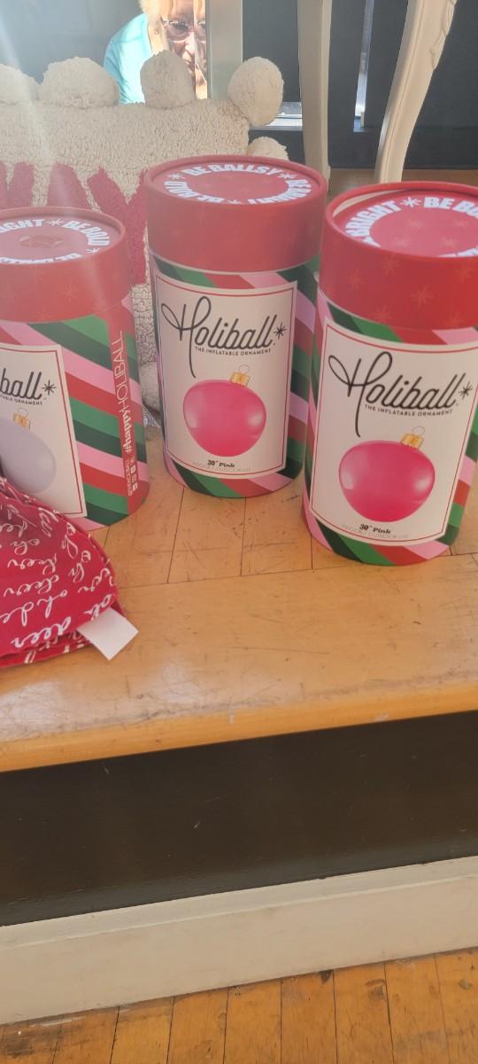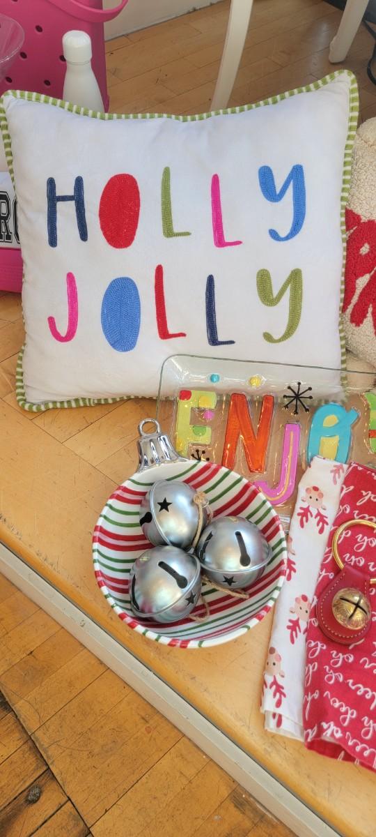 Holiday pillows, Holiball inflatable, holiday dishes.