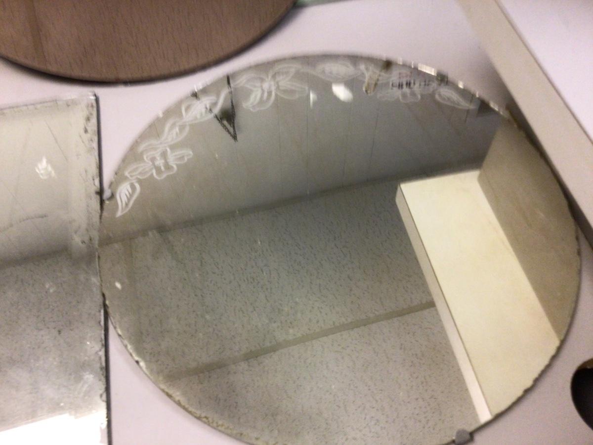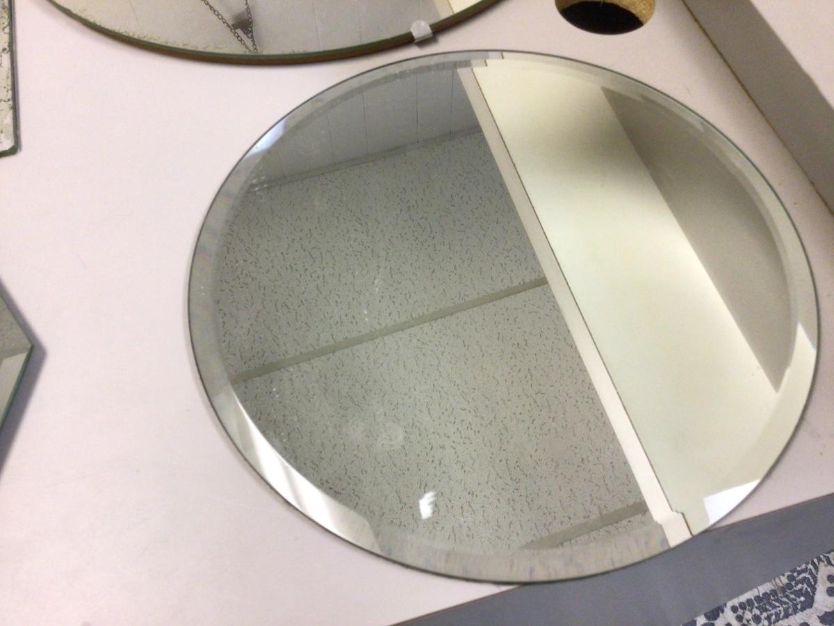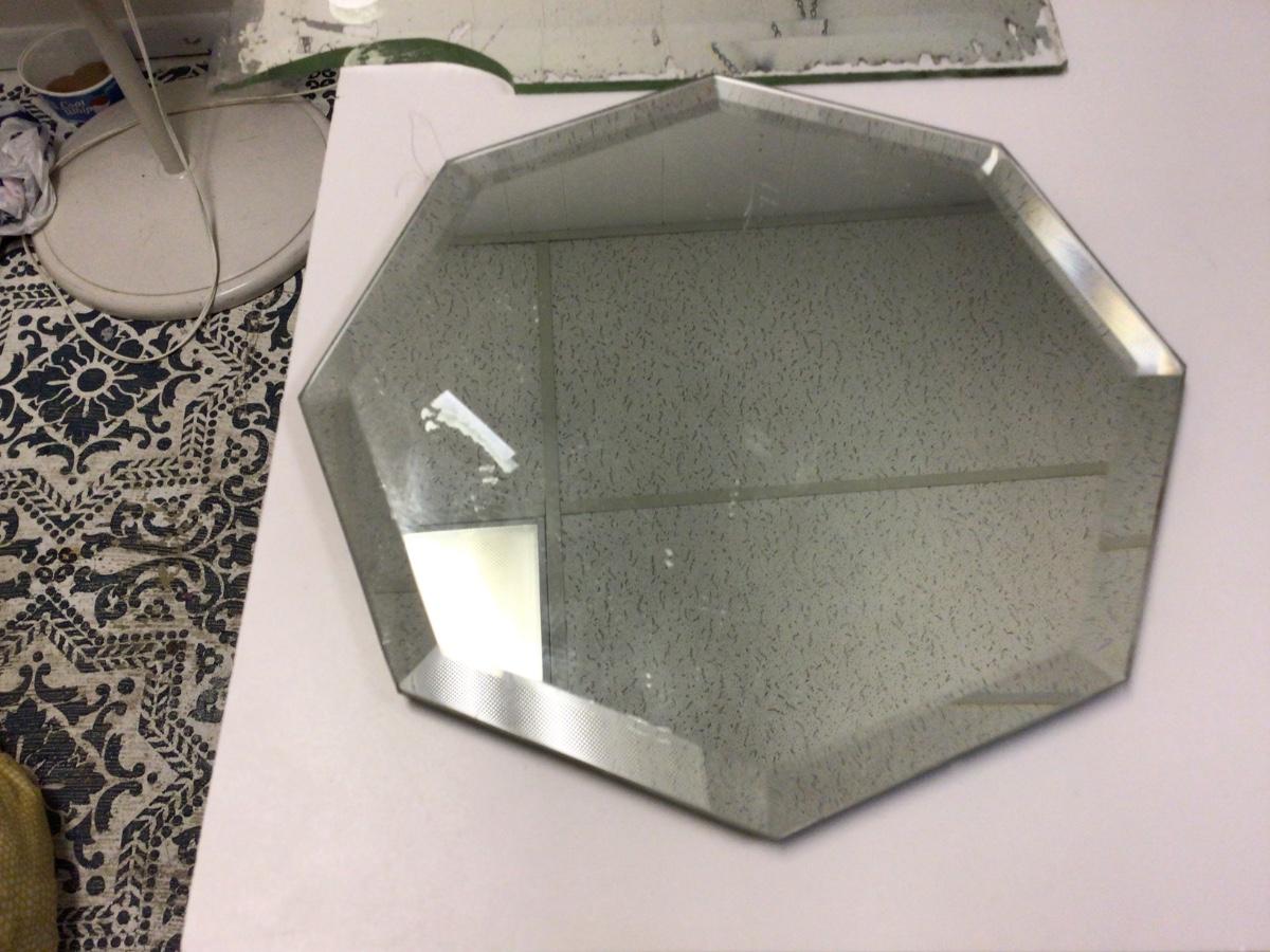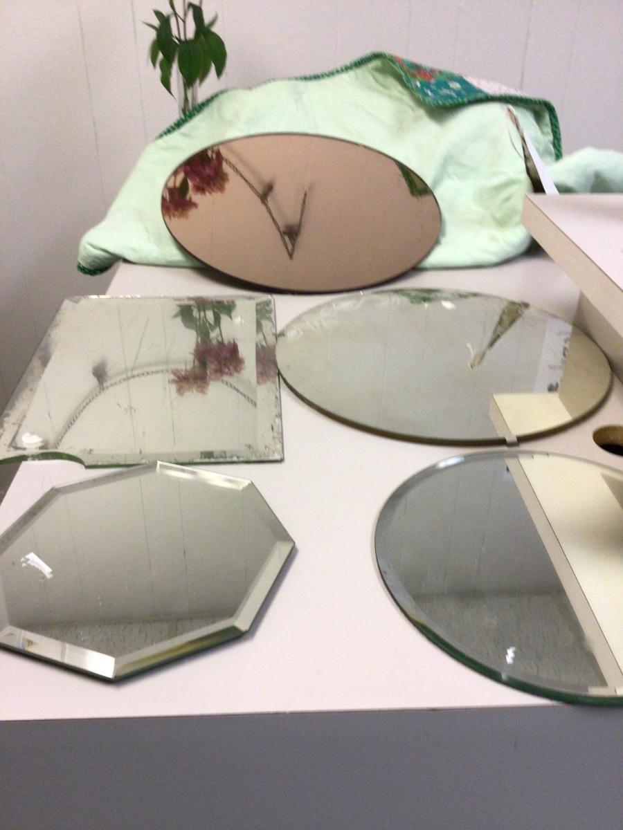 You get two smaller beveled edge round and octagons, larger round with etched design, rectangular (has damage) large round peach luster mirror.