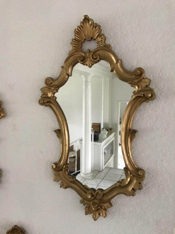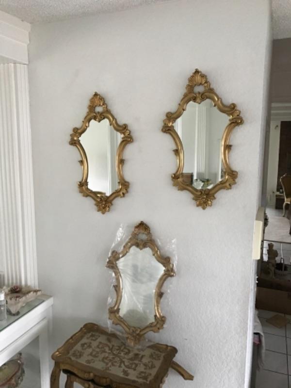 Set of 3 gold gilt Italian Rococo style wall mirrors. Add some glitz and glam to any room. Approx. 26"x15".