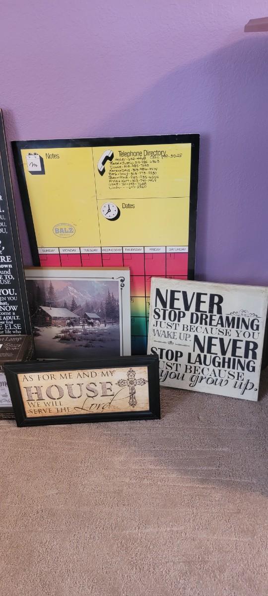 Mirror, signs, lamp