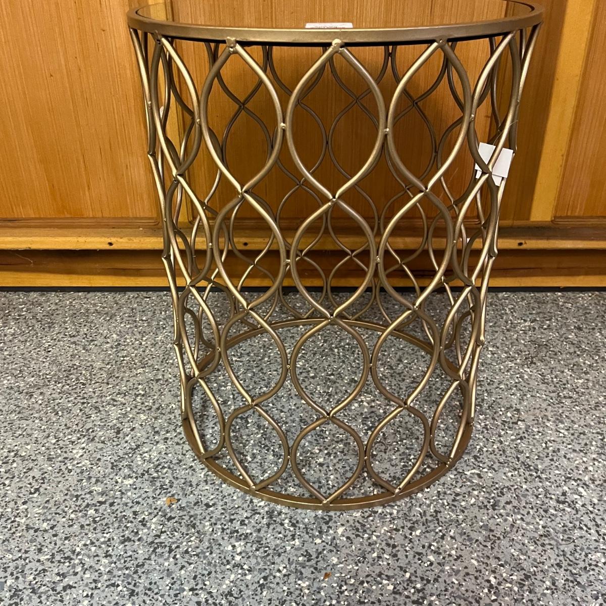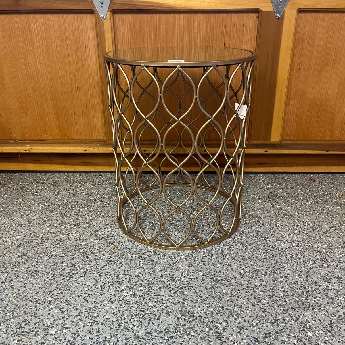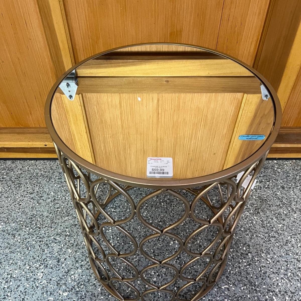 Lot includes a metal side table with a mirrored top. Table has a gold paint and it’s sticker is still attached to the mirror, it measures 17.5”D x 21.5” H.