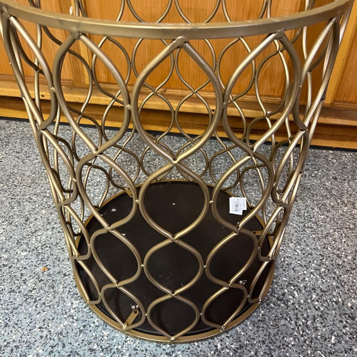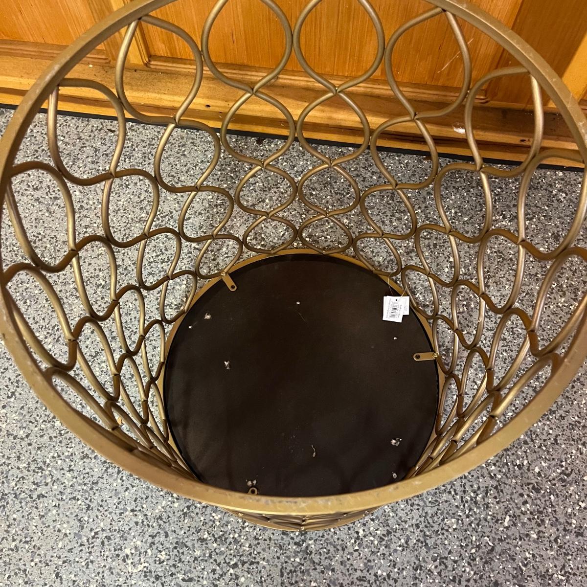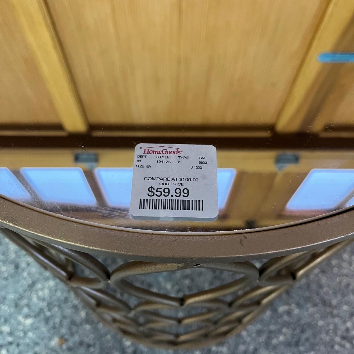 Lot includes a metal side table with a mirrored top. Table has a gold paint and it’s sticker is still attached to the mirror, it measures 17.5”D x 21.5” H.