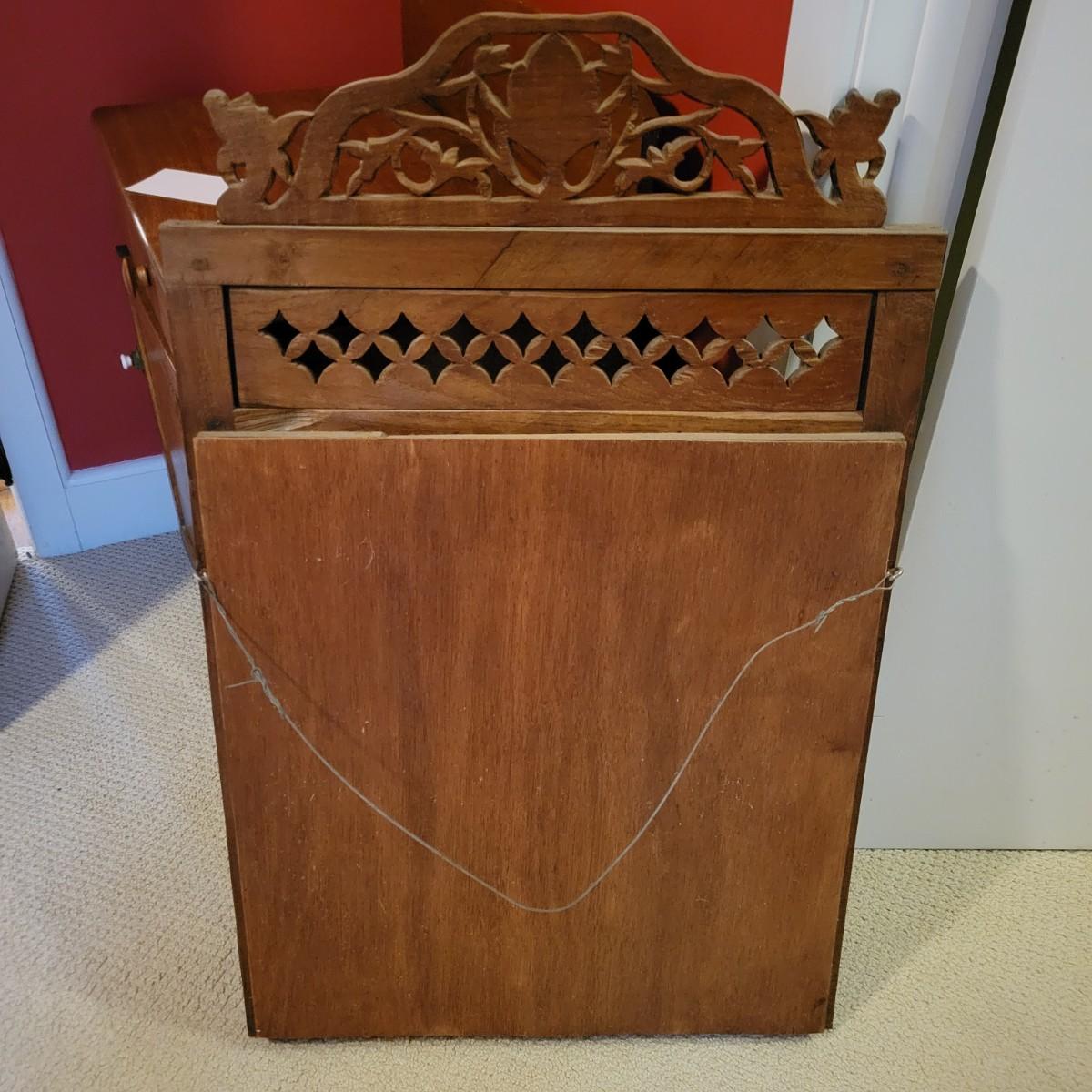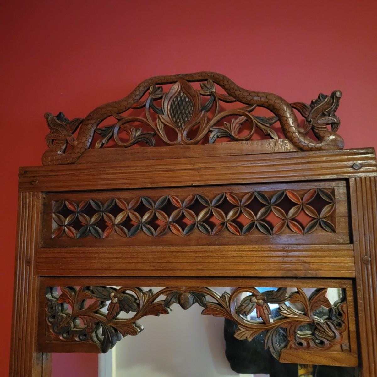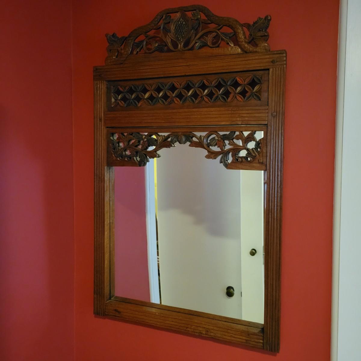 A mirror with carved wooden frame that appears to be antique. It measures approximately 24.5" x 1.5" x 38.5"H. Shipping available. Shipping certain items can be costly. We suggest contacting our preferred local shipping provider, Postage Express, with dimensions and getting an estimate before bidding: (828) 670-5501 or postageexpress@yahoo.com.