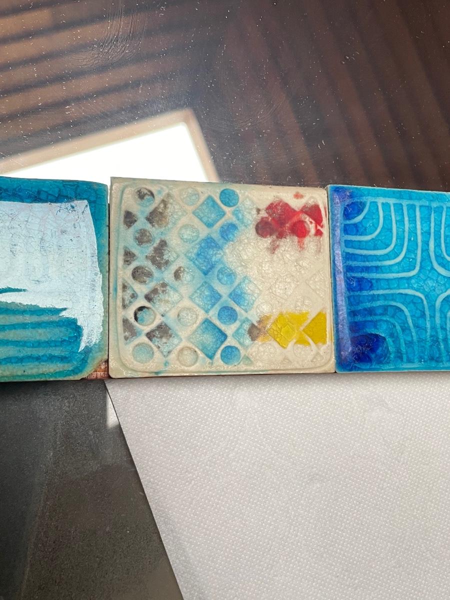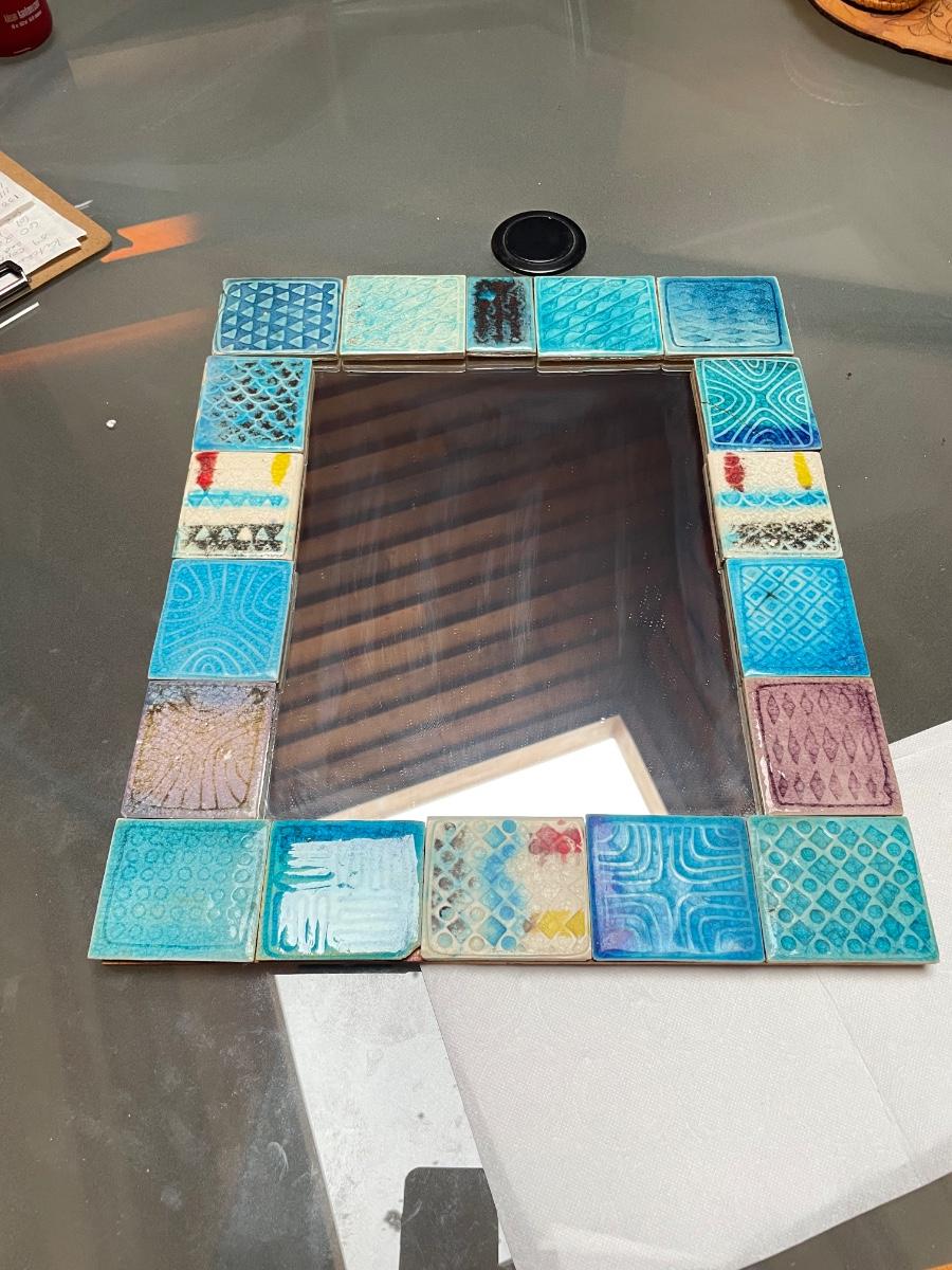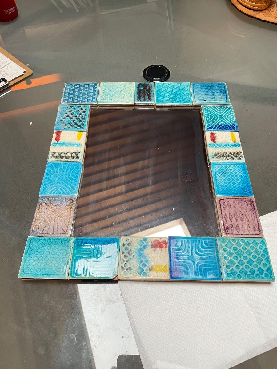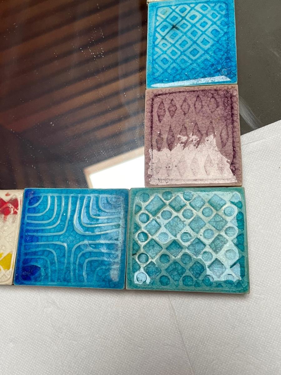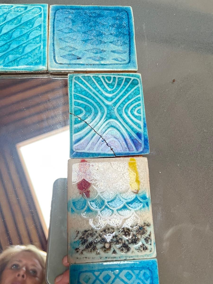 This is a mirror framed with colorful ceramic art tiles. One tile is cracked as shown.
