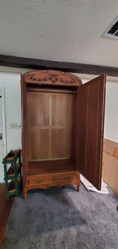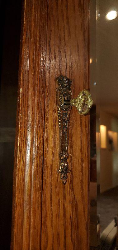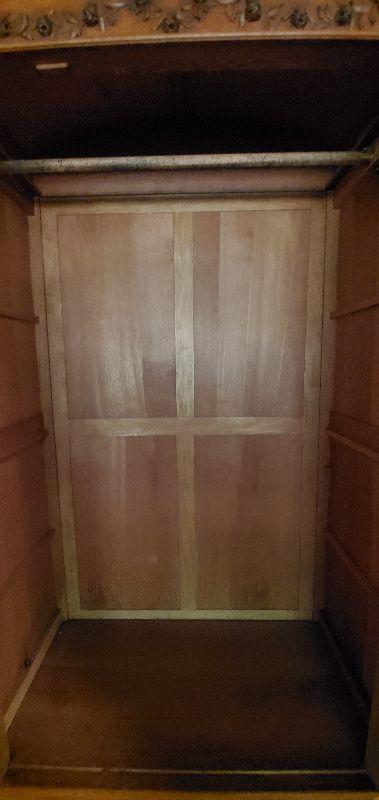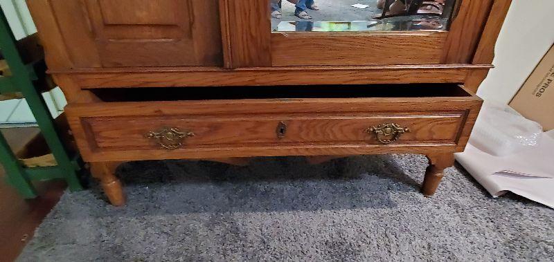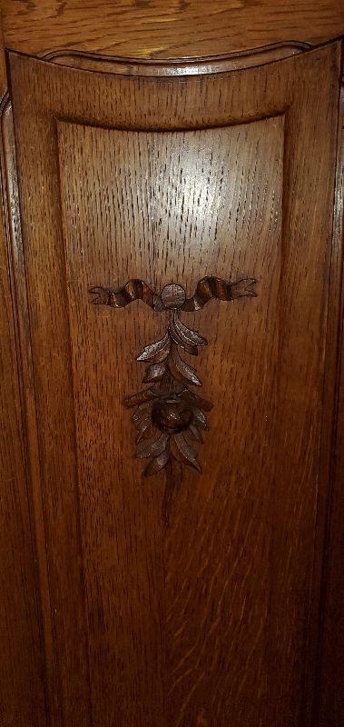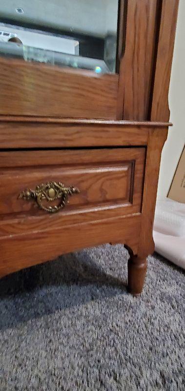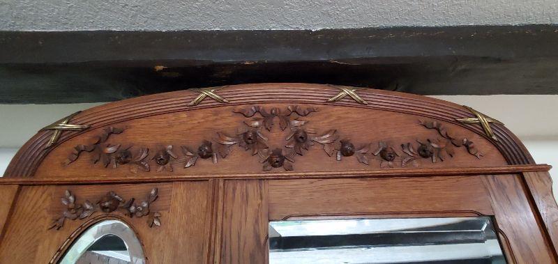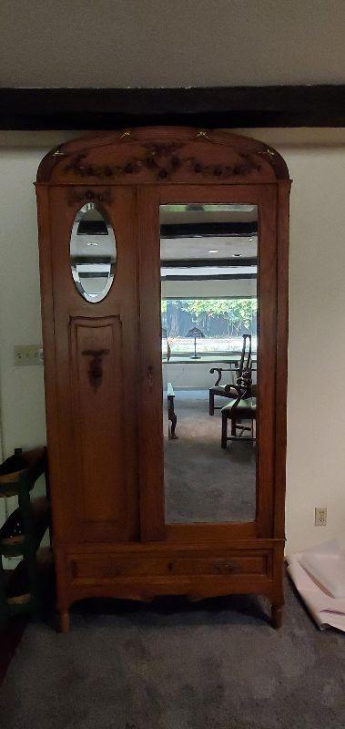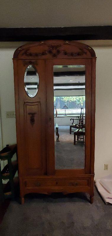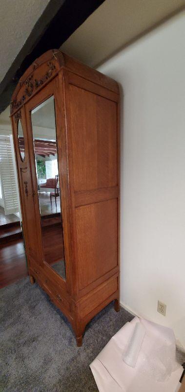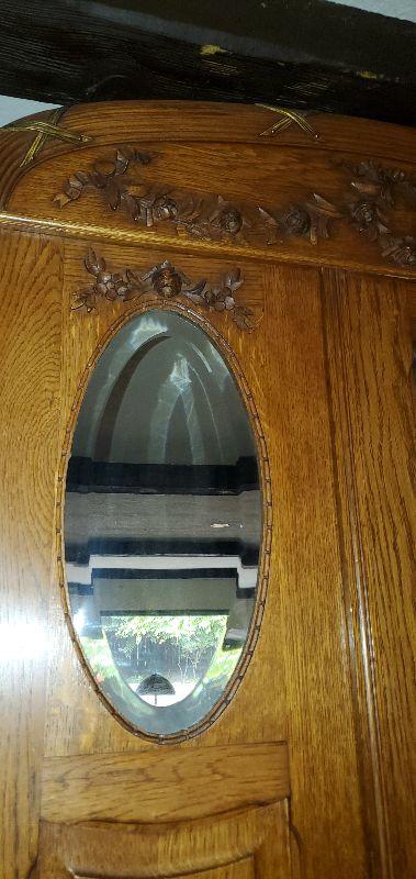 Mirrored oak armoire in excellent condition. Beautifully carved detail throughout with original solid brass drawer pulls and key. This sturdy piece measures, 87" tall, 41" wide, and 20.5" deep.