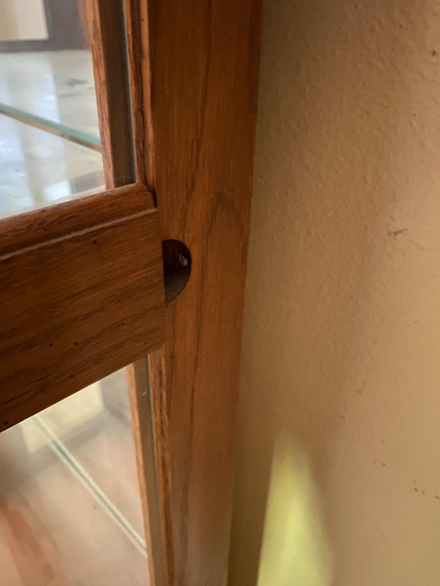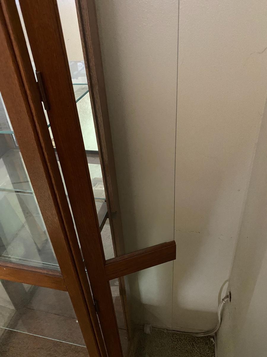 Glass curio display cabinet. Mirrored back, lighted, glass shelves. Door is on the right side. Three adjustable shelves. About 6.5’ tall and 24” wide.
