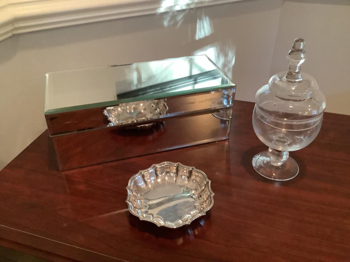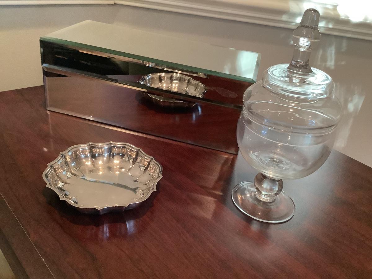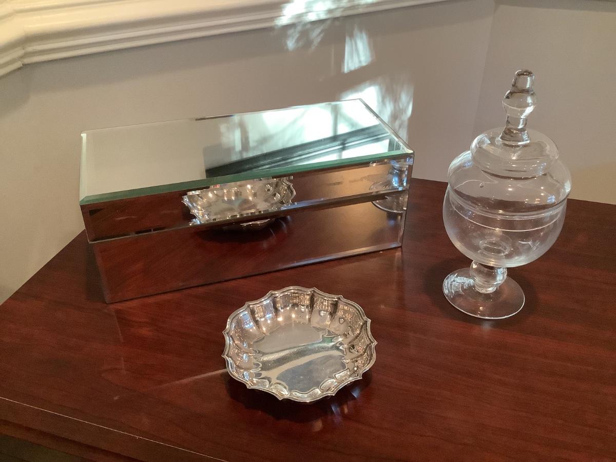 Mirrored box 6"H 14"L 6"W, candy dish, small silver tray