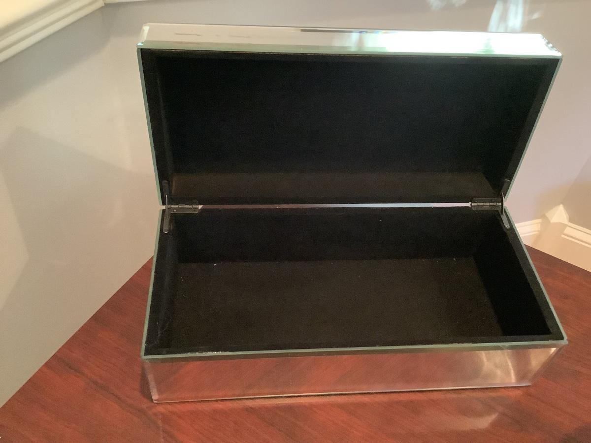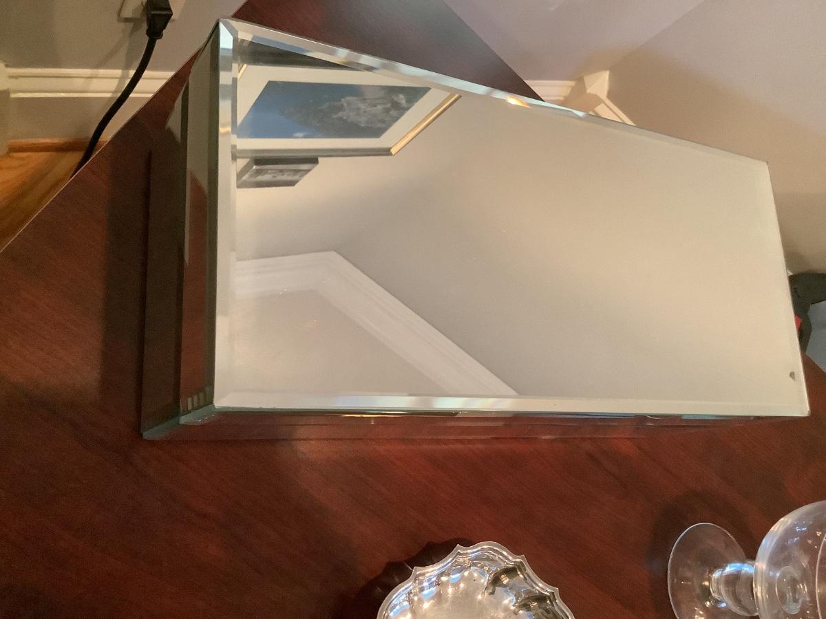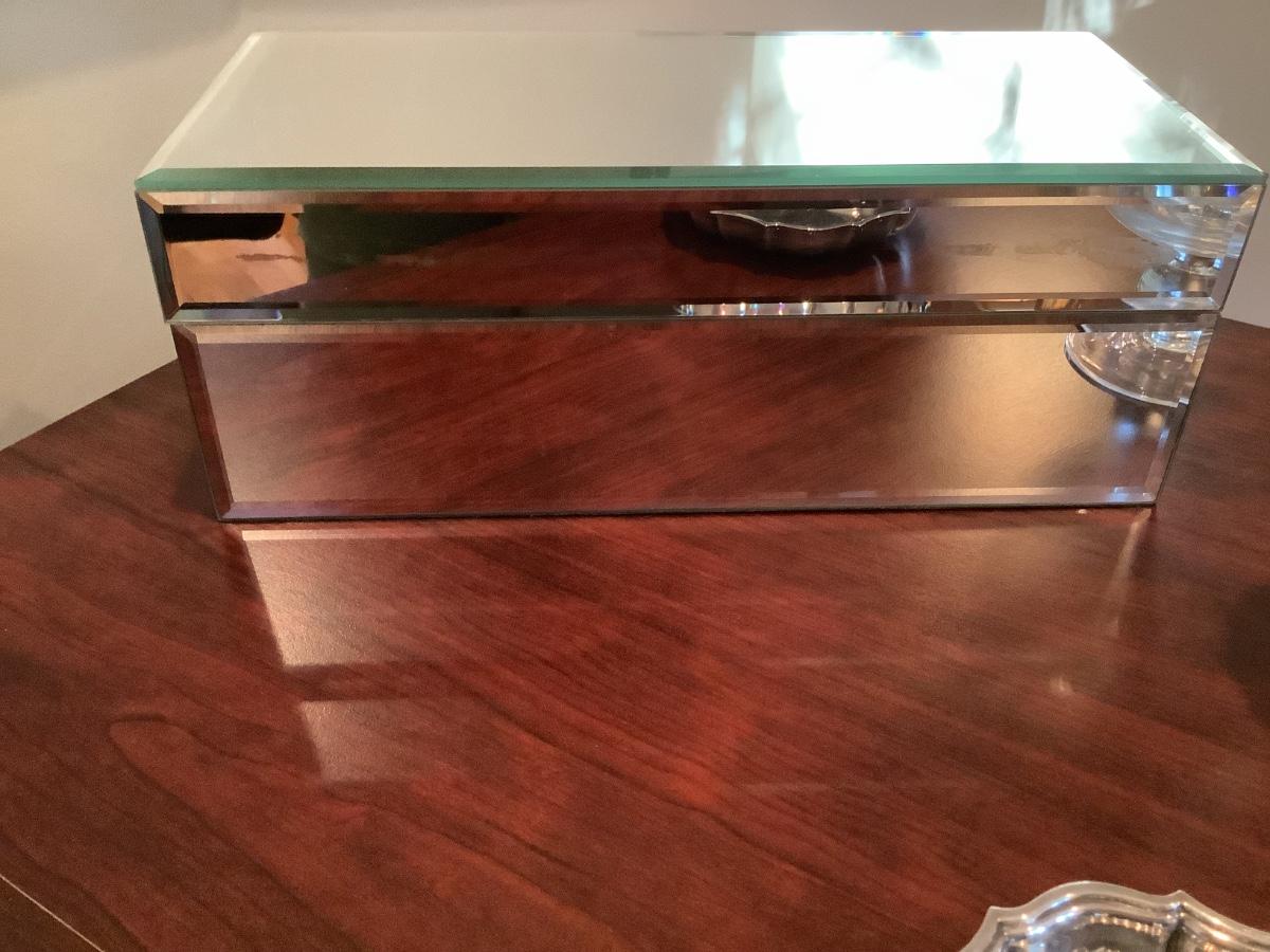 Mirrored box 6"H 14"L 6"W, candy dish, small silver tray