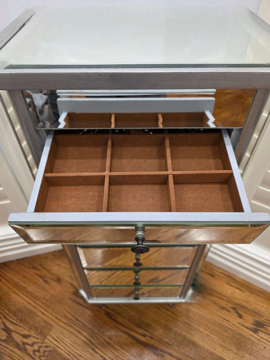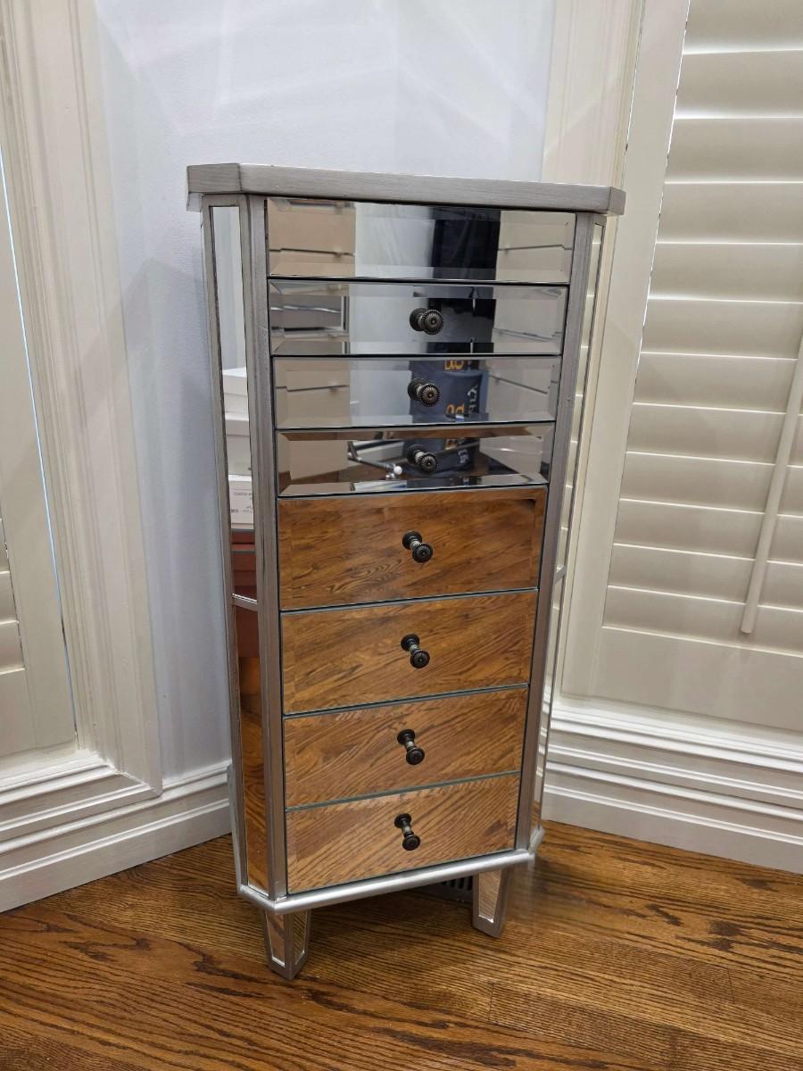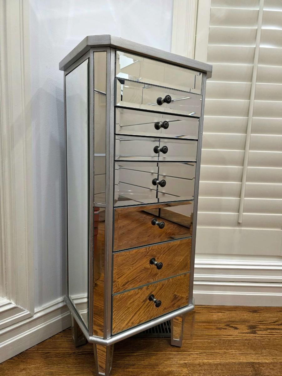 This gorgeous, mirrored jewelry armoire will make a perfect gift for the holidays! The top lifts, the sides open and it has 7 drawers of varying sizes to accommodate all kinds of treasured jewels. This piece is in great condition and measures 32"H x 18"W x 12.5"D.