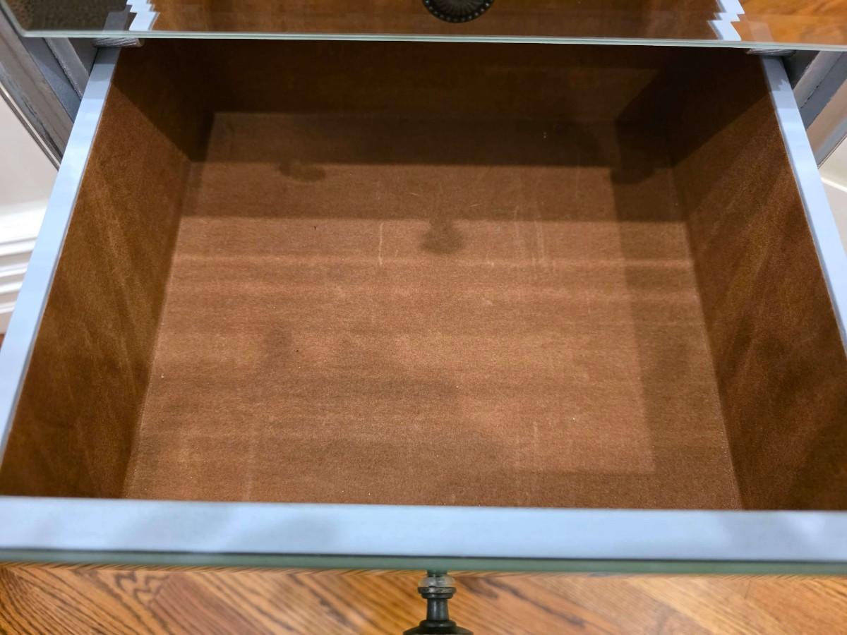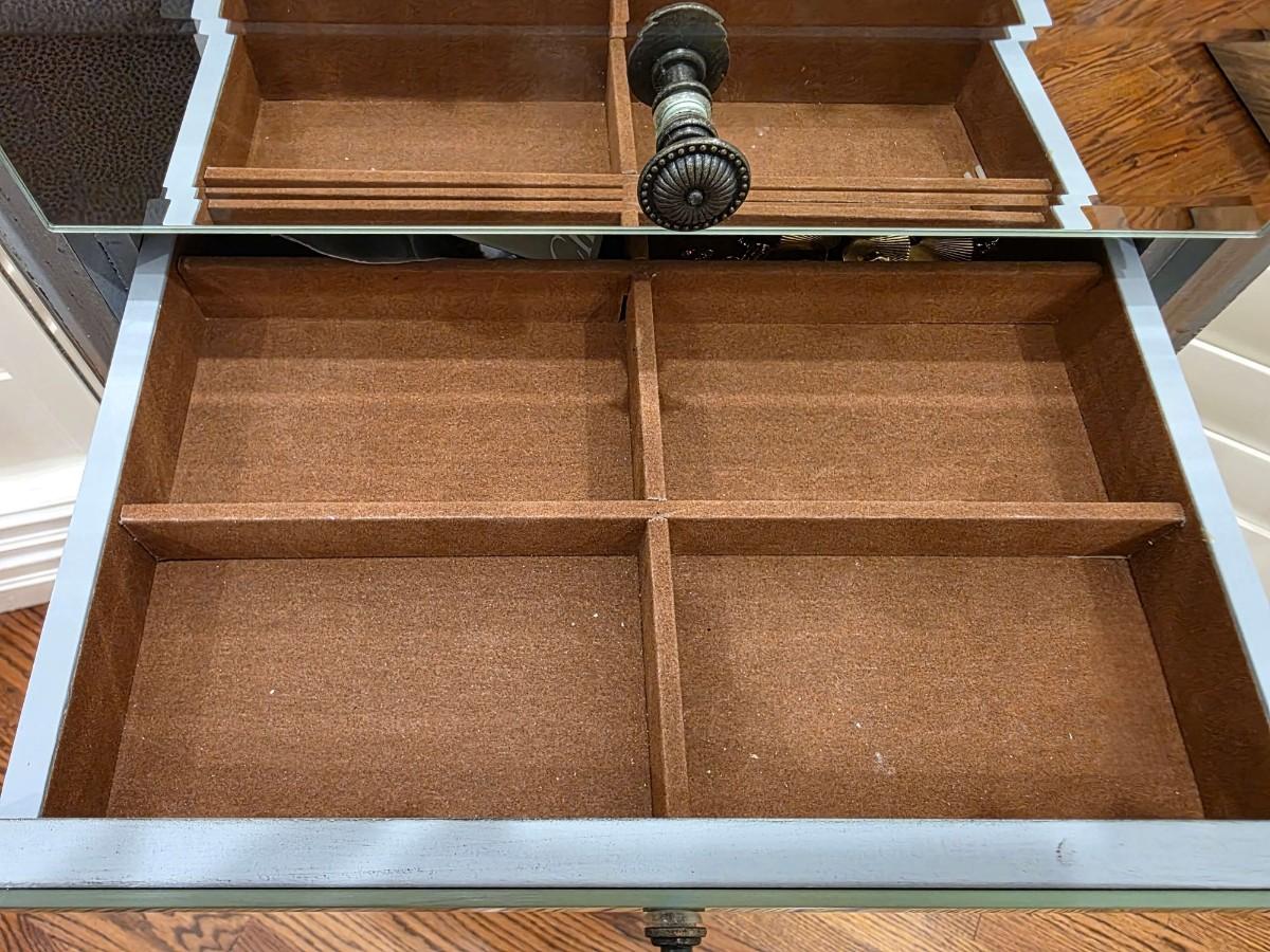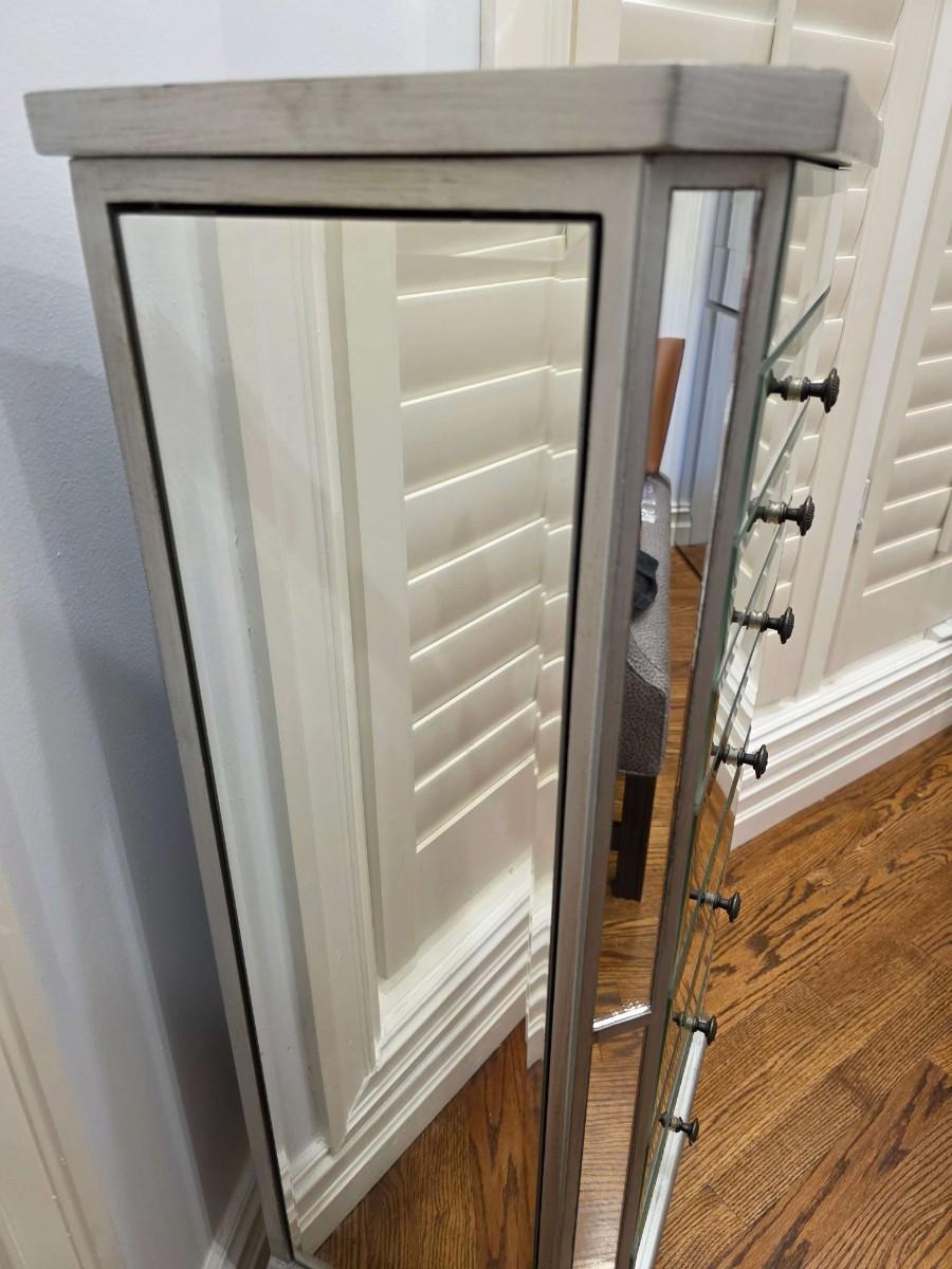 This gorgeous, mirrored jewelry armoire will make a perfect gift for the holidays! The top lifts, the sides open and it has 7 drawers of varying sizes to accommodate all kinds of treasured jewels. This piece is in great condition and measures 32"H x 18"W x 12.5"D.
